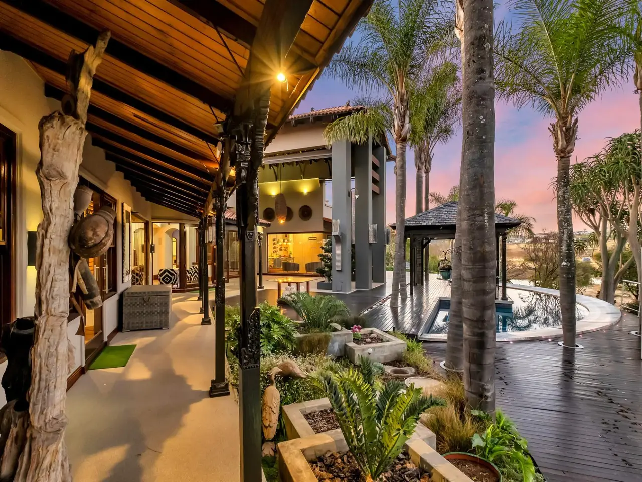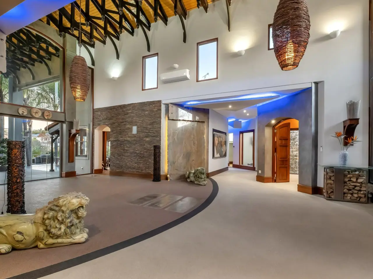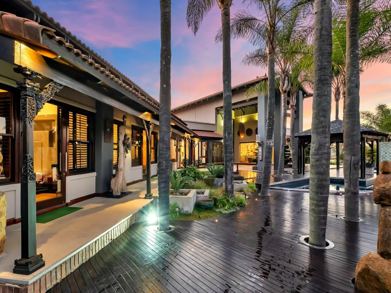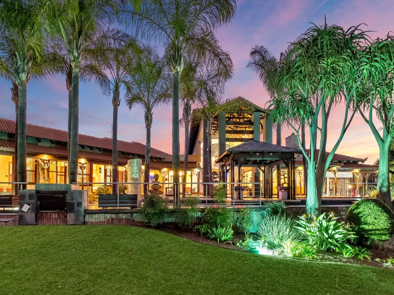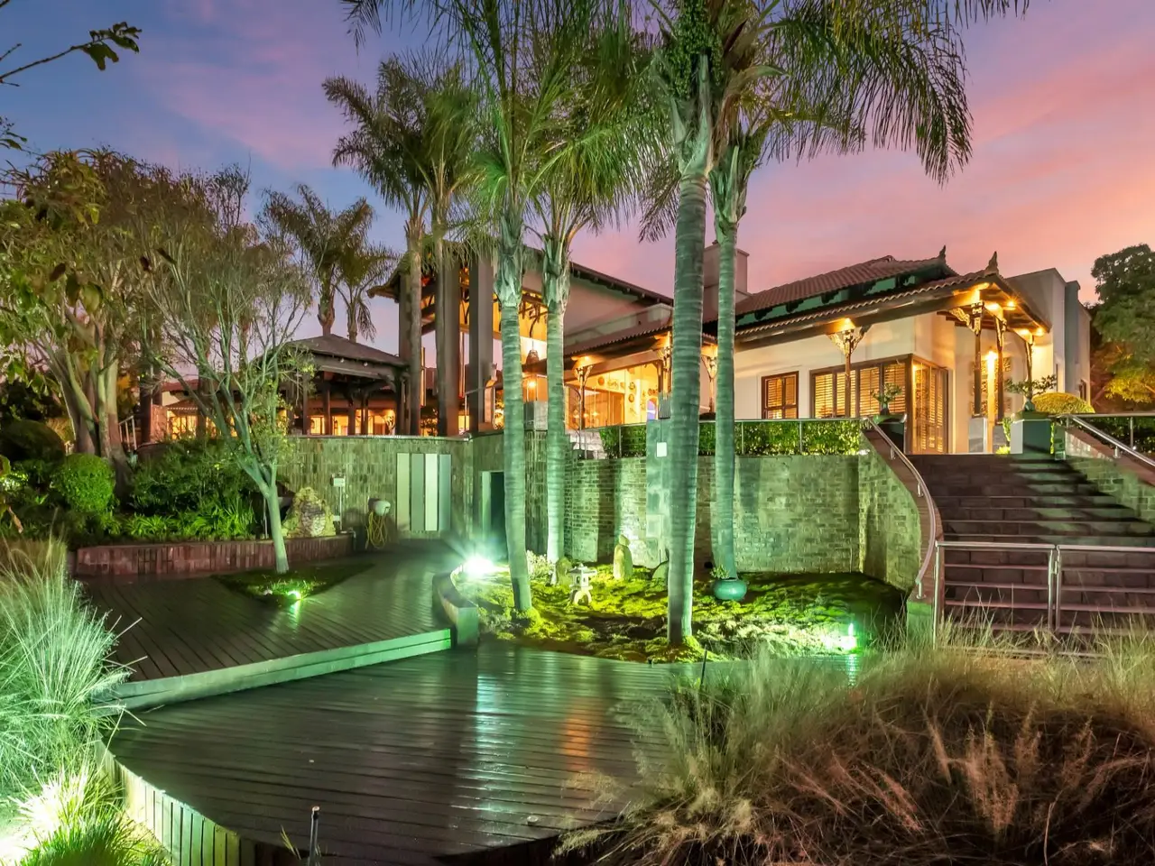 Step into a world of tranquil sophistication with this exceptional and authentic Balinese-inspired residence, where every detail evokes the serenity and artistry where every detail revokes serenity. Set a sprawling stand that rolls gently down towards the river, this expansive home offers a rare combination of privacy, indulgent finishes, and resort-style living. A dramatic double-volume entrance, framed by soaring dark wood beams, sets the tone for this remarkable property. Hand-carved Balinese pillars, an ornate front door, and curated artefacts create an immersive experience of Eastern-inspired luxury from the moment you arrive. The four exisite bedrooms and fifth as part of a cottage are all 5 star accommodation. The main en suite is a private sanctuary, thoughtfully set apart from the rest of the home. Featuring a built-in oversized bed beneath a detailed open-beam ceiling, fireplace, and a luxurious bathroom with Jacuzzi bath and shower, this retreat flows effortlessly to a secluded patio through expansive stacker doors. Two additional en suite bedrooms boast floor-to-ceiling glass walls with uninterrupted views of the pool and entertainment area. A fourth guest bedroom offers quiet seclusion, while the fifth bedroom suite is a fully independent studio-style retreatGÇöideal for guests or as a private home office, with its own exterior access. The formal lounge, framed by floor-to-ceiling glass, gazes out onto an indigenous water feature, infusing natural calm into the heart of the home. A private cinema room and a spacious games room with adjoining cellar provide multiple areas for refined relaxation and entertaining on a grand scale. The resort-style entertainment area is anchored by a sprawling swimming pool and a serene covered oriental gazebo, perfect for al fresco dining or sunset lounging. Lush landscaped gardens extend down to the river, offering a setting of rare natural beauty and peace. Additional Features GÇó 6 Garages GÇó Multiple fireplaces throughout GÇó Open frontage river access GÇó Large solar power inverter system GÇó Numerous water tanks GÇó Estate-level privacy and security This home is more than just a residenceGÇöit's an experience. Perfect for the discerning buyer seeking a one-of-a-kind lifestyle, this masterpiece offers the ultimate in elegance, privacy, and timeless charm.