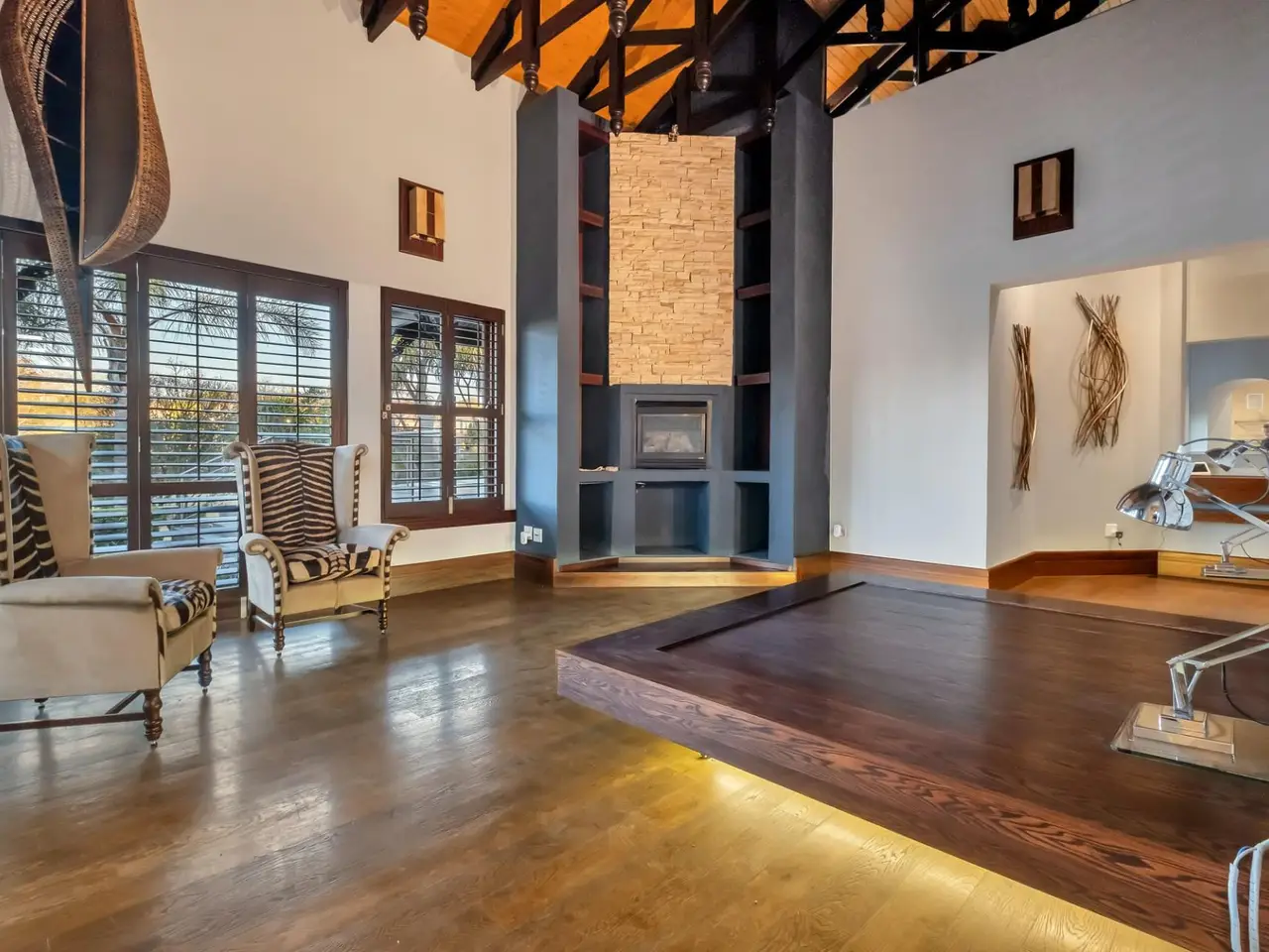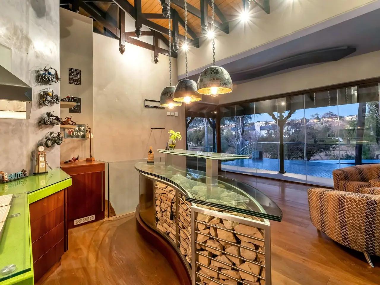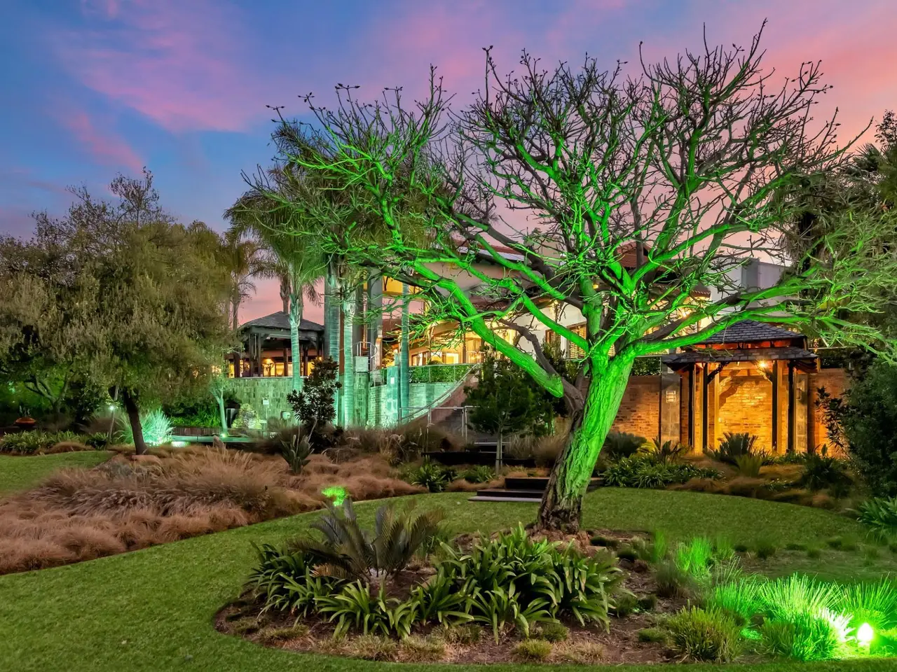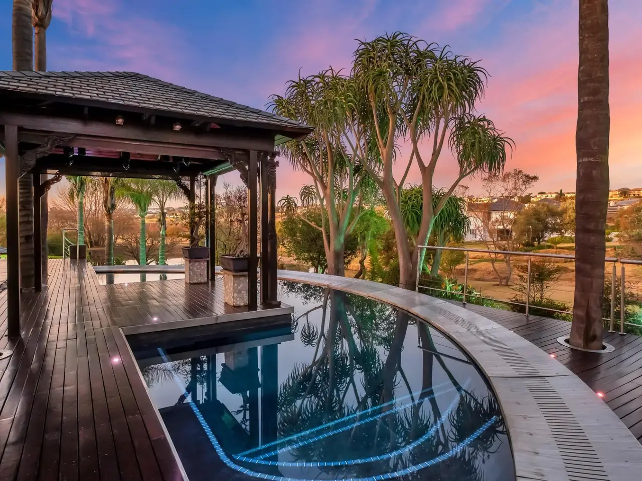 Step into a world of tranquil sophistication with this exceptional and authentic Balinese-inspired residence, where every detail evokes the serenity and artistry where every detail revokes serenity. Set a sprawling stand that rolls gently down towards the river, this expansive home offers a rare combination of privacy, indulgent finishes, and resort-style living. A dramatic double-volume entrance, framed by soaring dark wood beams, sets the tone for this remarkable property. Hand-carved Balinese pillars, an ornate front door, and curated artefacts create an immersive experience of Eastern-inspired luxury from the moment you arrive. The four exisite bedrooms and fifth as part of a cottage are all 5 star accommodation. The main en suite is a private sanctuary, thoughtfully set apart from the rest of the home. Featuring a built-in oversized bed beneath a detailed open-beam ceiling, fireplace, and a luxurious bathroom with Jacuzzi bath and shower, this retreat flows effortlessly to a secluded patio through expansive stacker doors. Two additional en suite bedrooms boast floor-to-ceiling glass walls with uninterrupted views of the pool and entertainment area. A fourth guest bedroom offers quiet seclusion, while the fifth bedroom suite is a fully independent studio-style retreatGÇöideal for guests or as a private home office, with its own exterior access. The formal lounge, framed by floor-to-ceiling glass, gazes out onto an indigenous water feature, infusing natural calm into the heart of the home. A private cinema room and a spacious games room with adjoining cellar provide multiple areas for refined relaxation and entertaining on a grand scale. The resort-style entertainment area is anchored by a sprawling swimming pool and a serene covered oriental gazebo, perfect for al fresco dining or sunset lounging. Lush landscaped gardens extend down to the river, offering a setting of rare natural beauty and peace. Additional Features GÇó 6 Garages GÇó Multiple fireplaces throughout GÇó Open frontage river access GÇó Large solar power inverter system GÇó Numerous water tanks GÇó Estate-level privacy and security This home is more than just a residenceGÇöit's an experience. Perfect for the discerning buyer seeking a one-of-a-kind lifestyle, this masterpiece offers the ultimate in elegance, privacy, and timeless charm.