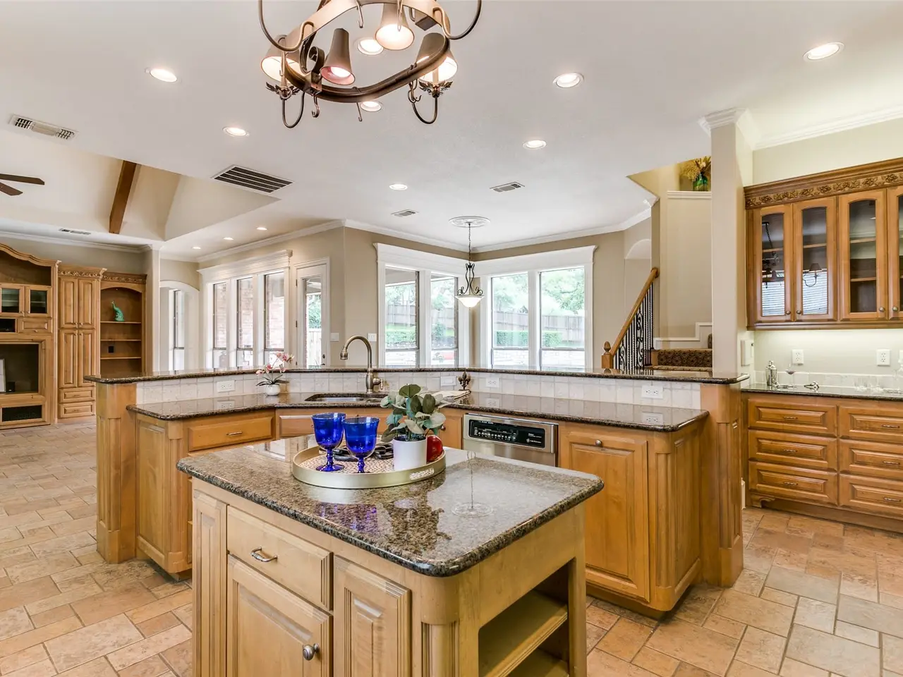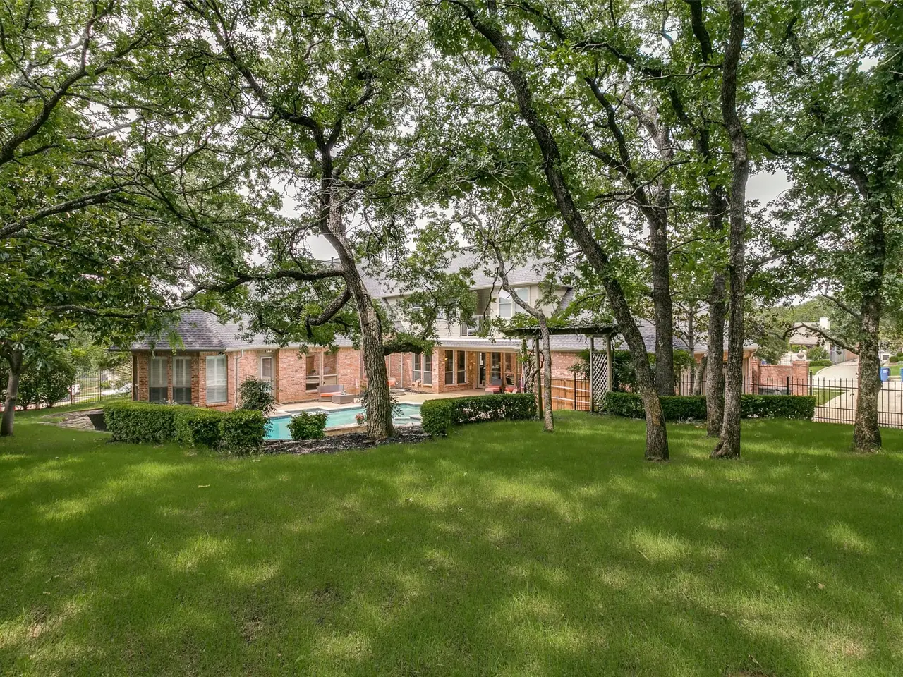 This gorgeous custom showstopper is nestled on one of the best lots in the highly desirable Wildwood neighborhood. Architectural Elegance boasts inside & out! Embark on a grand entrance, & a foyer that makes an unforgettable statement with natural light & sweeping double stairs. The stunning arches throughout the home add timeless charm & seamless flow to the luxurious formal living room with 18-foot soaring ceilings, triple stacked windows with handcrafted wood casings, & a double-sided gas fireplace with marble detail. The formal dining room is a spacious masterpiece of design with bay window & chair rail molding. The family room seamlessly blends comfort & style, with effortless flow from indoors to out. Bright, open, & stunning with Cathedral ceiling & hand-crafted wood beams, wall of windows, built in entertainment center, & a chiseled stone fireplace with hearth. The chef's delight kitchen is the heart of the home. This sleek, sophisticated gathering space has an abundant amount of prep space to cook & create memories together. Stainless steel appliances, Island, hand-stained cabinetry with custom trim detail, cabinet lighting. Tumbled marble backsplash, Jenn air gas cooktop with grill, granite counters, double ovens, & walk in pantry. Enjoy working from home overlooking the serene backyard in the beautiful study with custom wood ceilings & has thoughtful details, a built-in desk, cabinets, shelves, & fireplace! Cozy meets sophisticated in the dreamy primary retreat with double ceiling feature & lighting, bay window sitting area, amazing marble floors, & a private door outside. Primary Bath is a spa-like retreat with jet tub, walk-in shower, & double vanities. Downstairs guest room has en-suite bath, Two spacious Bedrooms upstairs with built-ins and ensuite baths. Study desk area upstairs, Gameroom or multipurpose room & Media room, plus a balcony! Entertain in the fun & incredible park-like setting backyard with grill, firepit, & diving pool. Must see beauty!