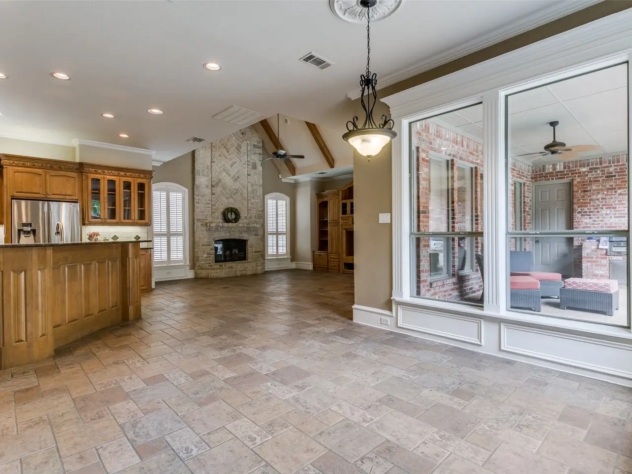 • Cathedral ceiling with hand-crafted wood beams