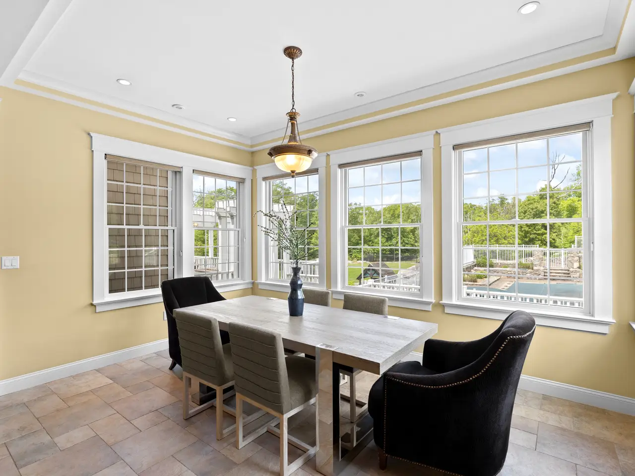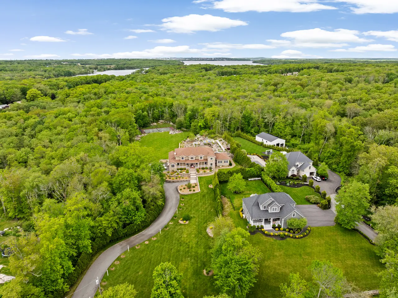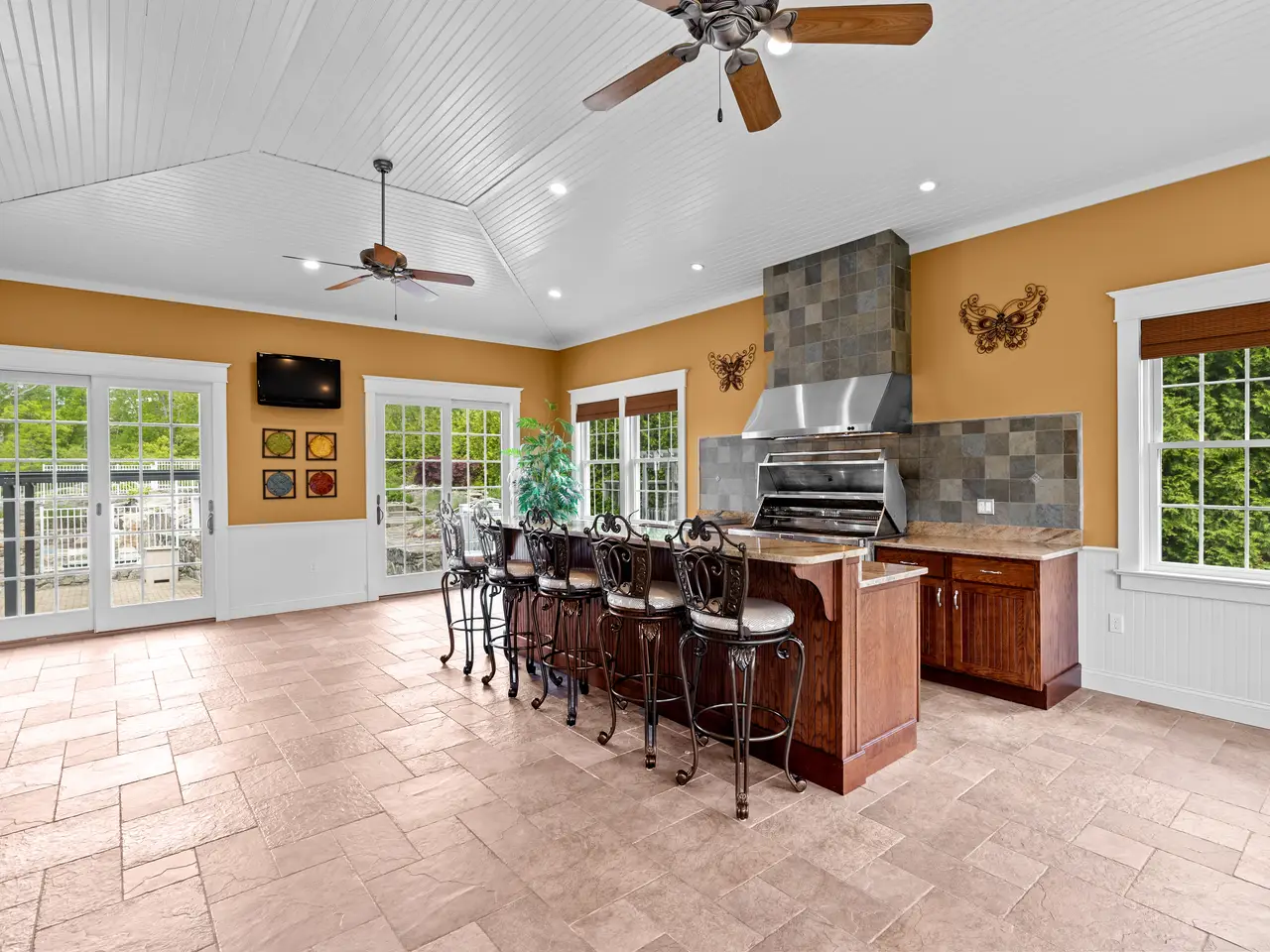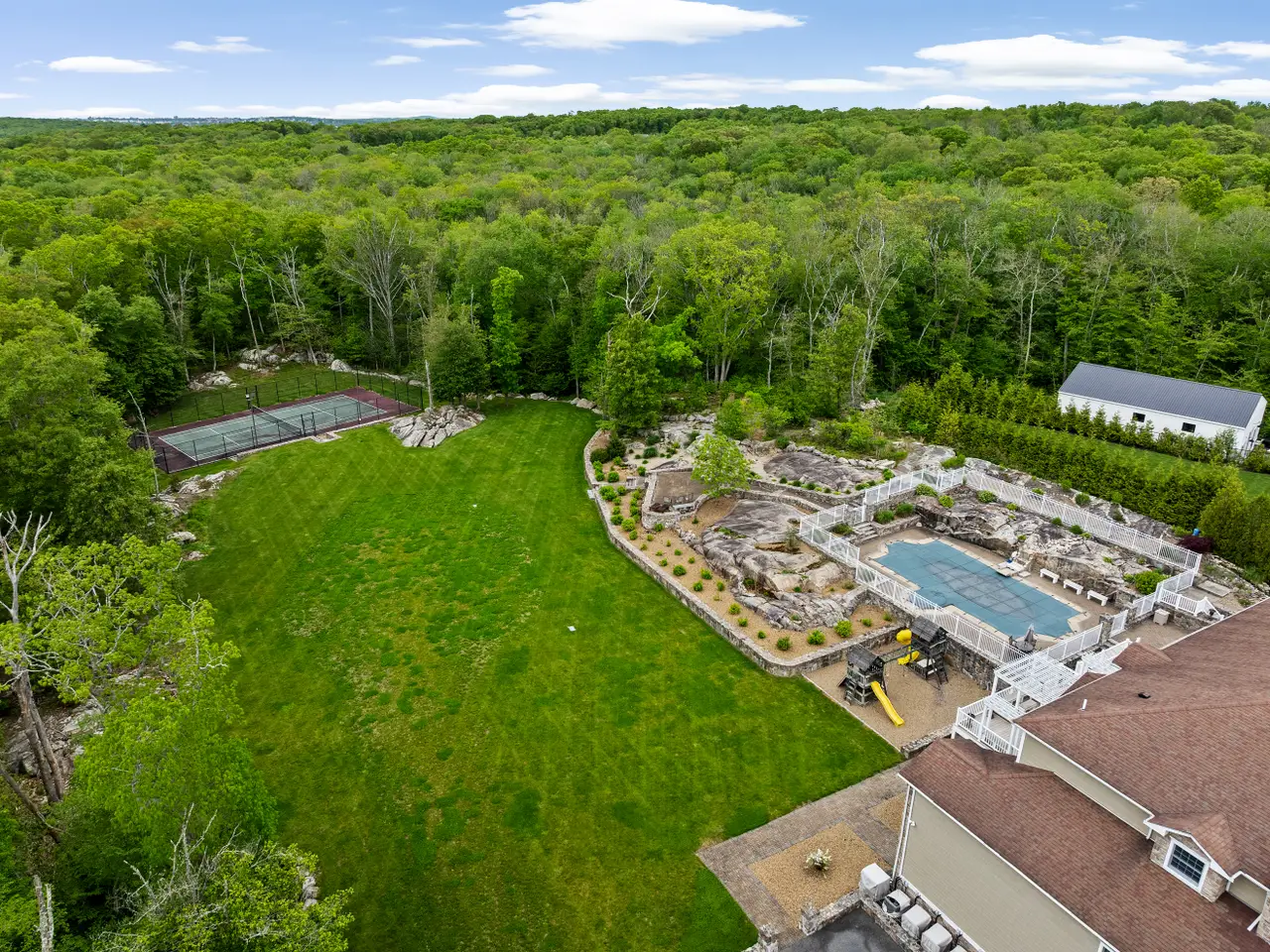 The residence features a variety of elegant living spaces, including a grand foyer, fireplaced living room, formal dining room, chef’s kitchen, and four-season room with indoor grill. A cozy family room opens through French doors to a pergola-covered deck overlooking the lush grounds. The primary suite includes an office, walk-in closet, and spa-inspired bath with jetted tub and tiled shower. A dumbwaiter provides added convenience across levels. The walkout lower level impresses with a theater, gym, playroom, studio, workshop, and garage access. Outdoor amenities include a heated saltwater pool with spillover spa, koi pond, tennis court, and artisanal woodfired grill—offering an exceptional blend of privacy, elegance, and resort-style living.