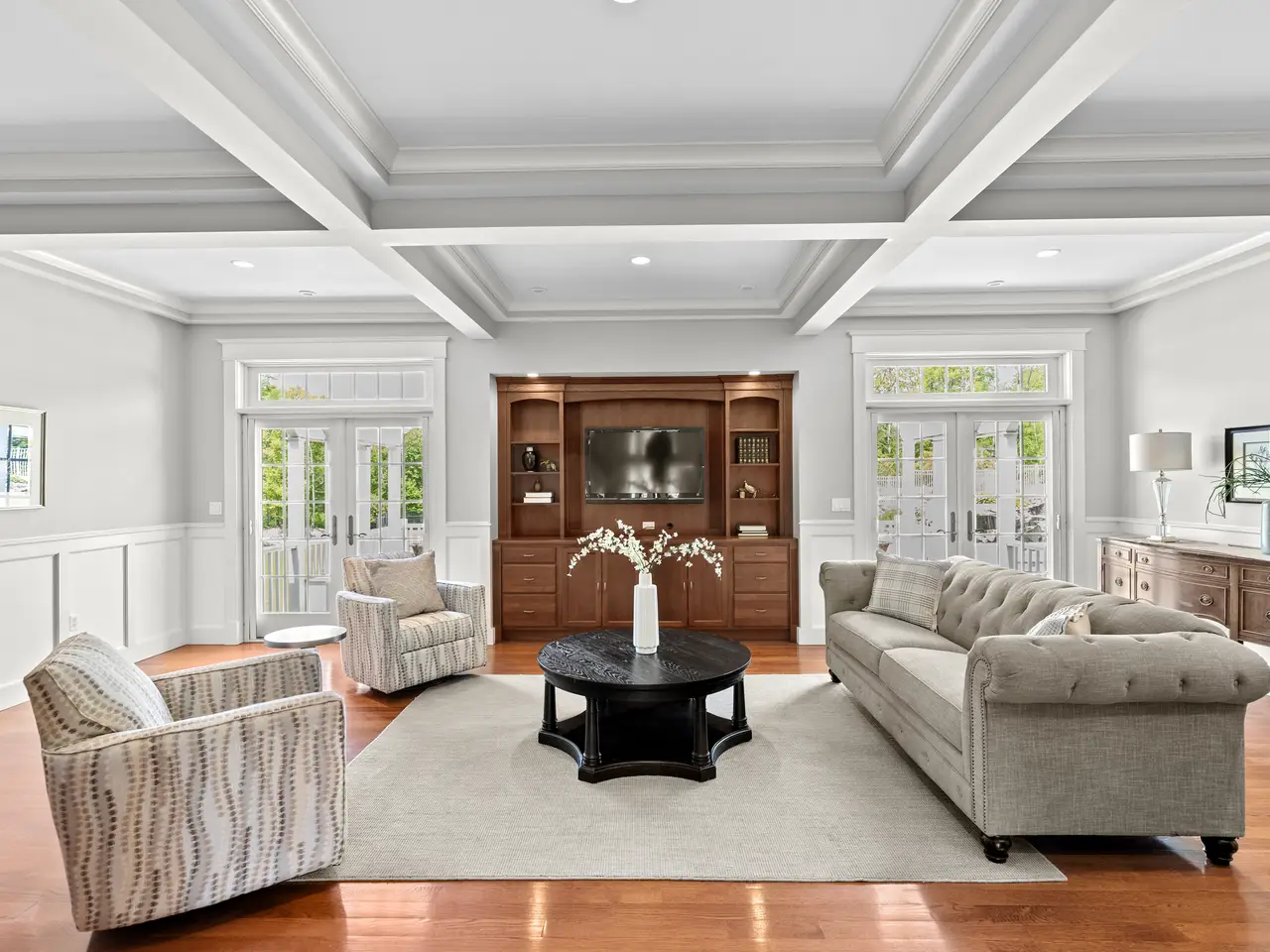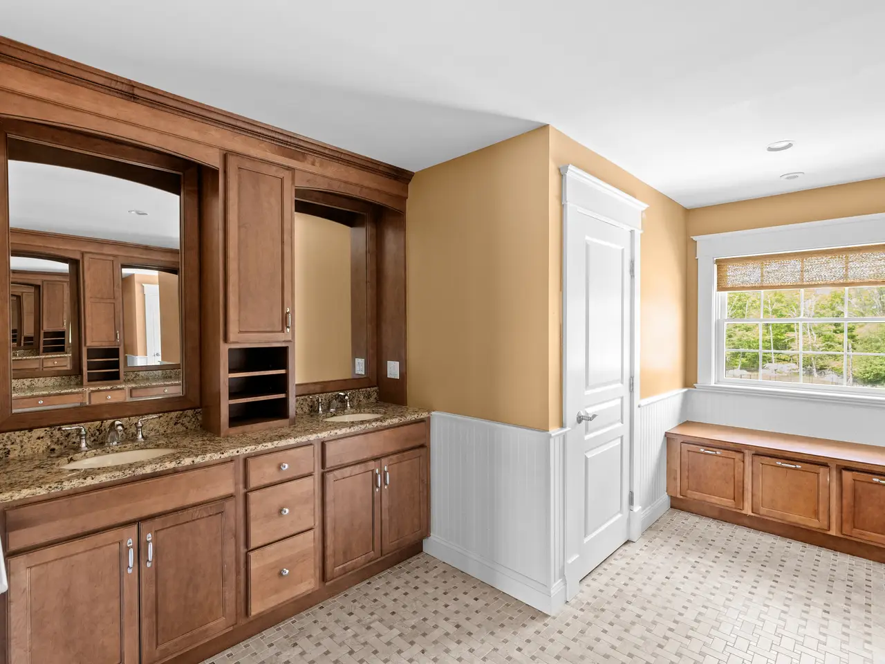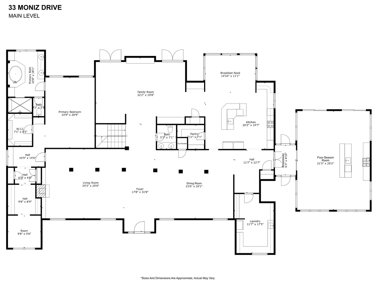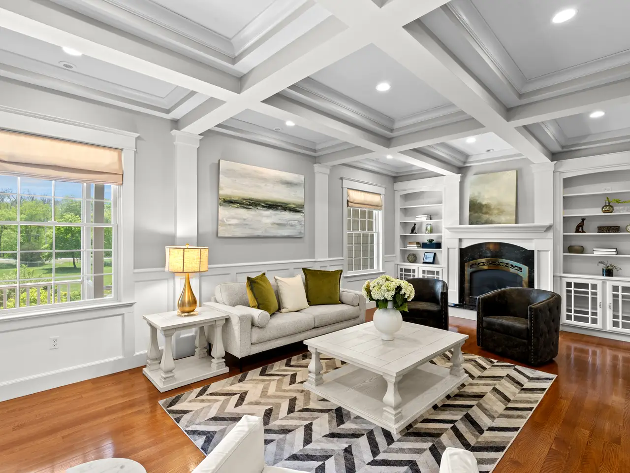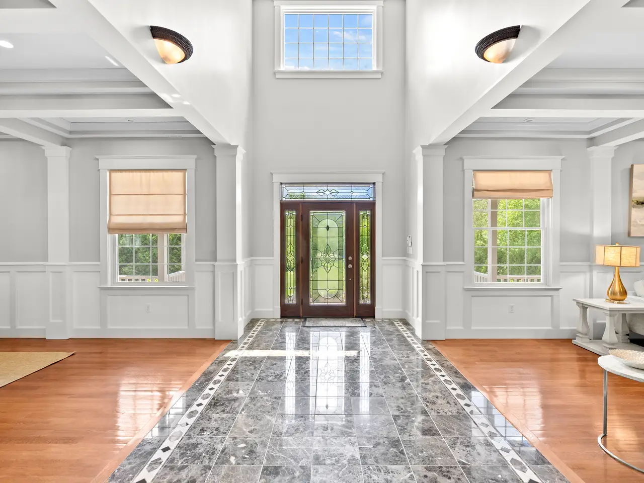 The residence features a variety of elegant living spaces, including a grand foyer, fireplaced living room, formal dining room, chef’s kitchen, and four-season room with indoor grill. A cozy family room opens through French doors to a pergola-covered deck overlooking the lush grounds. The primary suite includes an office, walk-in closet, and spa-inspired bath with jetted tub and tiled shower. A dumbwaiter provides added convenience across levels. The walkout lower level impresses with a theater, gym, playroom, studio, workshop, and garage access. Outdoor amenities include a heated saltwater pool with spillover spa, koi pond, tennis court, and artisanal woodfired grill—offering an exceptional blend of privacy, elegance, and resort-style living.
