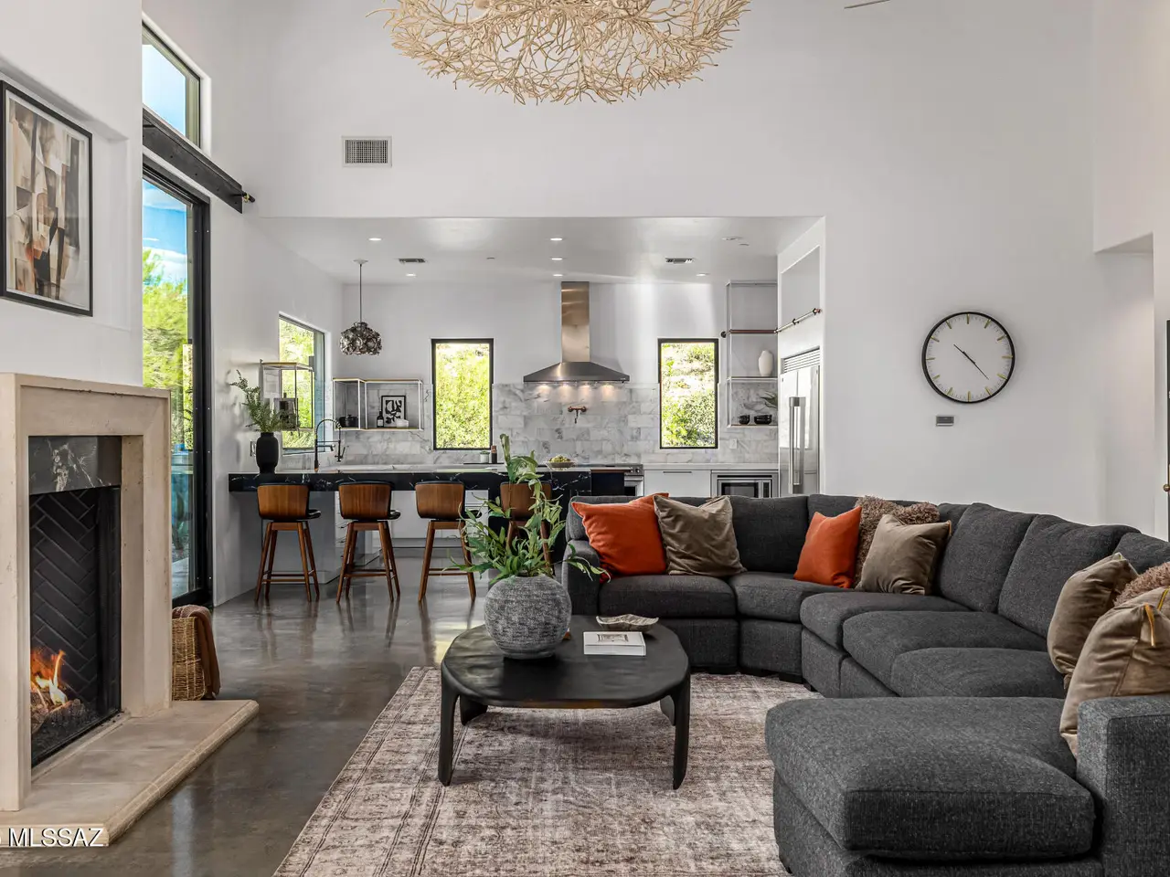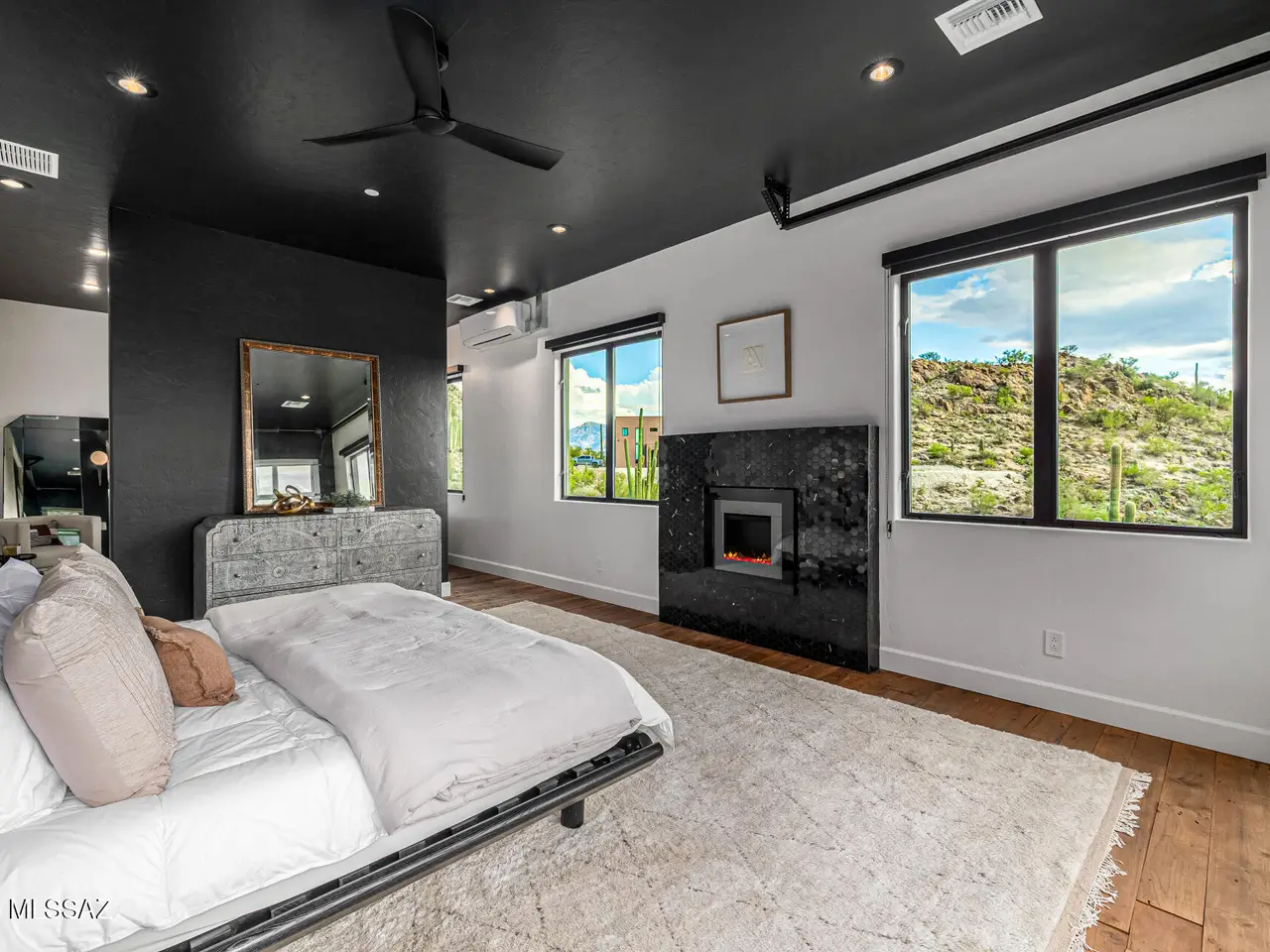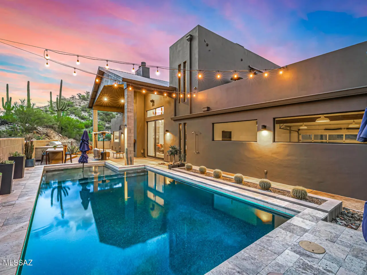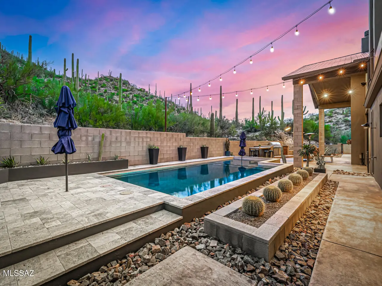 Nestled deep in the scenic Tortolita Mountains, this fully custom-built 2018 estate combines refined design with extensive upgrades inside and out. The property welcomes you with an asphalt driveway, elegant paver accents, and professionally landscaped grounds featuring outdoor lighting, solar lamps, a decorative fountain, and a custom-finished front entry. All the doors used in the home were from the historic Hotel Hidalgo! The roof has been resealed and the exteriors freshly repainted. Enjoy resort-style outdoor living with a sparkling pool (new heater), a mesquite-mantle fireplace with a custom screen, propane starter, built-in barbecue mechanics, and decorative fencing. Set against a backdrop of untouched desert beauty, the estate offers breathtaking 360-degree panoramic views of Tortolita Mountains. Expansive windows and outdoor living spaces capture glowing sunrises, dramatic sunsets, and sparkling city lights after dark. Natural desert wildlife surrounds the property, creating a private sanctuary with a front-row seat to the beauty of the Sonoran Desert. Inside, the upgrades continue with quartz kitchen countertops, a waterfall island, refinished cabinetry and hutch, and updated hardware and lighting. The great room showcases a propane fireplace setup with custom logs, while electrical dimmers and halogen bulbs create ambiance throughout. Additional features include refinished teak entry doors with glass panels, repainted interior doors and ceilings, ceiling fans in all bedrooms, a staircase runner, and polished concrete floors. Comfort is maximized with mini-splits in the master and first-floor bedrooms, as well as Tucson rolling shutter blinds in every bedroom plus electronic rolling shutter for the master suite's large glass doors and the second-floor landing. Perfectly designed for entertaining, the home is wired for interior and exterior sound, blending luxury, function, and style at every turn. This is a true desert sanctuary, offering both sophistication and serenity.