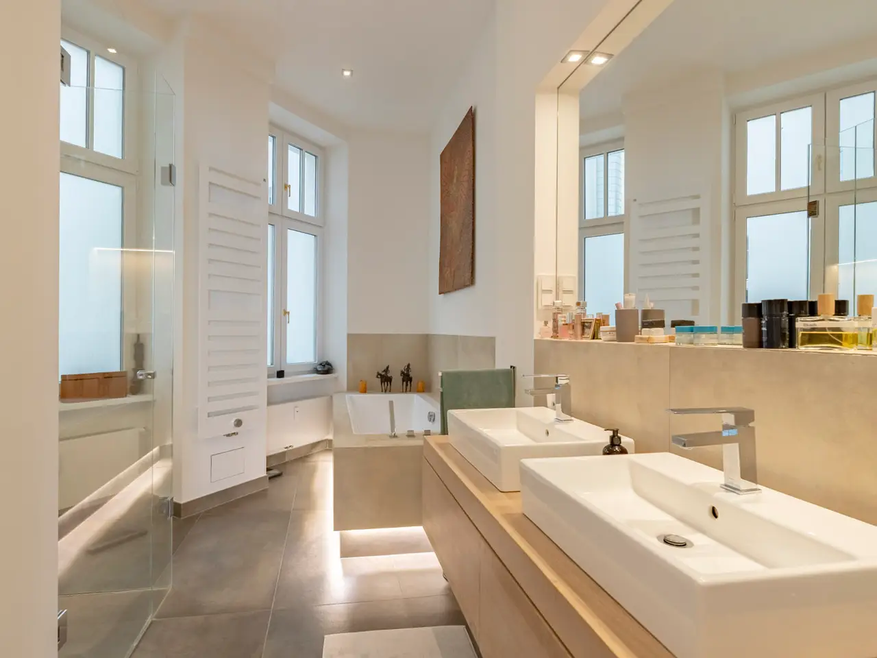 This spacious and as-new apartment extends over a living space of approx. 220 m² and is located in an impressive old building dating back to 1895. It is situated on the 2nd floor of a beautiful old building, which underwent extensive refurbishment in 2013. The property impresses with its high ceilings and well-kept herringbone parquet flooring, which combine the elegant charm of a traditional property with ultra-modern furnishings. The apartment's five rooms are generously proportioned and offer a variety of uses. The room height and the carefully selected materials contribute to the high quality of living. A highlight of the apartment is the extravagant kitchen, which is equipped with high-quality appliances and a stylish design. It not only offers plenty of space for cooking, but also the opportunity to entertain guests or create culinary experiences. The exclusive fittings in the bathrooms deserve special attention. There is a full bathroom, a shower room and a guest WC, all of which meet the highest standards. Fine materials and well thought-out details ensure special moments of well-being. The apartment also has a utility room (HWR) and a storage room, which offer additional storage space. The property has central heating, which ensures even and comfortable warmth in all rooms. The high-quality fittings and well thought-out room layout underline the exclusivity of this apartment. The property can also be divided, which makes it particularly flexible for different living concepts. Thanks to its central location, there are excellent connections to the city's transport network. Stores for daily needs, schools and leisure facilities are all within easy reach. The property is not only a place to live, but also offers space for representation and private retreat. The combination of historical charm and modern amenities makes this apartment a unique home for discerning city dwellers. We would be happy to arrange a personal viewing to show you the many possibilities and high-quality fittings of this special apartment. Contact us to arrange an appointment and let us convince you of the advantages of this property.