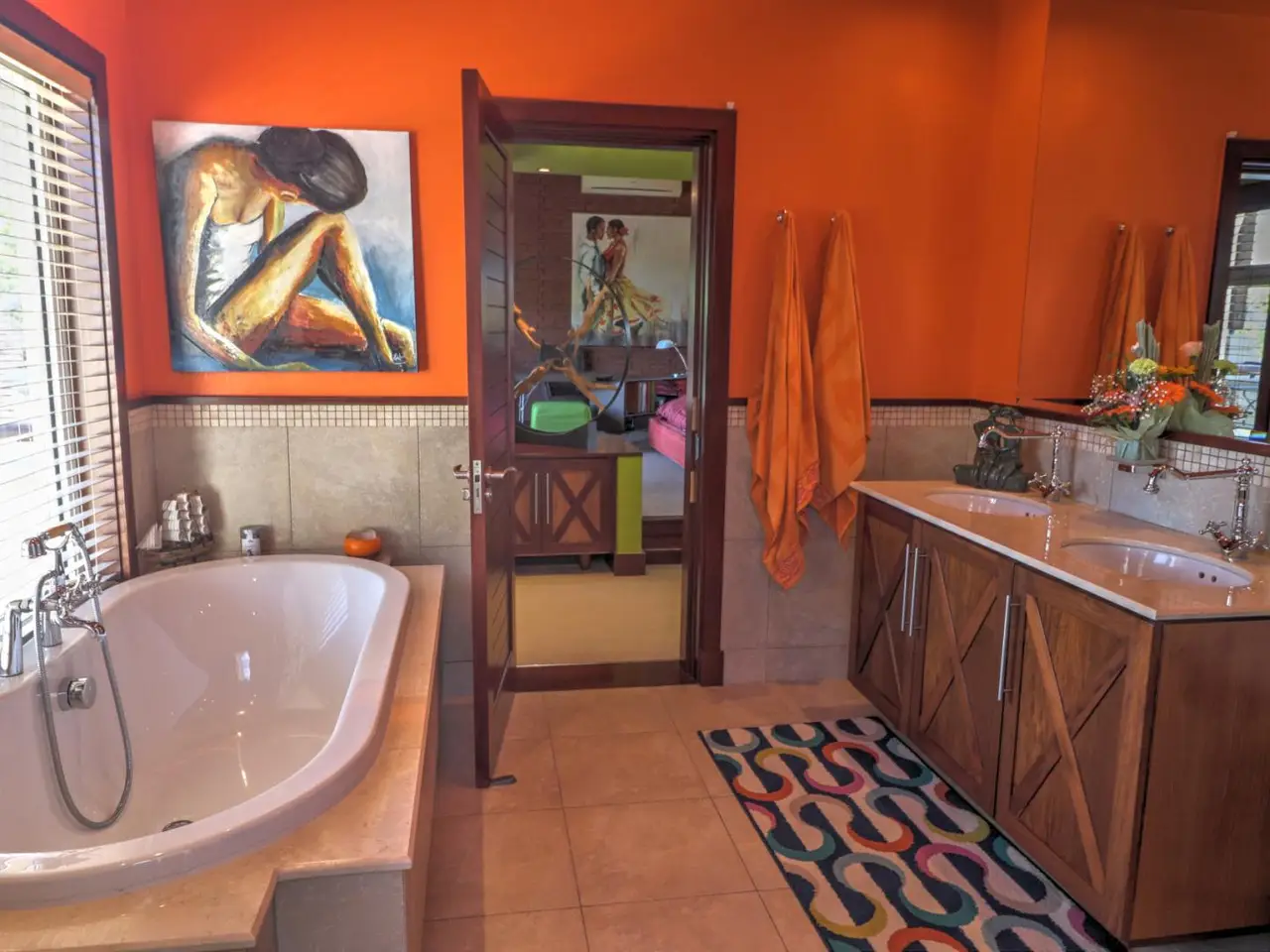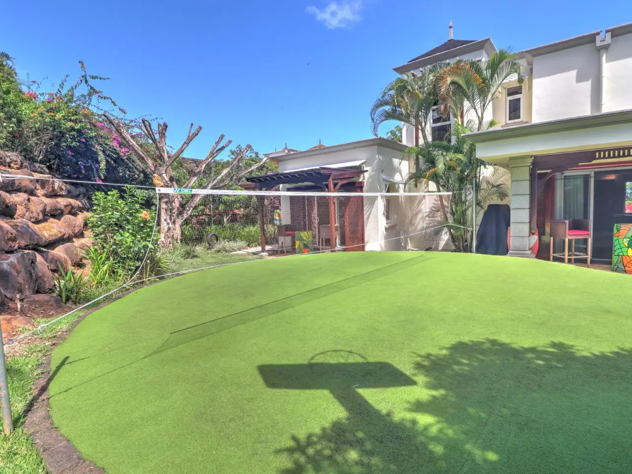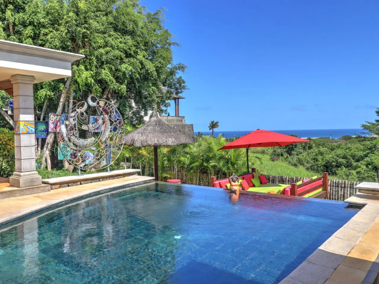 This 3-bedroom villa for sale in Heritage Villas Valriche, a reputed golf estate in the South-West of Mauritius, boasts exceptional sea views, colourful rooms and a hand-picked art collection.   Known for its bold hues and personalised features, the property makes a bold statement in one of the most renowned golf estates in Mauritius.    The property is situated on a spacious plot of 1350 m2, offering 2 swimming pools, a multipurpose basketball/badminton court , a private jacuzzi corner, a cinema room, an entertainment room, a covered fitness area by the main pool, 2 garages with three golf carts included in the price, and an outdoor teppanyaki bar.    The 409 m2 villa, is dotted with a selection of art pieces, curated from across the world and included in the sales price.  One of the bedrooms makes the ideal guest suite with its private bathroom, kitchenette, lounge and private terrasse. The spacious main bedroom is found on the first floor with lovely views of the sea.   The new owner will not only benefit from the indulging lifestyle features this property has to offer, defined by statement pieces and leisure furnishing, but the latter will also be able to access the estate’s established facilities and clubs such as: the Heritage golf club, the gastronomic restaurant situated at the historic Chateau de Bel Ombre, private nature reserves, the C beach club providing residents access to the beach, as well as privileged access to the estates luxury partner hotels.   With permanent residency upon purchase, and hands-on conciergerie services provided by the estate for owners looking to rent when not on Island, this is the ideal investment for those looking to have an exceptional property in a sought-after establishment where refined leisure is a at its core.
