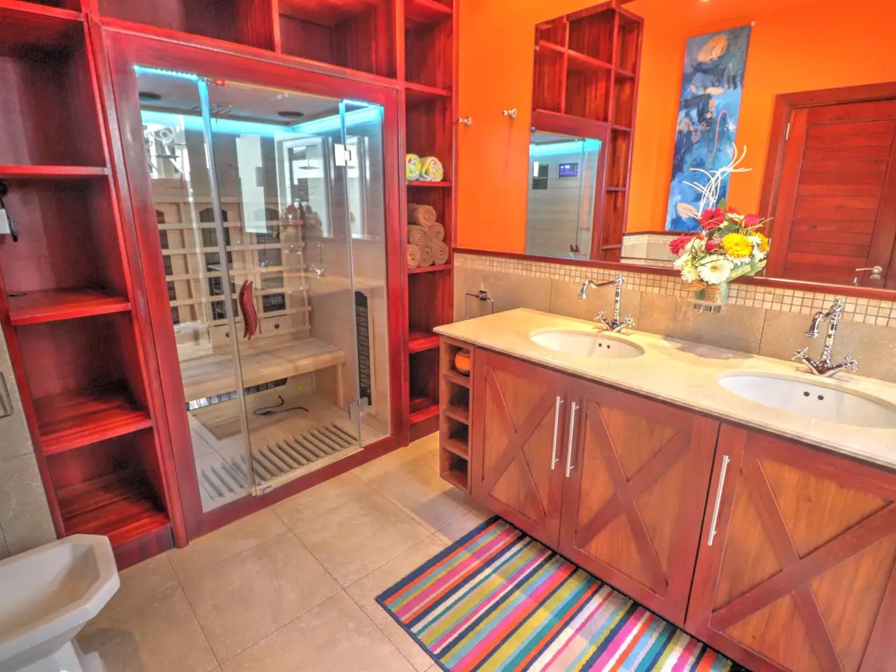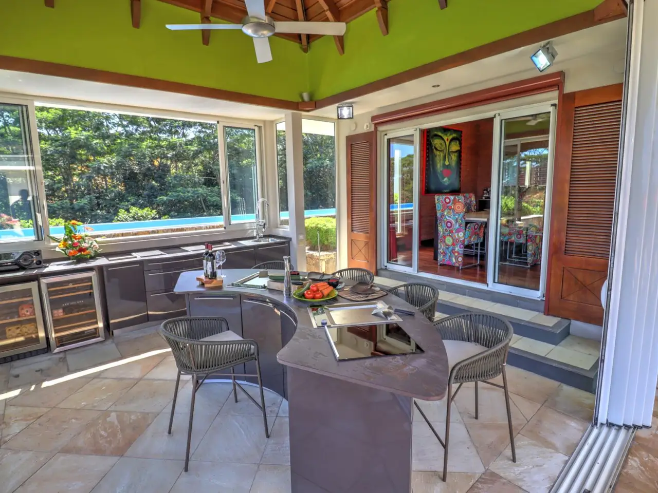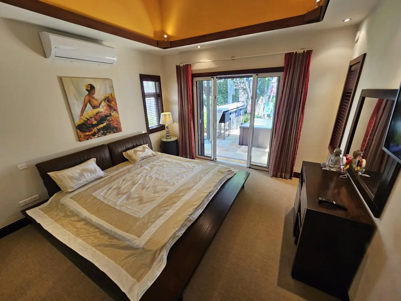 This 3-bedroom villa for sale in Heritage Villas Valriche, a reputed golf estate in the South-West of Mauritius, boasts exceptional sea views, colourful rooms and a hand-picked art collection.   Known for its bold hues and personalised features, the property makes a bold statement in one of the most renowned golf estates in Mauritius.    The property is situated on a spacious plot of 1350 m2, offering 2 swimming pools, a multipurpose basketball/badminton court , a private jacuzzi corner, a cinema room, an entertainment room, a covered fitness area by the main pool, 2 garages with three golf carts included in the price, and an outdoor teppanyaki bar.    The 409 m2 villa, is dotted with a selection of art pieces, curated from across the world and included in the sales price.  One of the bedrooms makes the ideal guest suite with its private bathroom, kitchenette, lounge and private terrasse. The spacious main bedroom is found on the first floor with lovely views of the sea.   The new owner will not only benefit from the indulging lifestyle features this property has to offer, defined by statement pieces and leisure furnishing, but the latter will also be able to access the estate’s established facilities and clubs such as: the Heritage golf club, the gastronomic restaurant situated at the historic Chateau de Bel Ombre, private nature reserves, the C beach club providing residents access to the beach, as well as privileged access to the estates luxury partner hotels.   With permanent residency upon purchase, and hands-on conciergerie services provided by the estate for owners looking to rent when not on Island, this is the ideal investment for those looking to have an exceptional property in a sought-after establishment where refined leisure is a at its core.