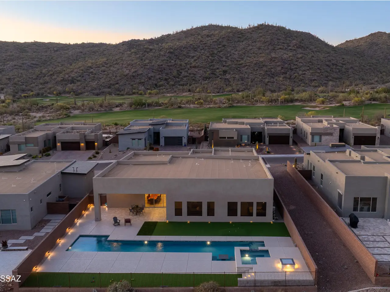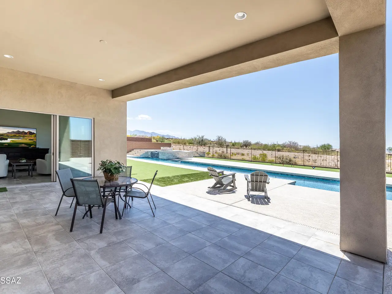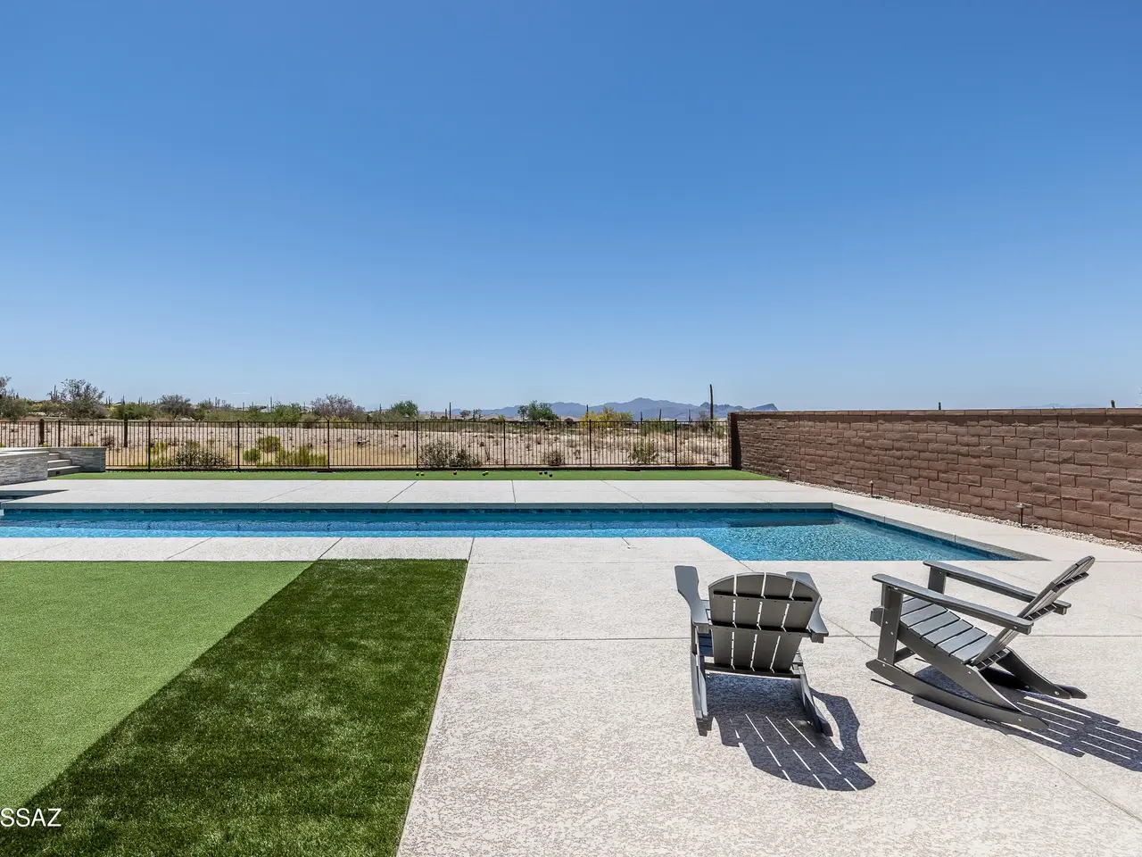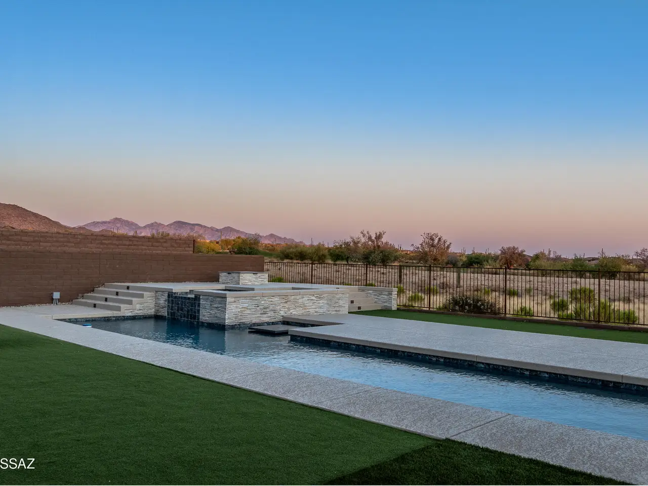 WOW best describes this stunning, relaxing, luxury-living-in-the-desert exquisite home at Fairfield's Boulder Bridge Pass. Owner has spared nothing to make this home the most inviting residence in the neighborhood. One of a kind 60ft heated lap pool let's you swim real laps- real exercise! Plus other casual entertainment: your own putting green & bocce ball court! Elevated spa & modern crushed glass firepit hosts beautiful mountain views. All at your own relaxing resort style home. No homes behind-natural desert buffer then the golf course beyond. Sunrise & sunset skies will mesmerize you at different times of the year. Panoramic mountain views throughout backyard. Deep & spacious under porch area + private (and rare for the subdivision) front courtyard. Great for private relaxation. + This Sycamore model has been modified to become a full 4 bedroom all w/private ensuite bathrooms - & of course an extra powder room. Grand open great room concept living. Spacious kitchen island bar, grand dining area, and additional private den or bonus room. Drop station as you enter the home through garage (which is an oversized 3 car garage w/tankless water heater. Expansive laundry room w/utility sink and mini mud room/hallway. Darkening room tight window shades in all bedrooms. Kitchen is state of the art w/LG stainless appliances. NO carpet in home! Stylish and modern 12'x8ft high corner meet Multi-Slide door in great room/dining. Clean, crisp & new. Home barely lived in. Still has new home feel! Lovely custom front landscape design just installed May 2025. This is a spectacular home - new and absolutely beautiful with basically nothing left to do but move in and enjoy your oasis resort style living in the desert!