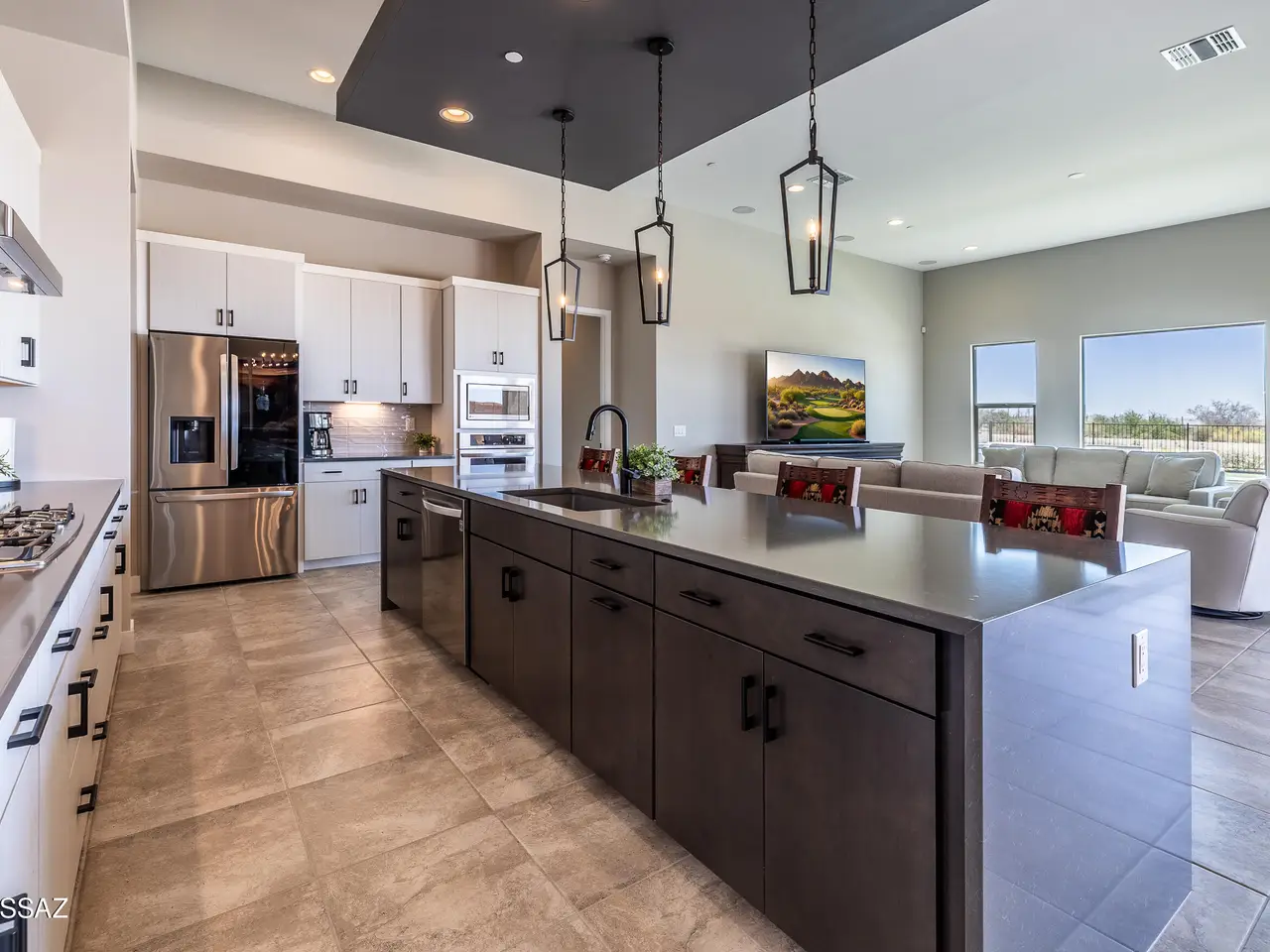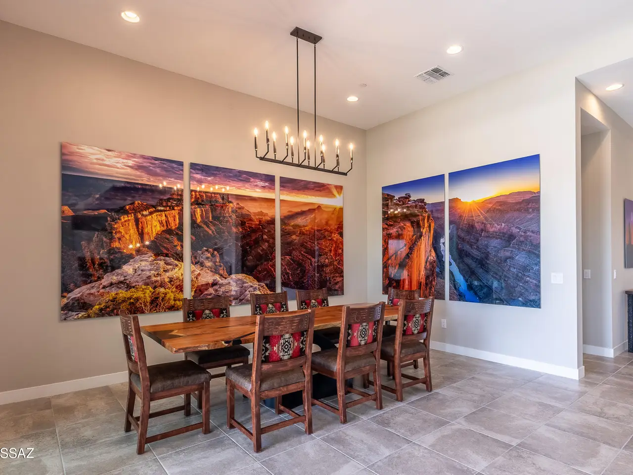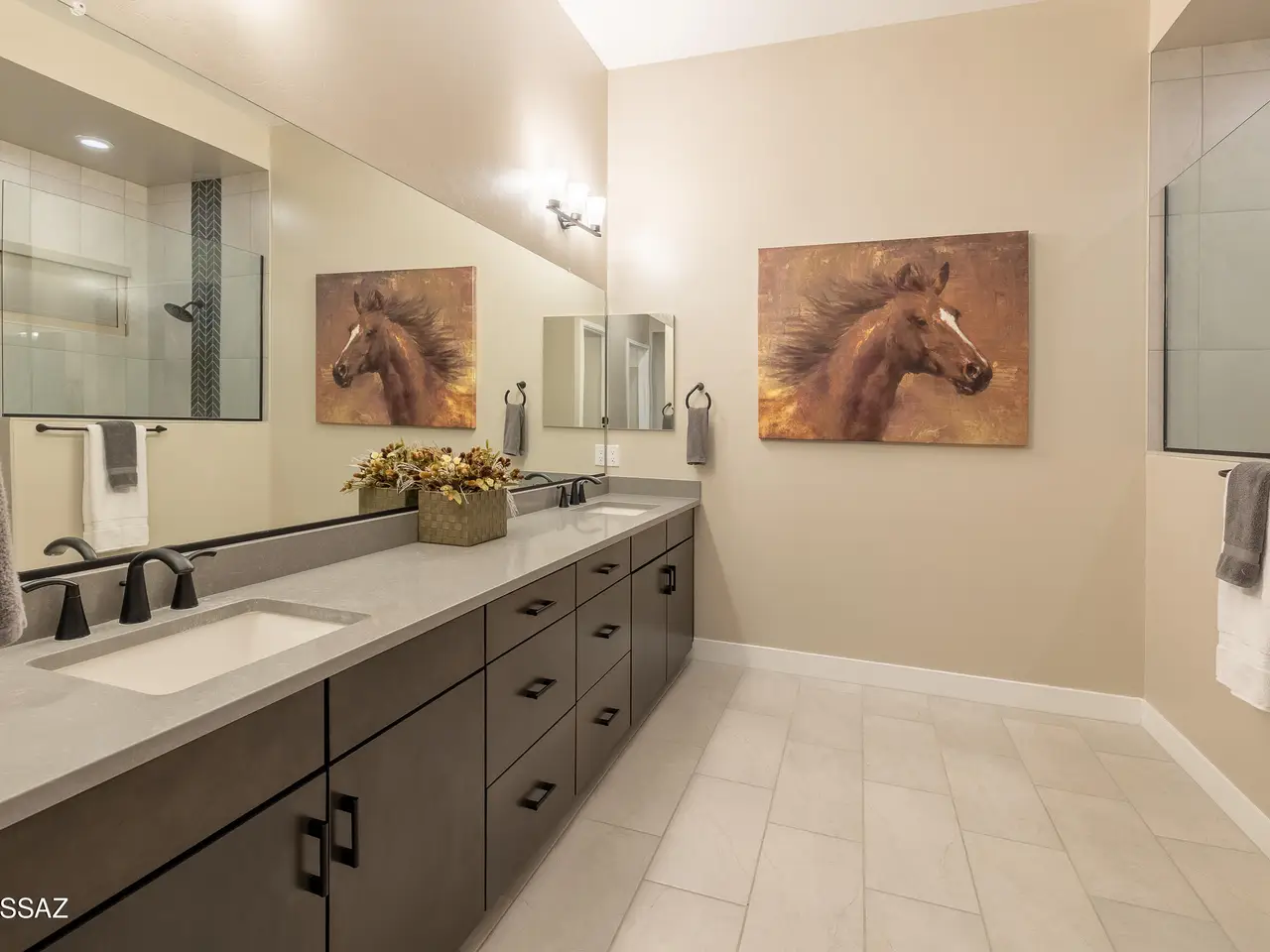 WOW best describes this stunning, relaxing, luxury-living-in-the-desert exquisite home at Fairfield's Boulder Bridge Pass. Owner has spared nothing to make this home the most inviting residence in the neighborhood. One of a kind 60ft heated lap pool let's you swim real laps- real exercise! Plus other casual entertainment: your own putting green & bocce ball court! Elevated spa & modern crushed glass firepit hosts beautiful mountain views. All at your own relaxing resort style home. No homes behind-natural desert buffer then the golf course beyond. Sunrise & sunset skies will mesmerize you at different times of the year. Panoramic mountain views throughout backyard. Deep & spacious under porch area + private (and rare for the subdivision) front courtyard. Great for private relaxation. + This Sycamore model has been modified to become a full 4 bedroom all w/private ensuite bathrooms - & of course an extra powder room. Grand open great room concept living. Spacious kitchen island bar, grand dining area, and additional private den or bonus room. Drop station as you enter the home through garage (which is an oversized 3 car garage w/tankless water heater. Expansive laundry room w/utility sink and mini mud room/hallway. Darkening room tight window shades in all bedrooms. Kitchen is state of the art w/LG stainless appliances. NO carpet in home! Stylish and modern 12'x8ft high corner meet Multi-Slide door in great room/dining. Clean, crisp & new. Home barely lived in. Still has new home feel! Lovely custom front landscape design just installed May 2025. This is a spectacular home - new and absolutely beautiful with basically nothing left to do but move in and enjoy your oasis resort style living in the desert!