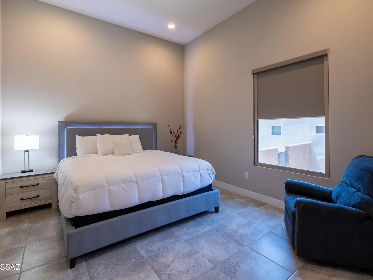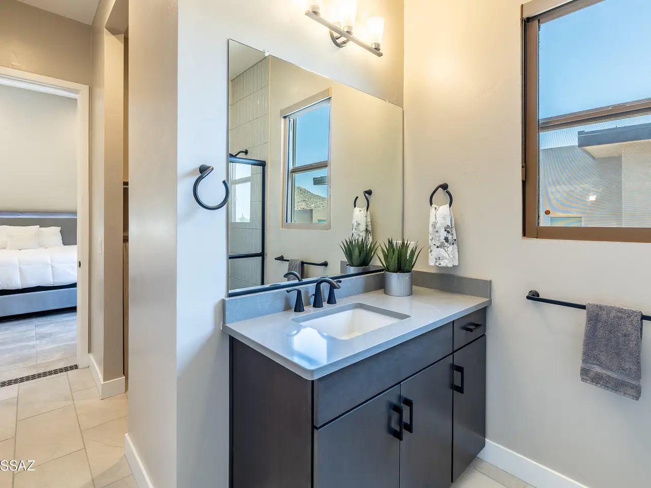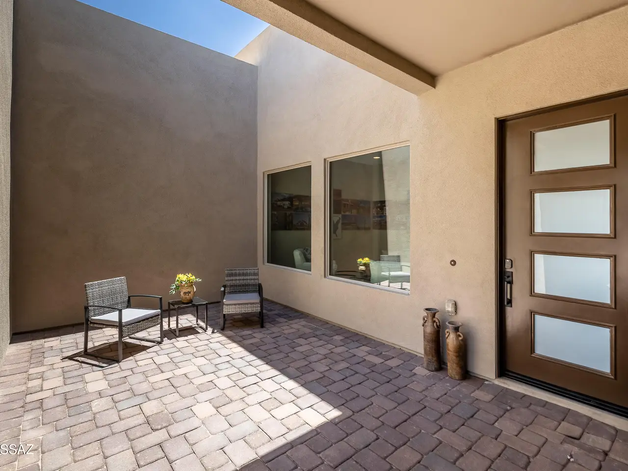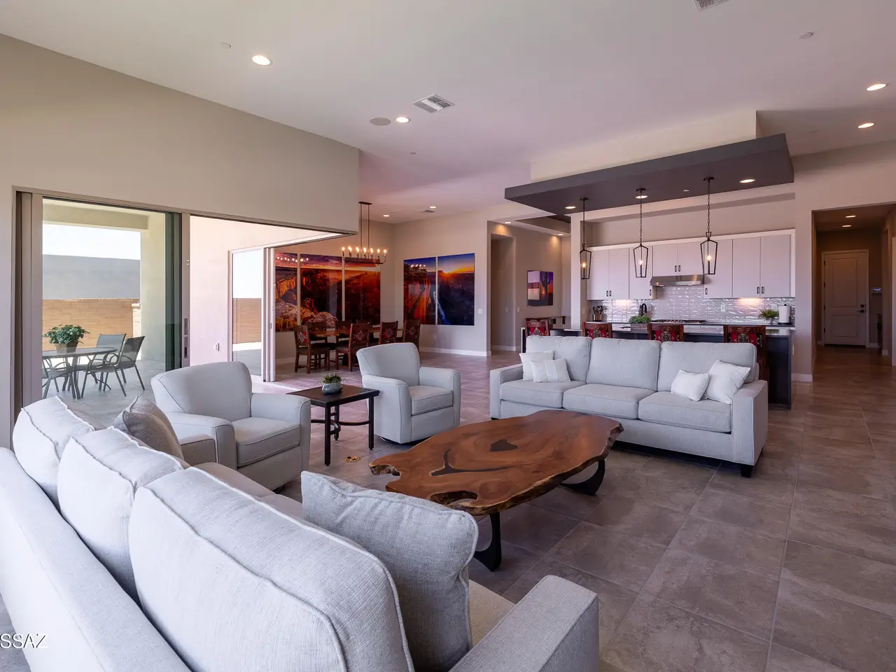 WOW best describes this stunning, relaxing, luxury-living-in-the-desert exquisite home at Fairfield's Boulder Bridge Pass. Owner has spared nothing to make this home the most inviting residence in the neighborhood. One of a kind 60ft heated lap pool let's you swim real laps- real exercise! Plus other casual entertainment: your own putting green & bocce ball court! Elevated spa & modern crushed glass firepit hosts beautiful mountain views. All at your own relaxing resort style home. No homes behind-natural desert buffer then the golf course beyond. Sunrise & sunset skies will mesmerize you at different times of the year. Panoramic mountain views throughout backyard. Deep & spacious under porch area + private (and rare for the subdivision) front courtyard. Great for private relaxation. + This Sycamore model has been modified to become a full 4 bedroom all w/private ensuite bathrooms - & of course an extra powder room. Grand open great room concept living. Spacious kitchen island bar, grand dining area, and additional private den or bonus room. Drop station as you enter the home through garage (which is an oversized 3 car garage w/tankless water heater. Expansive laundry room w/utility sink and mini mud room/hallway. Darkening room tight window shades in all bedrooms. Kitchen is state of the art w/LG stainless appliances. NO carpet in home! Stylish and modern 12'x8ft high corner meet Multi-Slide door in great room/dining. Clean, crisp & new. Home barely lived in. Still has new home feel! Lovely custom front landscape design just installed May 2025. This is a spectacular home - new and absolutely beautiful with basically nothing left to do but move in and enjoy your oasis resort style living in the desert!