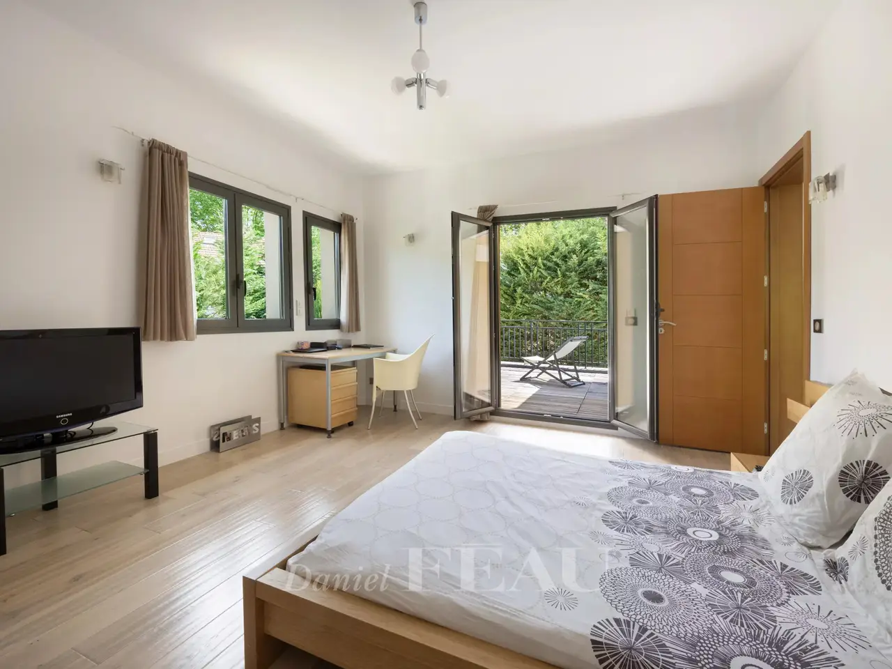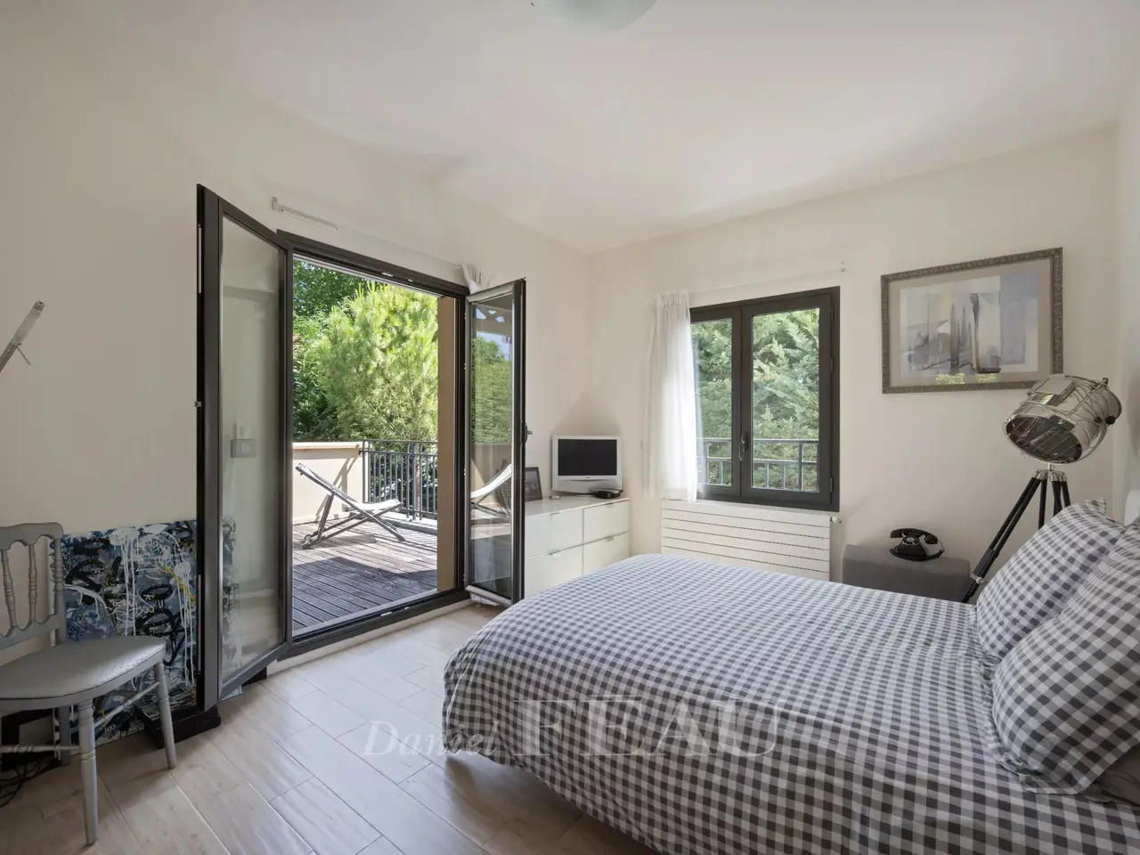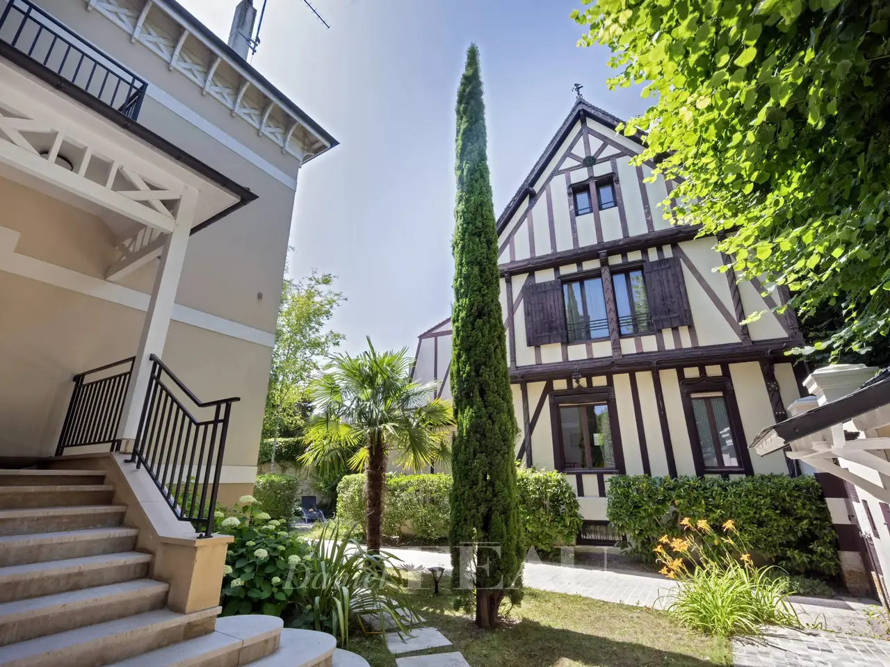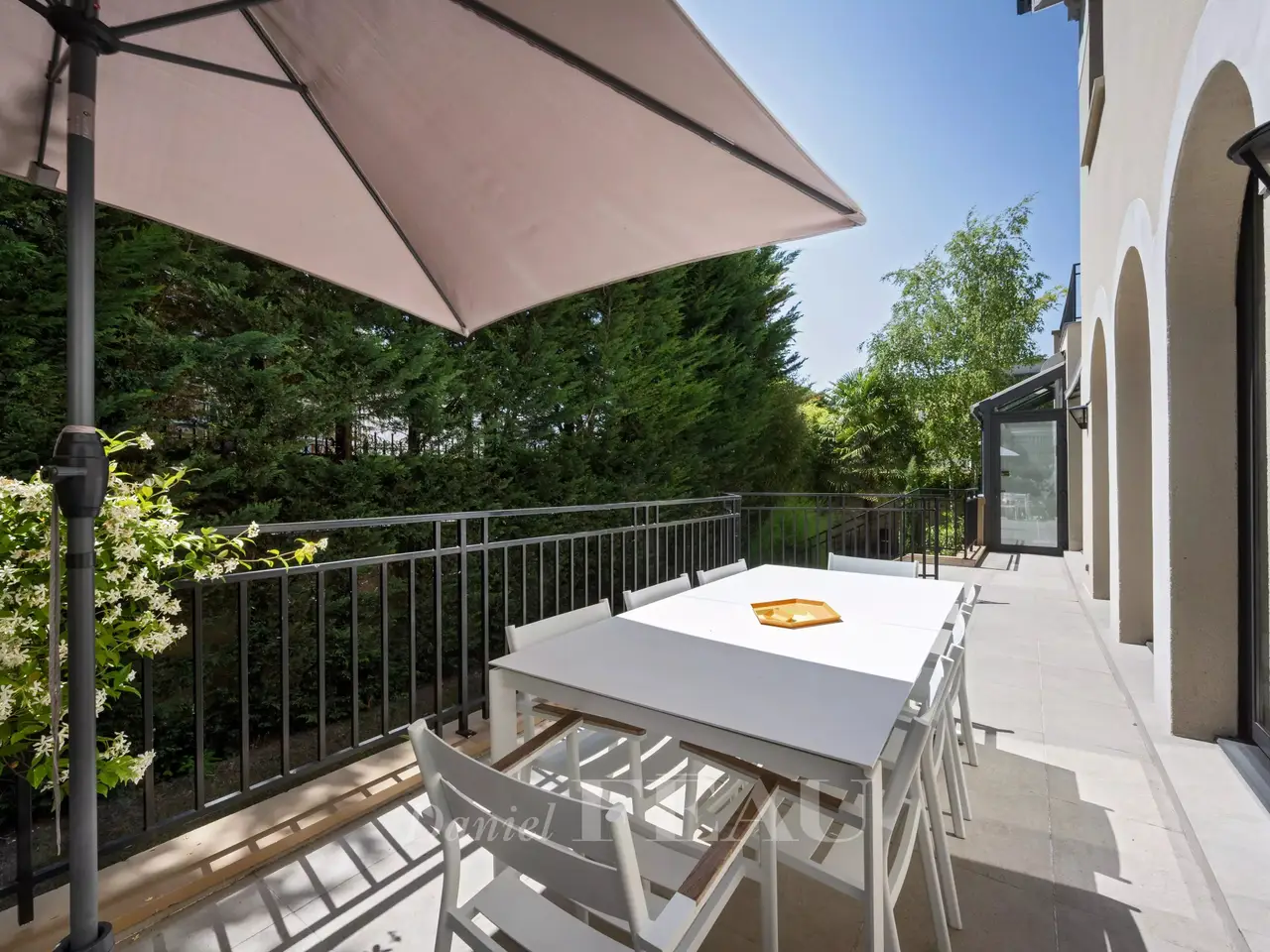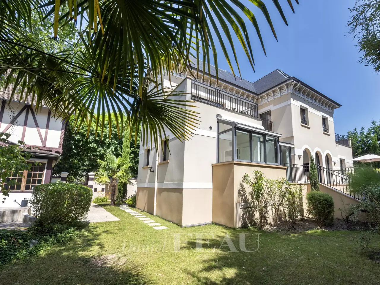 This sumptuous recent villa bathed in sunshine and hidden from view in a luxuriant garden is located in Saint-Maur-des-Fossés’s residential La Varenne Saint Hilaire neighbourhood south-east of the capital. In mint condition, it offers 500 sqm of floor space and 299 sqm of living space including a dual-aspect living/reception room featuring 6.50 metre high ceilings, an extensively glazed dining room, an equipped 25 sqm kitchen (all opening onto a 35 sqm south-west facing terrace), a master suite with a balneotherapy bathroom, a shower room and a dressing room, a guest wc and a storage room. The upper floor enjoys direct views of the Marne River, and comprises four bedrooms (all opening onto private terraces and two with bathrooms), and a bathroom. On a basement with a 200 sqm garage. Conversion would be possible. The plot also includes an 87 sqm three-storey Anglo-Norman style annex. A sqm extension would be possible.