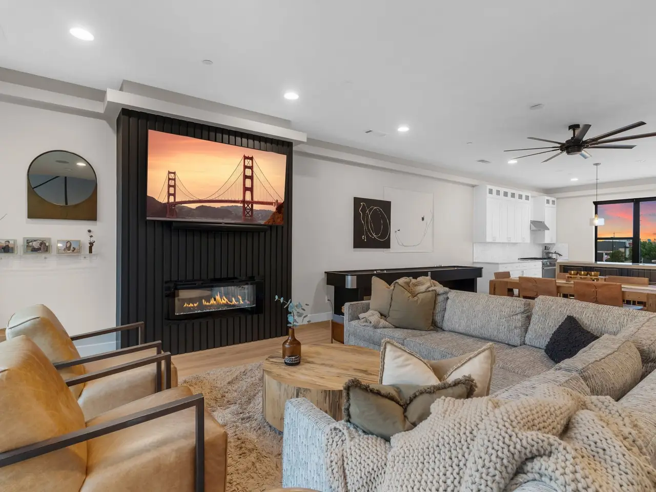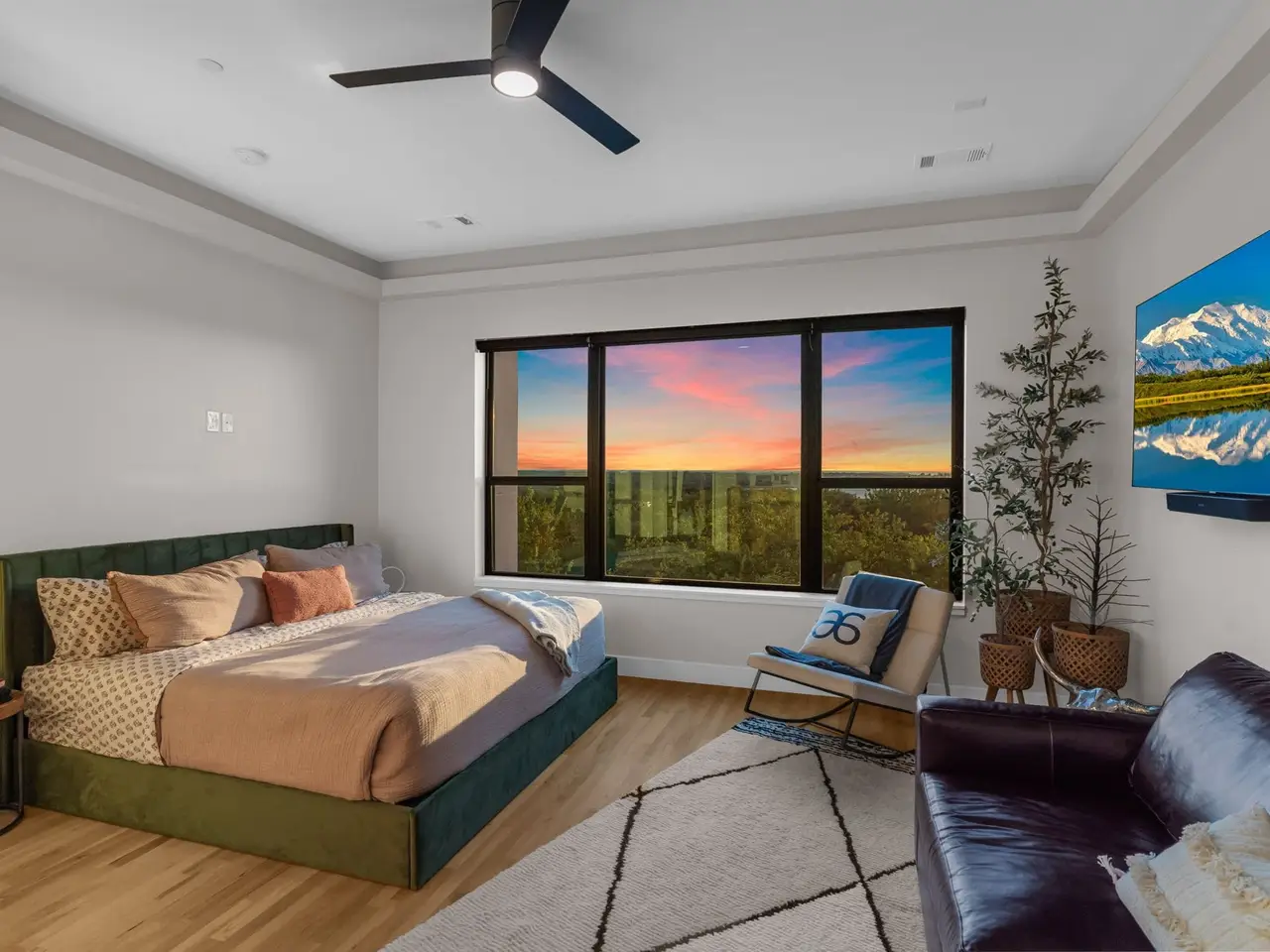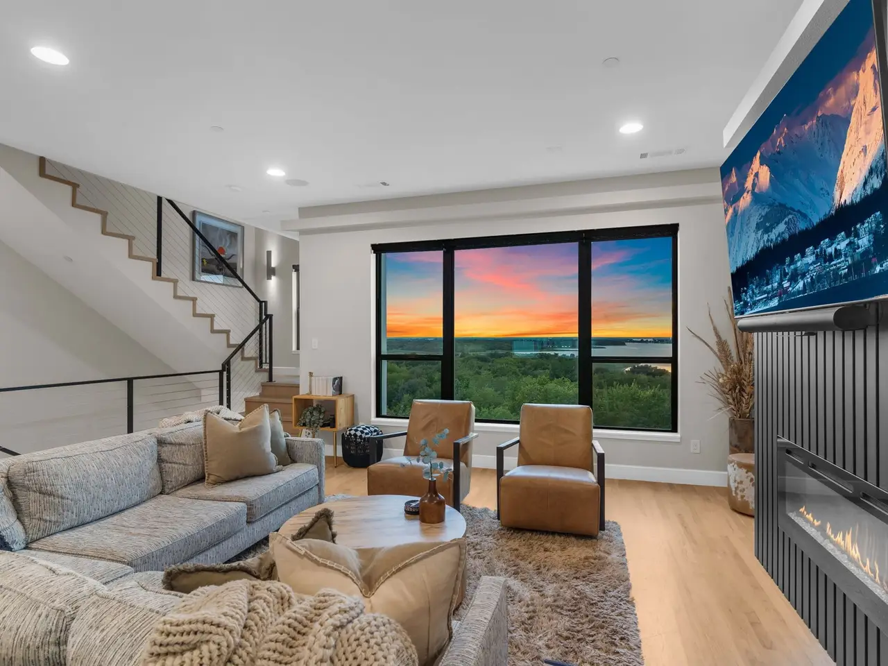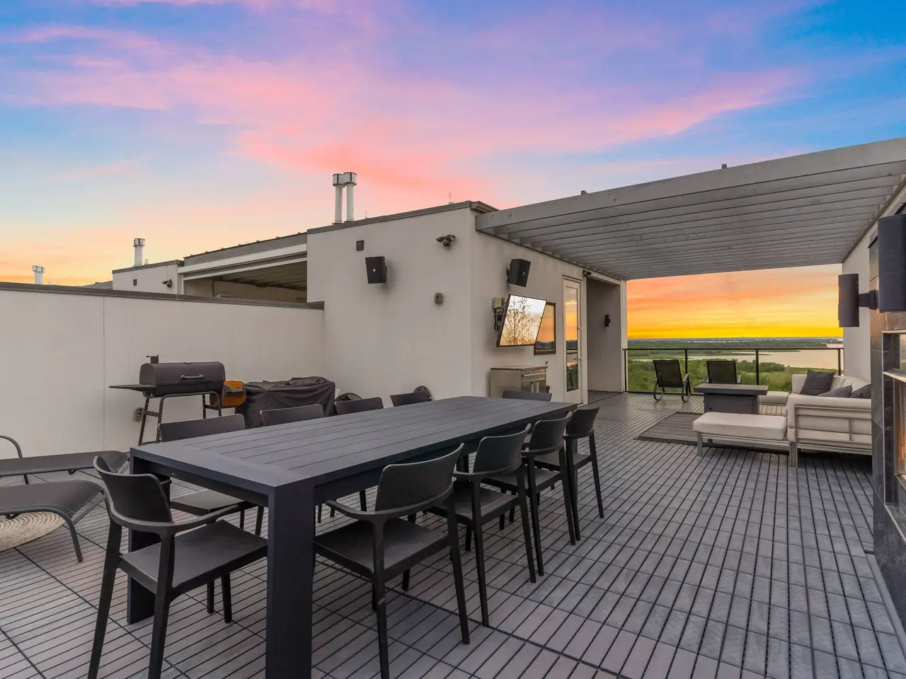 UNOBSTRUCTED BREATHTAKING VIEWS OF LAKE LEWISVILLE from all levels! STUNNING SUNSETS atop this low maintenance, lock and go lifestyle with your own ROOFTOP PATIO! This modern, three-story townhome is designed for those who love clean lines, natural light, and effortless indoor-outdoor flow. Every level of this home has purpose. The ground floor greets you with sleek concrete flooring, tall ceilings, and leads to a flexible space that can serve as a guest suite, office, or studio, complete with its own full bath and direct access to the private garage. The 2nd floor is for rest and retreat. The primary suite offers lake views and a spa-inspired ensuite bathroom, featuring a walk-in shower, free-standing tub, double sinks, lots of storage and a custom closet. A 2nd bedroom with an ensuite bath and walk in closet complete the level, along with a laundry space tucked neatly away. Upstairs, opens up to a spacious kitchen that anchors the heart of the home with custom cabinetry, quartz countertops, and high-end appliances - all within easy reach of the open dining and living areas. Natural light floods in through large picture windows, framing glimpses of the lake and beyond. But the crown jewel is above. Up one more flight, the rooftop patio is your own private escape. Outfitted for lounging, dining, or simply watching the world turn golden, this space offers panoramic lake views and sunsets that are truly magical. Glass railing keeps the view clear, and there's a tastefully designed outdoor kitchen complete with a grill, fridge and sink along with a fireplace, lounging area with a TV and room for a spa, prewired. Whether you're entertaining or unwinding, this townhome delivers modern living with nature and picturesque views from every window. Nothing between you and the lake but COE land with meandering trails and beautiful foliage. SMART HOME features and an ELEVATOR provide added convenience. Two miles to 121, 17 miles to DFW Airport, 5.5 miles to The Star, 3 miles to Grandscape, 9 miles to PGA.