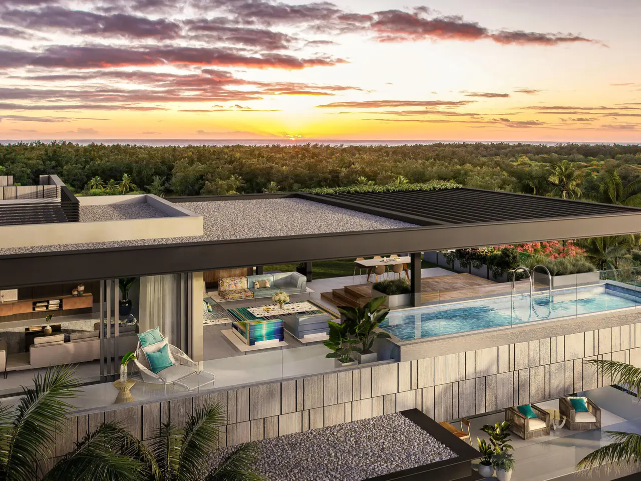 Perched at the heart of Mont Choisy La Réserve – Phase 6, this exceptional penthouse embodies the very essence of refined tropical living within Mauritius’ most exclusive Smart City development. Nestled between the turquoise lagoon of Grand Baie and the lush fairways of the Mont Choisy golf course, this residence combines architectural elegance, innovative design, and timeless comfort. Designed to embrace the island’s natural beauty, the penthouse offers breathtaking panoramic views across landscaped gardens, shimmering pools, and the horizon beyond. Expansive glass openings invite abundant light and sea breezes, creating a seamless flow between indoor sophistication and outdoor serenity. Every space has been carefully considered to offer an effortless sense of harmony, privacy, and tranquility. The living and dining areas form the heart of the home — spacious, luminous, and ideal for both intimate moments and elegant entertaining. The layout extends naturally to a large covered terrace and private rooftop pool, where you can unwind under the Mauritian sky, host guests, or simply enjoy the gentle rhythm of tropical life. The kitchen, fully equipped with premium appliances and bespoke cabinetry, blends functionality and design to perfection. Generous storage, elegant finishes, and a sleek island make it an inviting space for both cooking and conversation. The bedrooms, including a sumptuous master suite, exude serenity and sophistication. Each one opens onto private terraces or offers serene garden and golf views. The master bedroom features a walk-in wardrobe and an ensuite bathroom adorned with elegant finishes, natural textures, and soft lighting — a true sanctuary. Mont Choisy La Réserve, part of the visionary Mont Choisy Smart City, represents a new era of connected and sustainable living. This integrated development seamlessly brings together residential, retail, dining, leisure, education, and healthcare facilities, all within walking distance. Designed for modern lifestyles, it fosters a vibrant, inclusive, and future-ready community. Beyond the apartment, residents enjoy access to a wealth of amenities: the Mont Choisy Golf & Beach Estate, with its 18-hole championship course, exclusive Beach Club, sports facilities, and verdant parks. The pristine beaches and cosmopolitan charm of Grand Baie are just minutes away, offering boutique shopping, fine dining, and a lively social scene. This penthouse is more than a home — it’s a statement of style and a celebration of life under the Mauritian sun. Combining architectural excellence, technological innovation, and tropical grace, it offers an unparalleled residential experience in one of the island’s most desirable addresses. At Mont Choisy La Réserve, the future of island living unfolds — where elegance, innovation, and nature exist in perfect harmony.
