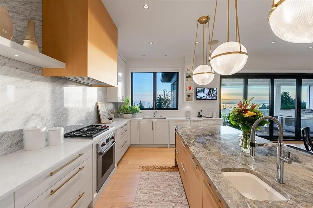 Spectacular Ocean & Gulf Island Views combined with superior quality and timeless modern design. Quality built by Dakota Homes, this luxurious 6,000sqft home offers breathtaking views from principal living spaces seamlessly integrating indoor & outdoor living. Luxurious interior design throughout, the open-concept main floor includes a Great Room, Gourmet kitchen with professional Wolf/Subzero appliances, Wok Kitchen, Formal and Casual Dining areas along with a heated oceanside deck. Elevator for easy access to the lower levels, including the lavish primary suite and 3 additional guest suites. Walk out basement complete with a media room, gym, bar, wine cellar, and a guest room. Meticulously landscaped and gated for privacy with rear and front access. Bayridge & Semiahmoo school catchment.