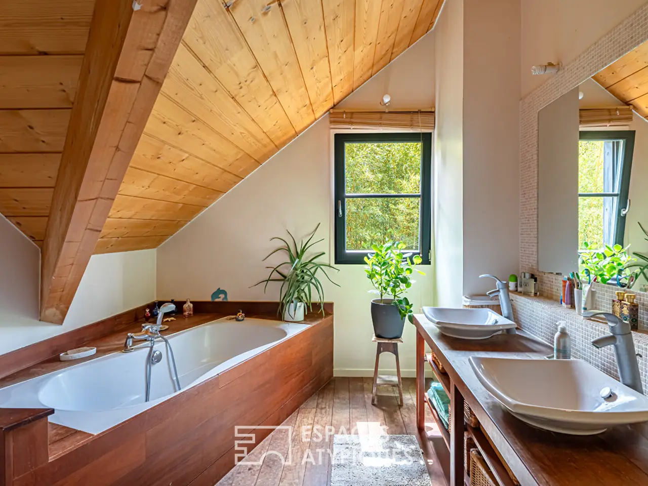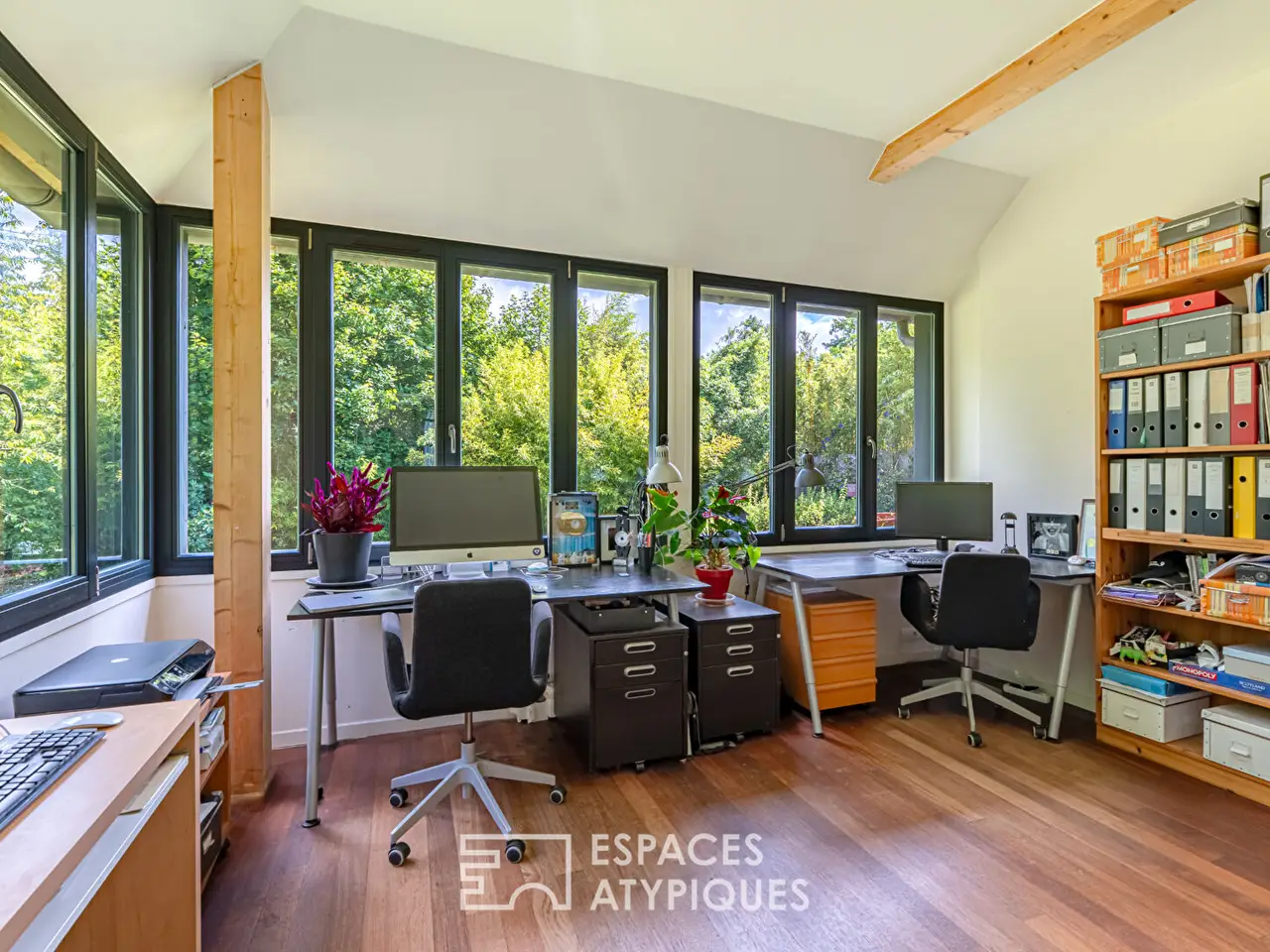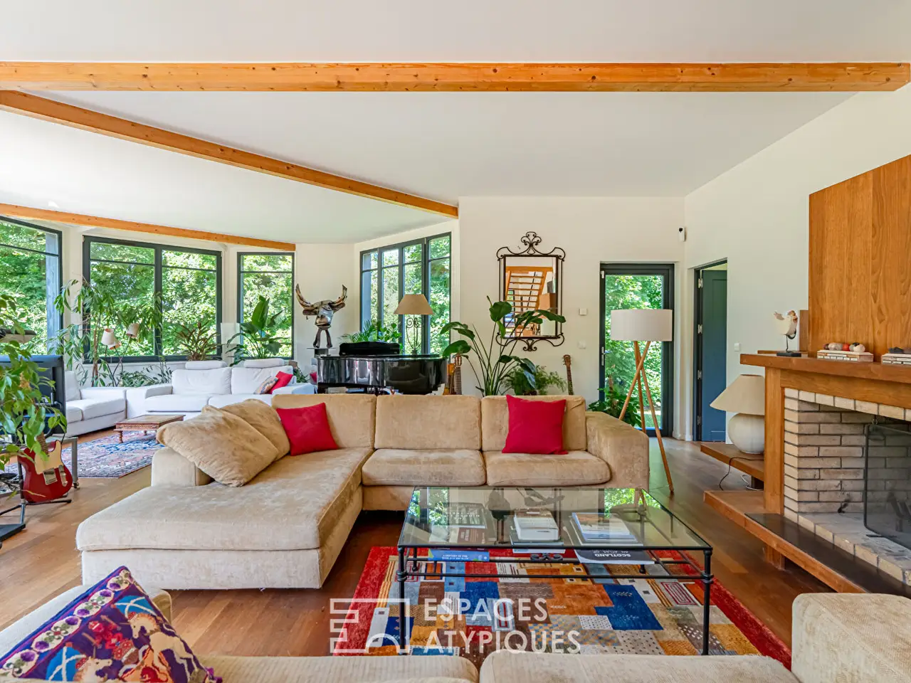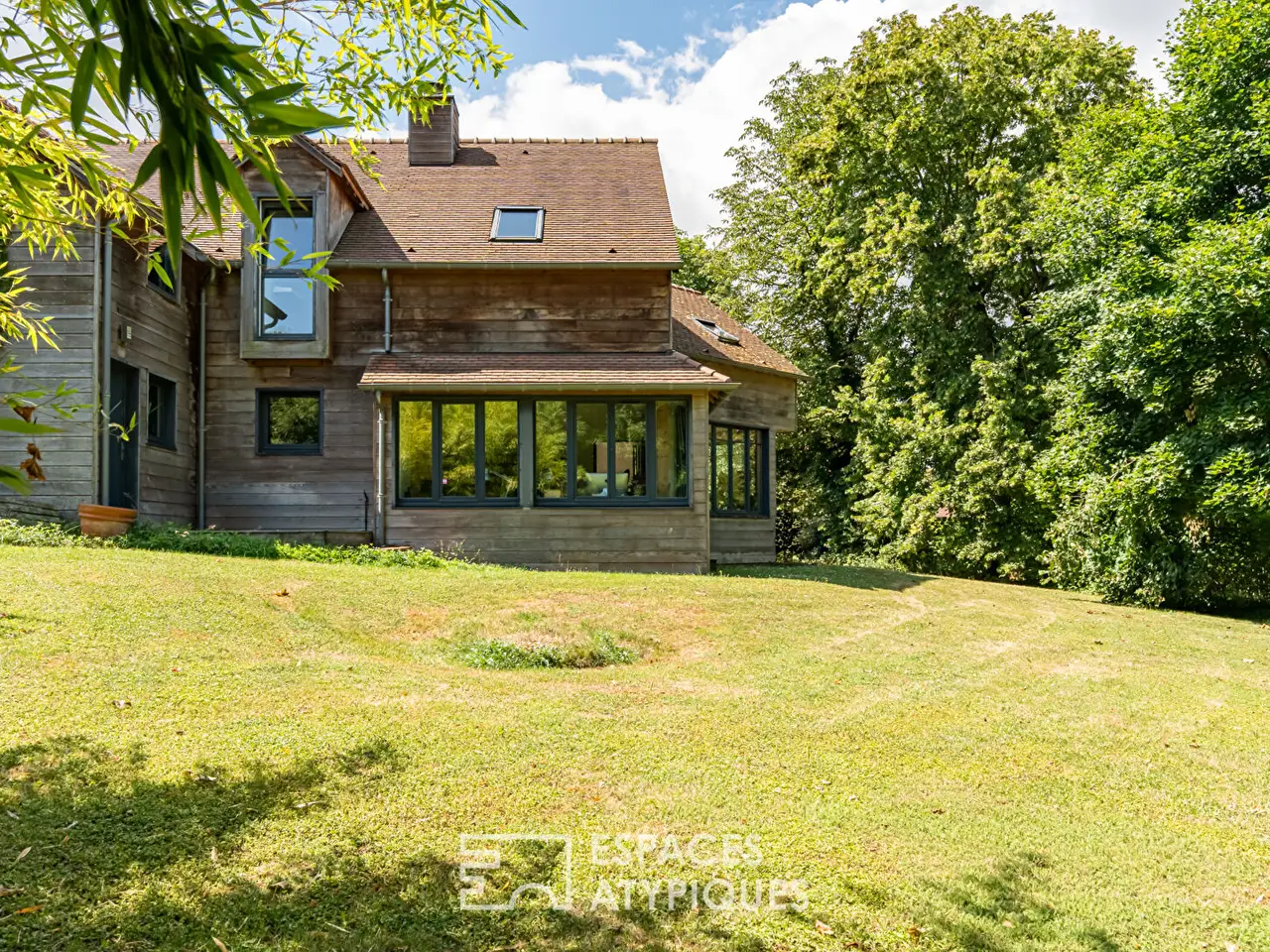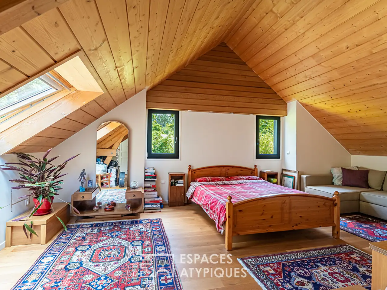 At the entrance to the authentic medieval village of Thiverval-Grignon, near Feucherolles and Crespieres, with easy access to the main roads leading quickly to Paris, lies a hidden gem of timber-frame construction imbued with environmental harmony, from which a pleasant quality of life immediately emerges. This 280 sqm architect-designed house, with a 120 sqm basement, offers, from the entrance to the 1900 sqm property, a comforting view of a pretty, unoverlooked landscaped garden. A little further on, a flamboyant building with red cedar cladding extends along its entire length into a warm wooden terrace. The unique contours of the construction make it a unique property, an exceptional property with an authentic feel. With large bay windows opening onto the garden, the house radiates light from the moment you cross the threshold. A living space then emerges, fluid, harmonious, and generous. The 31sqm bay window kitchen, discreetly set back but open to the living space, allows you to share meals in a bucolic and spacious setting. In its extension, the 24sqm living room has a very high ceiling, and in its aesthetically delineated continuity opens a 61sqm living room with its noble wood fireplace. These two rooms with merbau parquet flooring, facing southwest, open through their bay windows onto a large, friendly and pleasantly flowered terrace. In the extension of the living room, a discreet door invites you to settle into a magnificent 14sqm office in which work rhymes with serenity. This room with a soothing and generous view of the green spaces could also be used as an additional bedroom. The oak staircase leads to a landing which serves a mezzanine where it is pleasant to curl up. This level also distributes two large bedrooms, a shared bathroom, a third bedroom with a private shower room, and a spacious master suite with its dressing room and large private bathroom. Comfort is completed with a double garage, a very large modular basement (games room, home cinema, rehearsal or sports room), as well as a wine cellar. Equipped with efficient geothermal energy and recent photovoltaic panels, the house offers excellent energy efficiency. This contemporary setting combines the authenticity of a wooden property with modern architectural elegance, in a preserved setting, not far from schools, bus lines, and 2 minutes from a golf course and its exceptional sports club renowned for freedom & well-being.Living environment and accessibilitySchools in Thiverval-Grignon: Nursery school 'Les Érables' and elementary school 'Les Chenes'Middle and high schools: In Plaisir, Saint-Germain-en-Laye, Montfort l'Amaury, Beynes or Versailles (transport via bus or train stations)Shops / commercial areas: in Plaisir, les Clayes-sous-Bois accessible in 5-10 minutes by carPublic transport: bus lines: 12, 19, 4, 100, 27, school line TG and TAD Transport on demand Nearest station: Plaisir Grignon line N to Paris Montparnasse in 26 minutes Road axes: Fast access A14 for La Defense / Paris and A13 for Paris Porte d'Auteuil, A86 for Versailles, Velizy, Orly and duplex accessENERGY CLASS: B / CLIMATE CLASS: A Estimated average amount of annual energy expenditure for standard usage based on energy prices for 2021, 2022, 2023 (including subscriptions): between EUR2,020 and EUR2,770 per year.REF. 12033Additional information* 7 rooms* 5 bedrooms* 2 bathrooms* 1 bathroom* 1 floor in the building* Outdoor space : 1900 SQM* Property tax : 2 405 €Energy Performance CertificatePrimary energy consumptionb : 106 kWh/m2.yearHigh performance housing*A*106kWh/m2.year3*kg CO2/m2.yearB*C*D*E*F*GExtremely poor housing performance