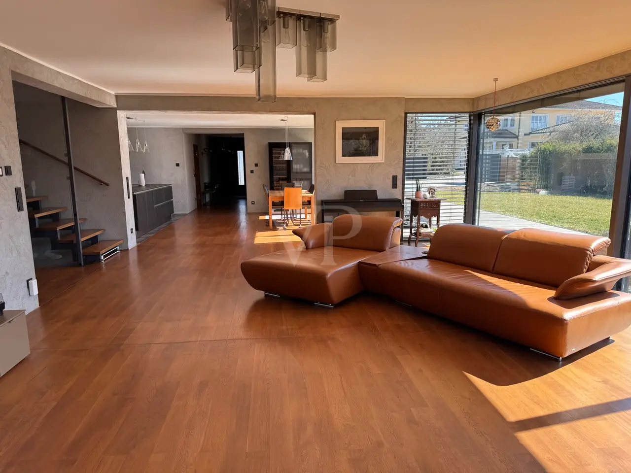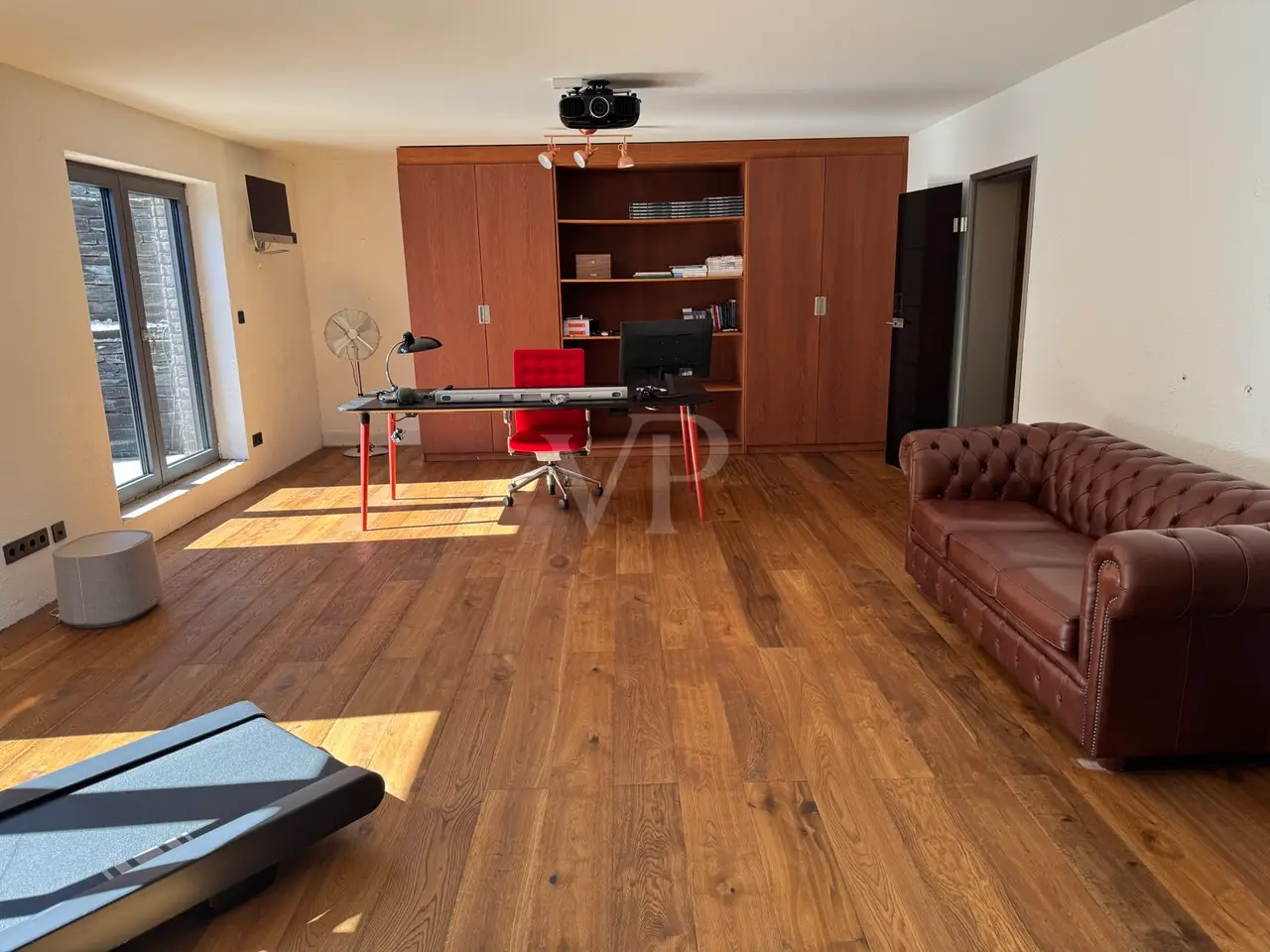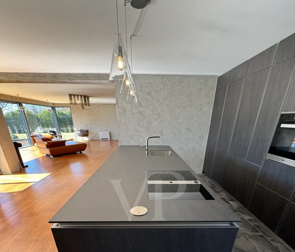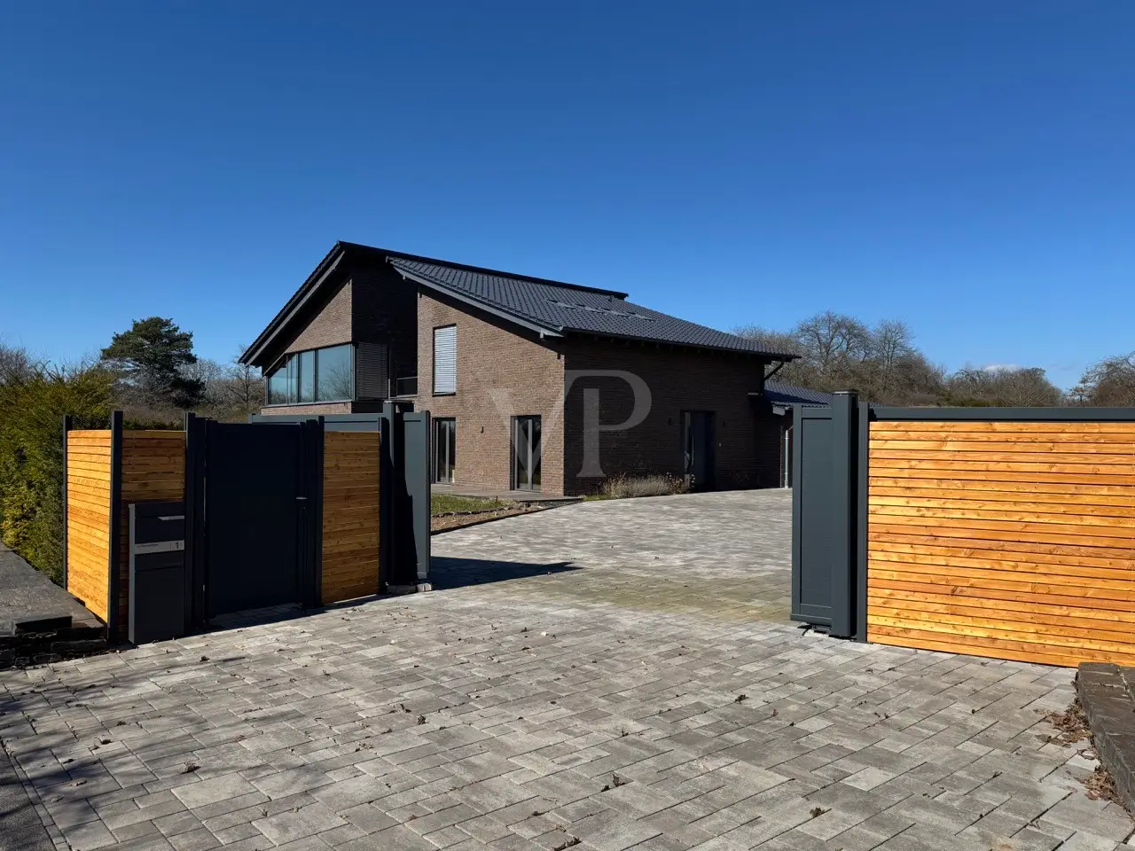 In a unique natural setting, we present this luxurious villa in an exclusive and sought-after location in a district of Idar-Oberstein with magnificent views of the countryside and landscape. This prestigious villa was built in solid construction between 2016 and 2017. Equipped with high-quality materials and supplemented by state-of-the-art technology, an absolute feel-good place has been created here, which offers maximum comfort, elegance and absolute privacy on approx. 411 m² of living space and 2,342 m² of land!!! This villa is entered through the entrance area, which is equipped with a built-in checkroom. Here is also direct access to the very large double garage (approx. 65 m²), which offers plenty of storage space. The hallway leads directly to the heart of the villa: a spacious, light-flooded living/dining/kitchen area with access to a sun terrace and a garden terrace. A feel-good area awaits you here with floor-to-ceiling windows that literally flood this area with natural light and provide a view of the front garden area and the sun terrace. The dining area is ideally planned for a long table. This means that larger parties are also possible. Connected to this area is the open kitchen with high-quality electrical appliances, two ovens, Bora extractor system, side-by-side fridge and free-standing wine fridge. Three further bedrooms, a daylight family bathroom and a daylight shower room round off this level perfectly. An elegant wooden staircase takes you to the upper floor. Your private area awaits you here: the very spacious master bedroom with impressive ceiling height, a large panoramic window with a wonderful view and a luxurious en-suite bathroom: the free-standing bathtub and shower with rain shower ensure a perfect wellness feeling. A large double washbasin, a WC and a bidet round off this bathroom. A beautiful wooden spiral staircase leads from this bedroom to your walk-in closet, which offers plenty of storage space. A glass passageway leads to another room on this level, which was used as an office. In the basement there is another large and bright room that could be used as an ideal fitness room. Here you can get active and then refresh yourself in the adjacent shower room with sauna. The technology and control system for the entire house has been brought together in one room in the basement. The spacious, level garden with children's play area is barely visible thanks to the surrounding hedges. It is very easy to maintain. The heated pool is ideal for exercising as it is equipped with a counter-current system. The double garage has an electric roller shutter door. The property offers several parking spaces for guests on the spacious driveway. The driveway is also equipped with an electric gate system. Experience this magical place, take a deep breath and enjoy the absolute tranquillity in this natural setting. Ideal for families and nature lovers!!! Feel free to contact us to get to know this dream villa in person soon!!! We look forward to seeing you!!!