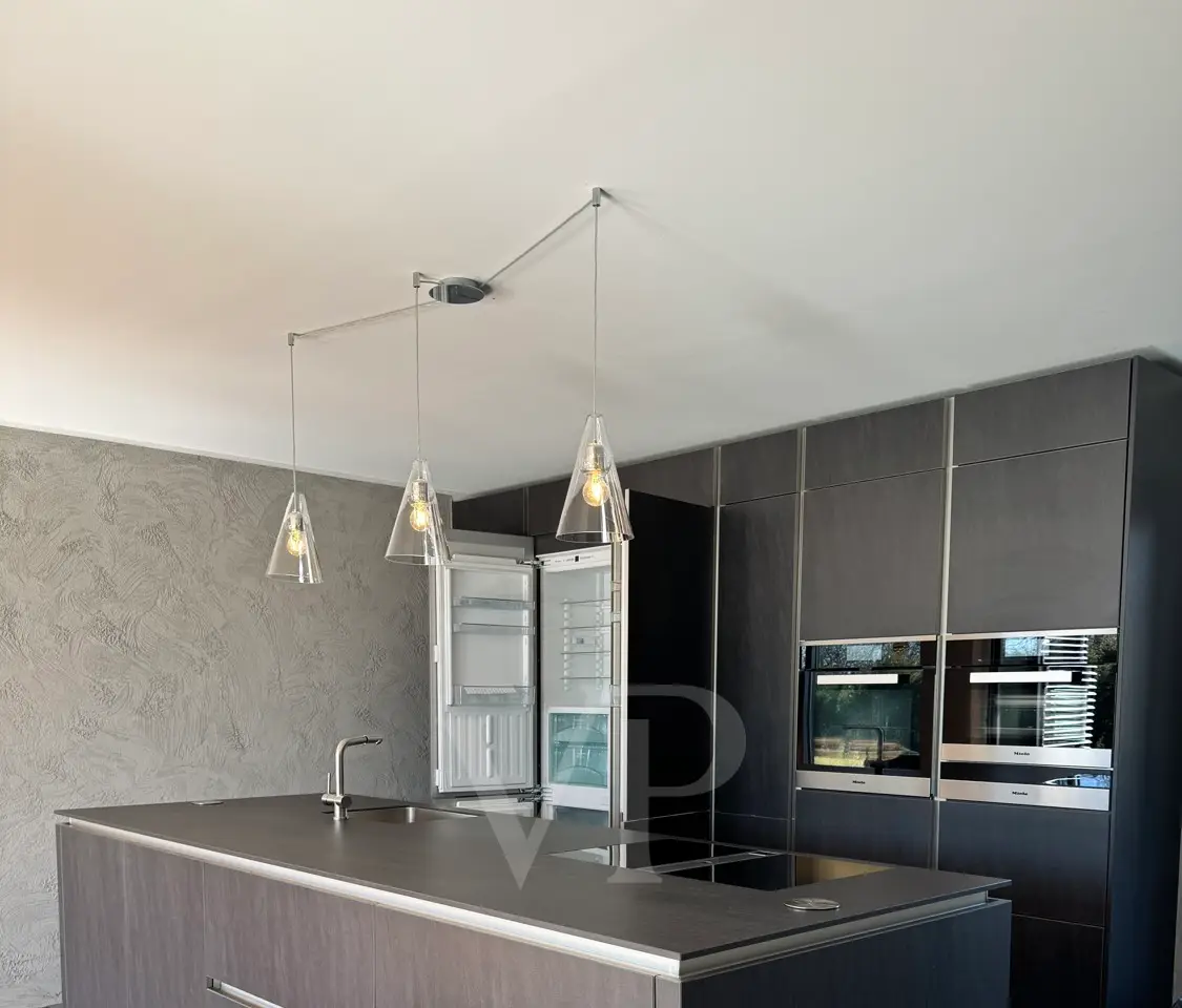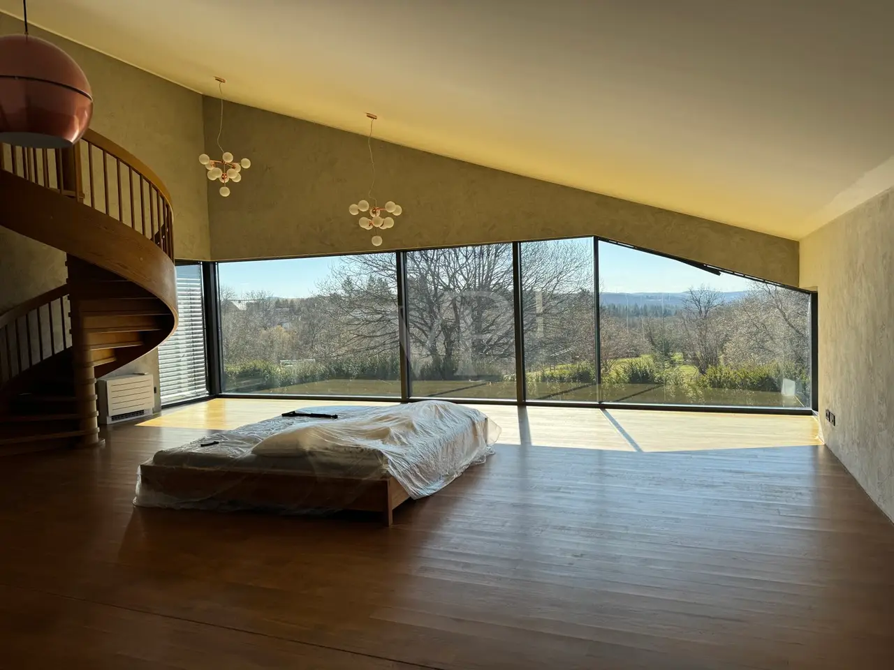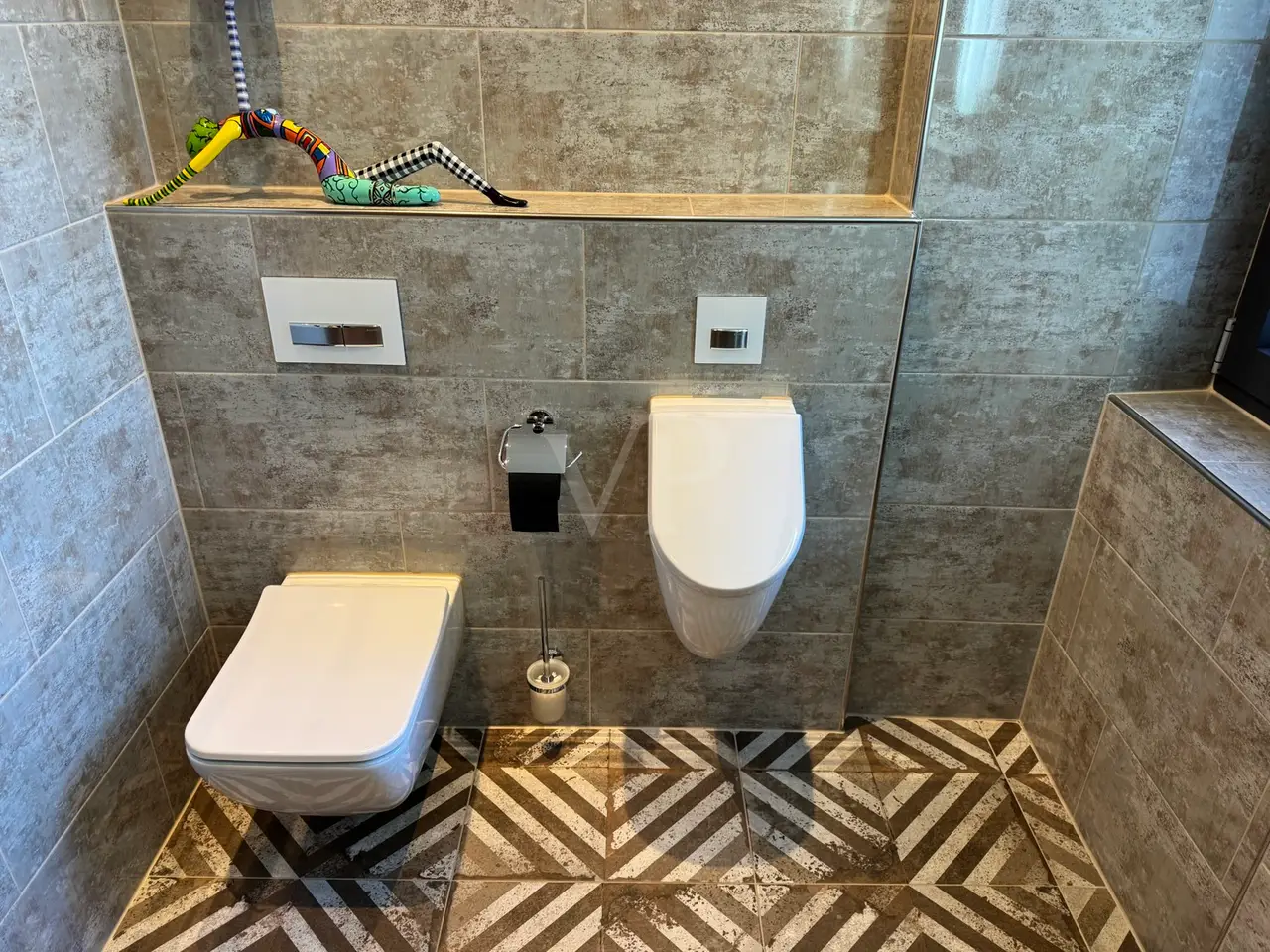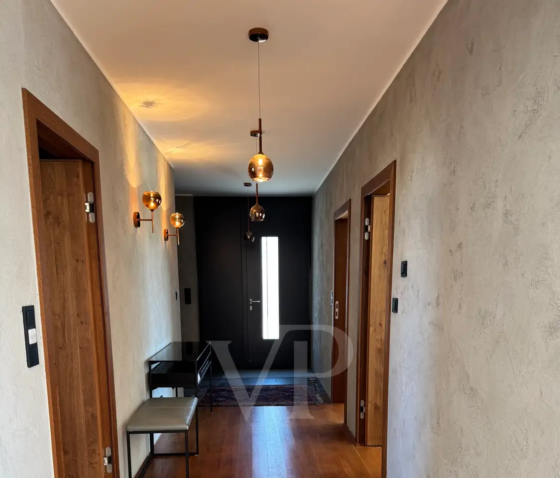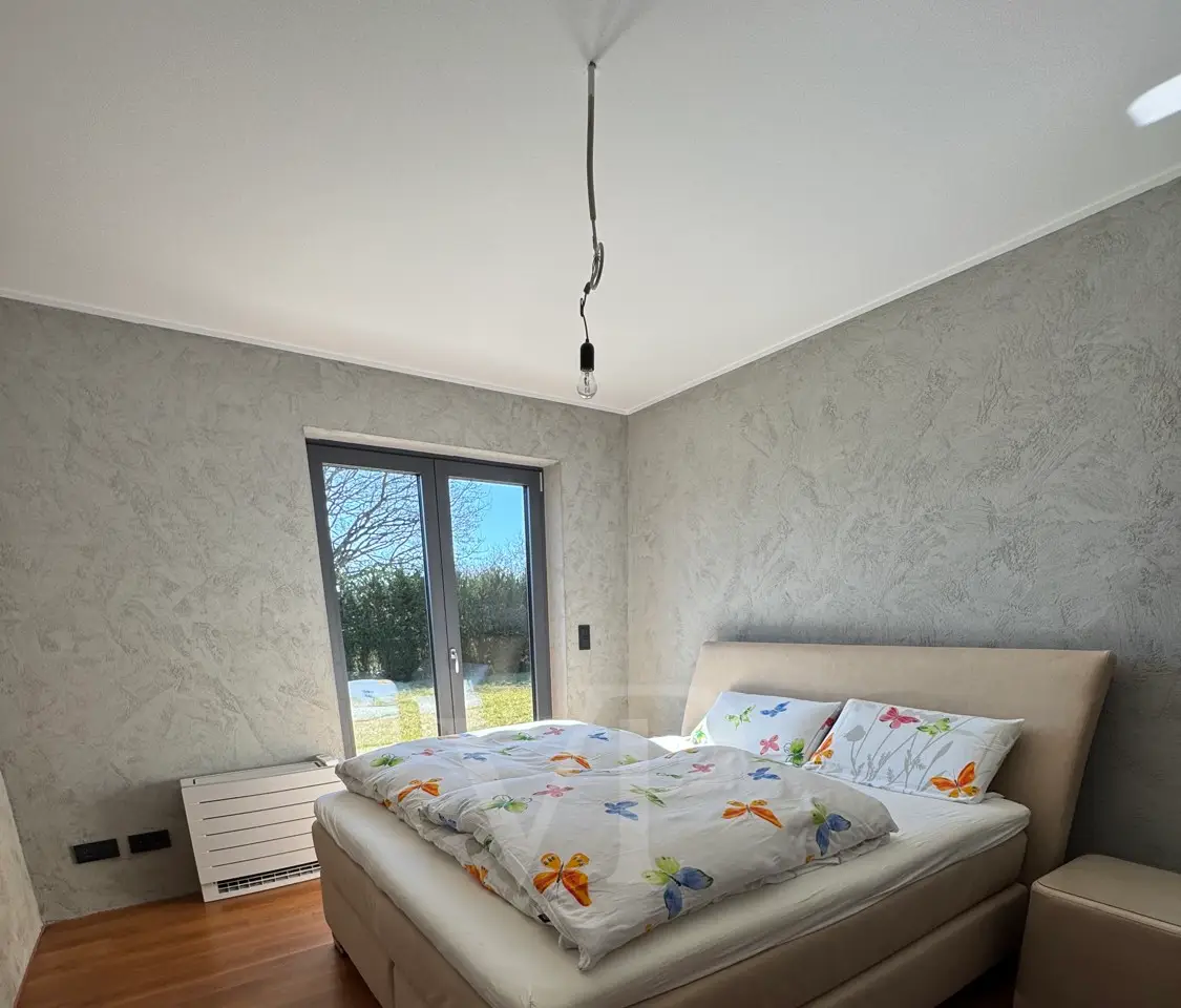 In a unique natural setting, we present this luxurious villa in an exclusive and sought-after location in a district of Idar-Oberstein with magnificent views of the countryside and landscape. This prestigious villa was built in solid construction between 2016 and 2017. Equipped with high-quality materials and supplemented by state-of-the-art technology, an absolute feel-good place has been created here, which offers maximum comfort, elegance and absolute privacy on approx. 411 m² of living space and 2,342 m² of land!!! This villa is entered through the entrance area, which is equipped with a built-in checkroom. Here is also direct access to the very large double garage (approx. 65 m²), which offers plenty of storage space. The hallway leads directly to the heart of the villa: a spacious, light-flooded living/dining/kitchen area with access to a sun terrace and a garden terrace. A feel-good area awaits you here with floor-to-ceiling windows that literally flood this area with natural light and provide a view of the front garden area and the sun terrace. The dining area is ideally planned for a long table. This means that larger parties are also possible. Connected to this area is the open kitchen with high-quality electrical appliances, two ovens, Bora extractor system, side-by-side fridge and free-standing wine fridge. Three further bedrooms, a daylight family bathroom and a daylight shower room round off this level perfectly. An elegant wooden staircase takes you to the upper floor. Your private area awaits you here: the very spacious master bedroom with impressive ceiling height, a large panoramic window with a wonderful view and a luxurious en-suite bathroom: the free-standing bathtub and shower with rain shower ensure a perfect wellness feeling. A large double washbasin, a WC and a bidet round off this bathroom. A beautiful wooden spiral staircase leads from this bedroom to your walk-in closet, which offers plenty of storage space. A glass passageway leads to another room on this level, which was used as an office. In the basement there is another large and bright room that could be used as an ideal fitness room. Here you can get active and then refresh yourself in the adjacent shower room with sauna. The technology and control system for the entire house has been brought together in one room in the basement. The spacious, level garden with children's play area is barely visible thanks to the surrounding hedges. It is very easy to maintain. The heated pool is ideal for exercising as it is equipped with a counter-current system. The double garage has an electric roller shutter door. The property offers several parking spaces for guests on the spacious driveway. The driveway is also equipped with an electric gate system. Experience this magical place, take a deep breath and enjoy the absolute tranquillity in this natural setting. Ideal for families and nature lovers!!! Feel free to contact us to get to know this dream villa in person soon!!! We look forward to seeing you!!!