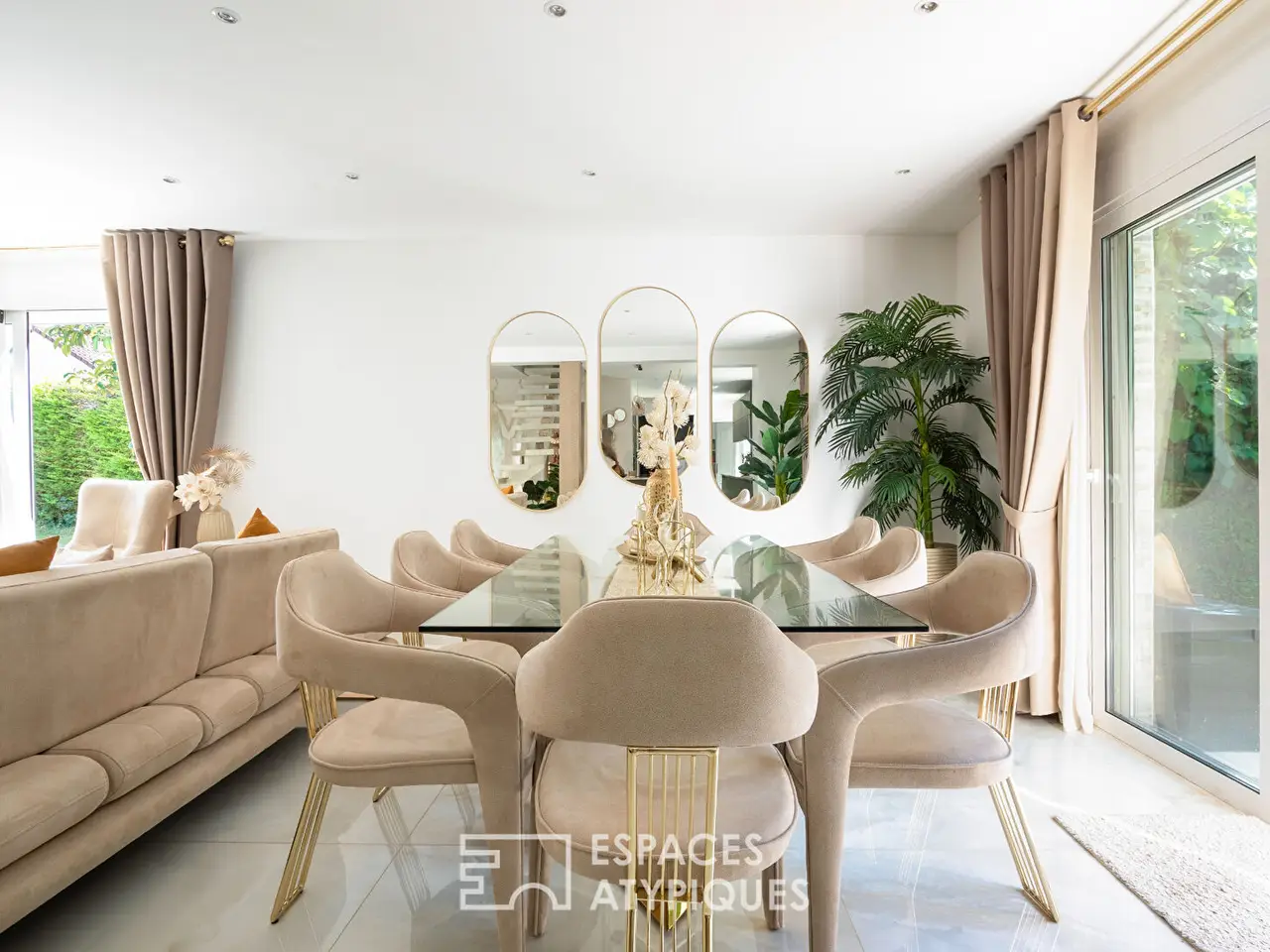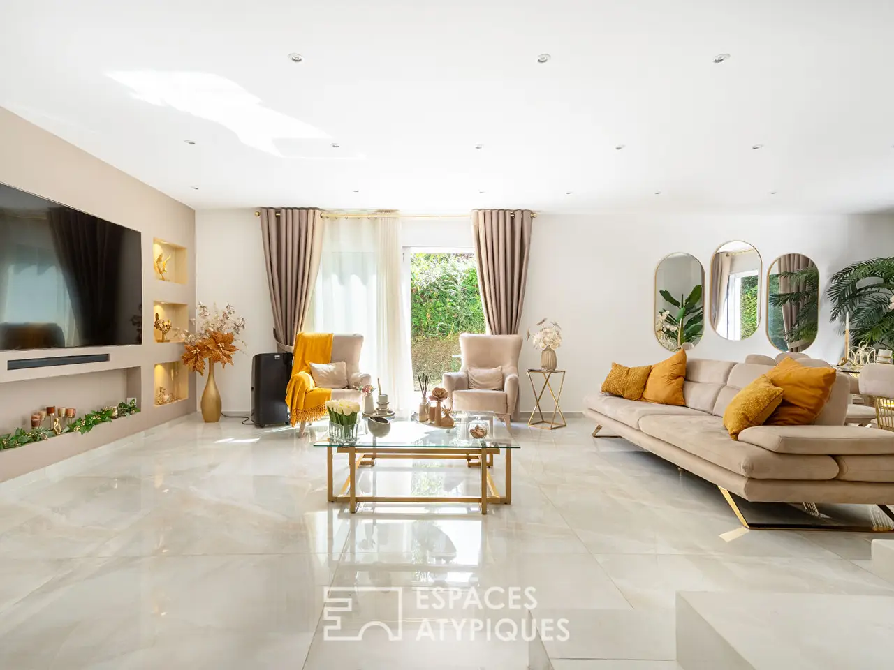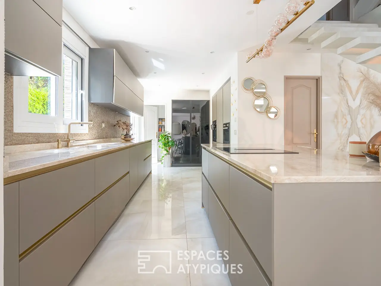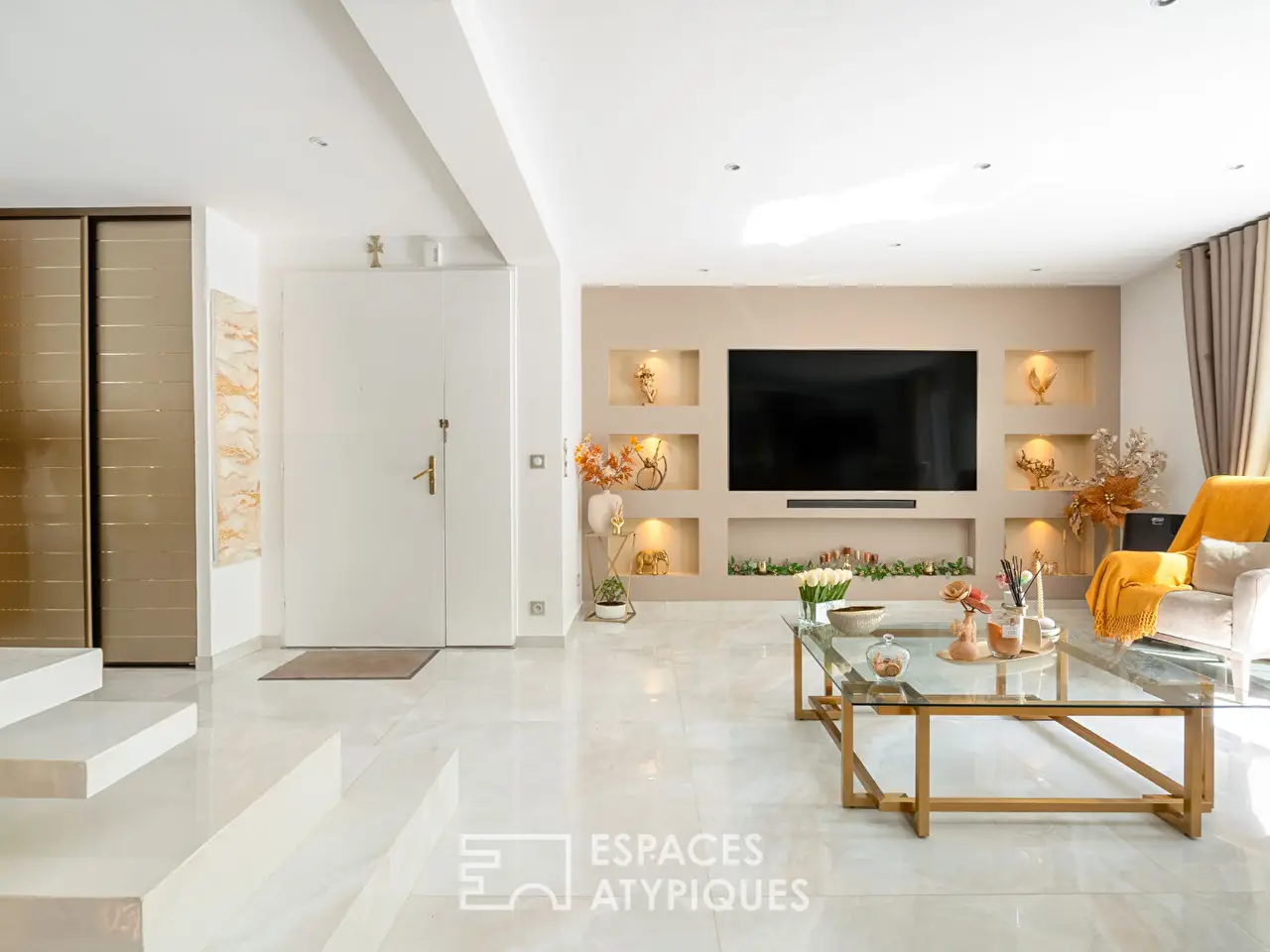 In Thiais, in the sought-after Green Valley development, this 180 m2 family home, completely redesigned by its owners, offers a refined yet welcoming living experience. Nestled on a 587 m2 plot, its understated, elegant lines stand out in a quiet residential area, just a stone's throw from schools and amenities. From the moment you enter, the atmosphere is striking: polished stone floors, powdery colours, a high-end feel and omnipresent light reveal an interior that has been treated with the utmost care. The vast living space, which runs through the property and is bathed in light, plays on transparency and reflections. It features a cosy lounge facing an integrated screen wall, a convivial dining room and a contemporary open-plan kitchen with minimalist lines and fully equipped. The whole space flows harmoniously into the garden, which is not overlooked, offering a natural and intimate extension on sunny days. A pantry, separate WC and garage complete the ground floor facilities. In the centre of the room, a sculptural staircase, seemingly suspended, creates a graphic transition to the upper floor. This level offers two bedrooms with storage space, a shower room with WC, a laundry area, and a sumptuous 40 m2 master suite with a custom-made dressing room and double sink shower room. The top floor houses a fourth bedroom with its own shower room, as well as an attic offering additional storage space. On the practical side, the house is located just a few minutes' walk from: - Nursery, pre-school, primary school, secondary school and sixth form college. - Shops and TVM. - Close to Thiais Village and Belle Épine shopping centre. This house charms with its tranquillity, its complete renovation in a soothing contemporary style, and its functionality designed for the everyday life of a modern family. The house is located in a residential development with quarterly service charges. REF. 12629 Additional information * 6 rooms * 4 bedrooms * 3 shower rooms * 2 floors in the building * Outdoor space : 587 SQM * Parking : 3 parking spaces * Property tax : 2 631 € Energy Performance Certificate Primary energy consumption d : 200 kWh/m2.year High performance housing