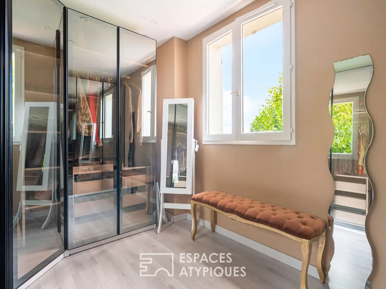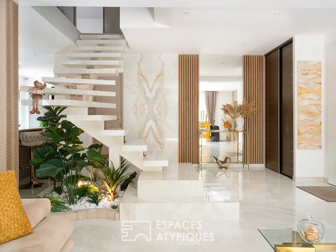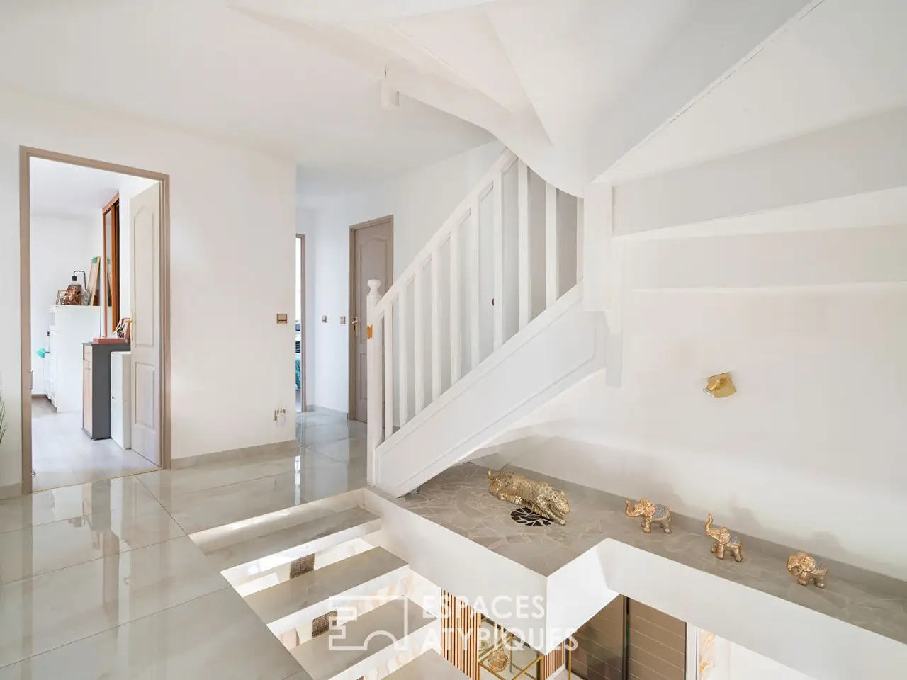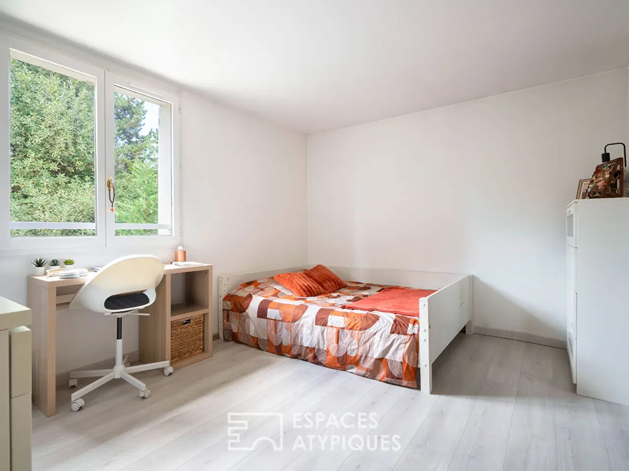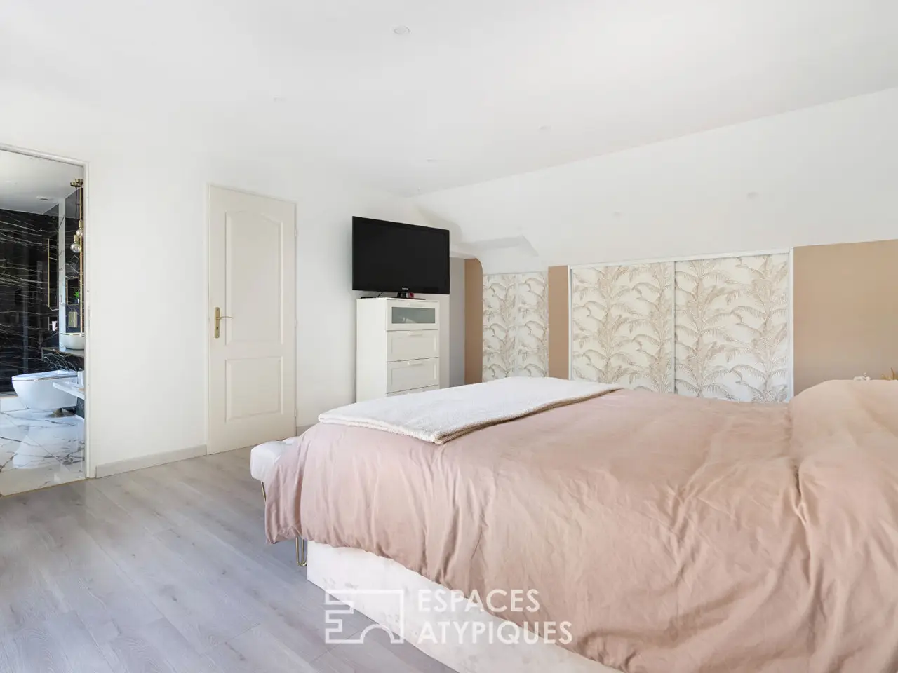 In Thiais, in the sought-after Green Valley development, this 180 m2 family home, completely redesigned by its owners, offers a refined yet welcoming living experience. Nestled on a 587 m2 plot, its understated, elegant lines stand out in a quiet residential area, just a stone's throw from schools and amenities. From the moment you enter, the atmosphere is striking: polished stone floors, powdery colours, a high-end feel and omnipresent light reveal an interior that has been treated with the utmost care. The vast living space, which runs through the property and is bathed in light, plays on transparency and reflections. It features a cosy lounge facing an integrated screen wall, a convivial dining room and a contemporary open-plan kitchen with minimalist lines and fully equipped. The whole space flows harmoniously into the garden, which is not overlooked, offering a natural and intimate extension on sunny days. A pantry, separate WC and garage complete the ground floor facilities. In the centre of the room, a sculptural staircase, seemingly suspended, creates a graphic transition to the upper floor. This level offers two bedrooms with storage space, a shower room with WC, a laundry area, and a sumptuous 40 m2 master suite with a custom-made dressing room and double sink shower room. The top floor houses a fourth bedroom with its own shower room, as well as an attic offering additional storage space. On the practical side, the house is located just a few minutes' walk from: - Nursery, pre-school, primary school, secondary school and sixth form college. - Shops and TVM. - Close to Thiais Village and Belle Épine shopping centre. This house charms with its tranquillity, its complete renovation in a soothing contemporary style, and its functionality designed for the everyday life of a modern family. The house is located in a residential development with quarterly service charges. REF. 12629 Additional information * 6 rooms * 4 bedrooms * 3 shower rooms * 2 floors in the building * Outdoor space : 587 SQM * Parking : 3 parking spaces * Property tax : 2 631 € Energy Performance Certificate Primary energy consumption d : 200 kWh/m2.year High performance housing
