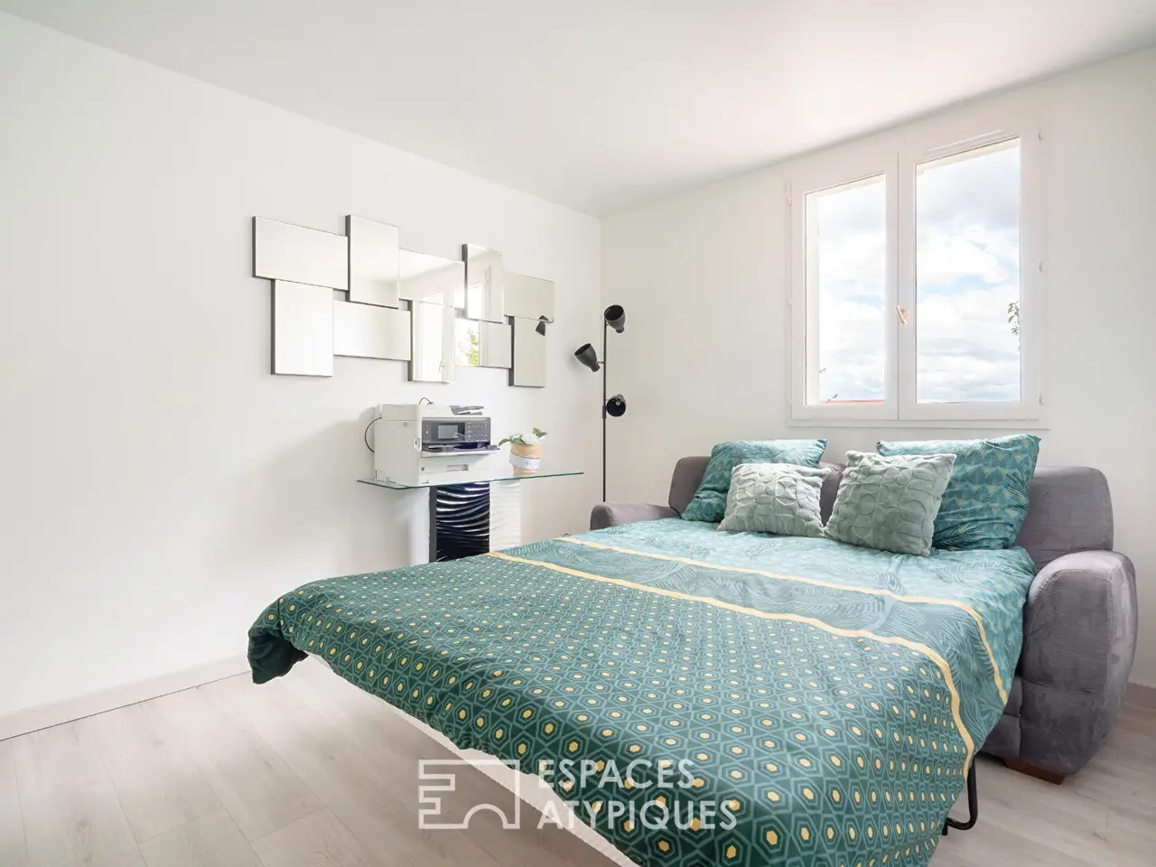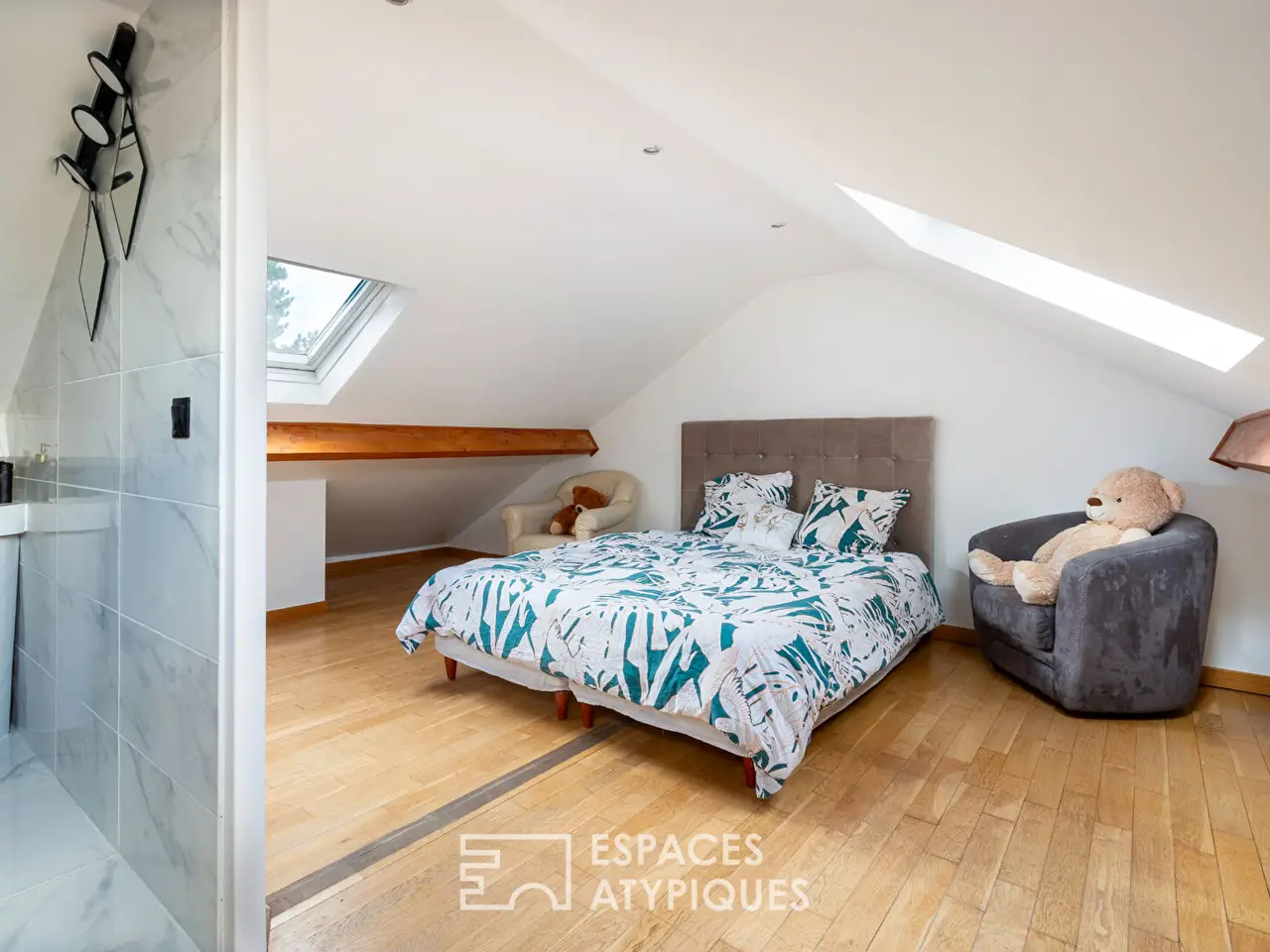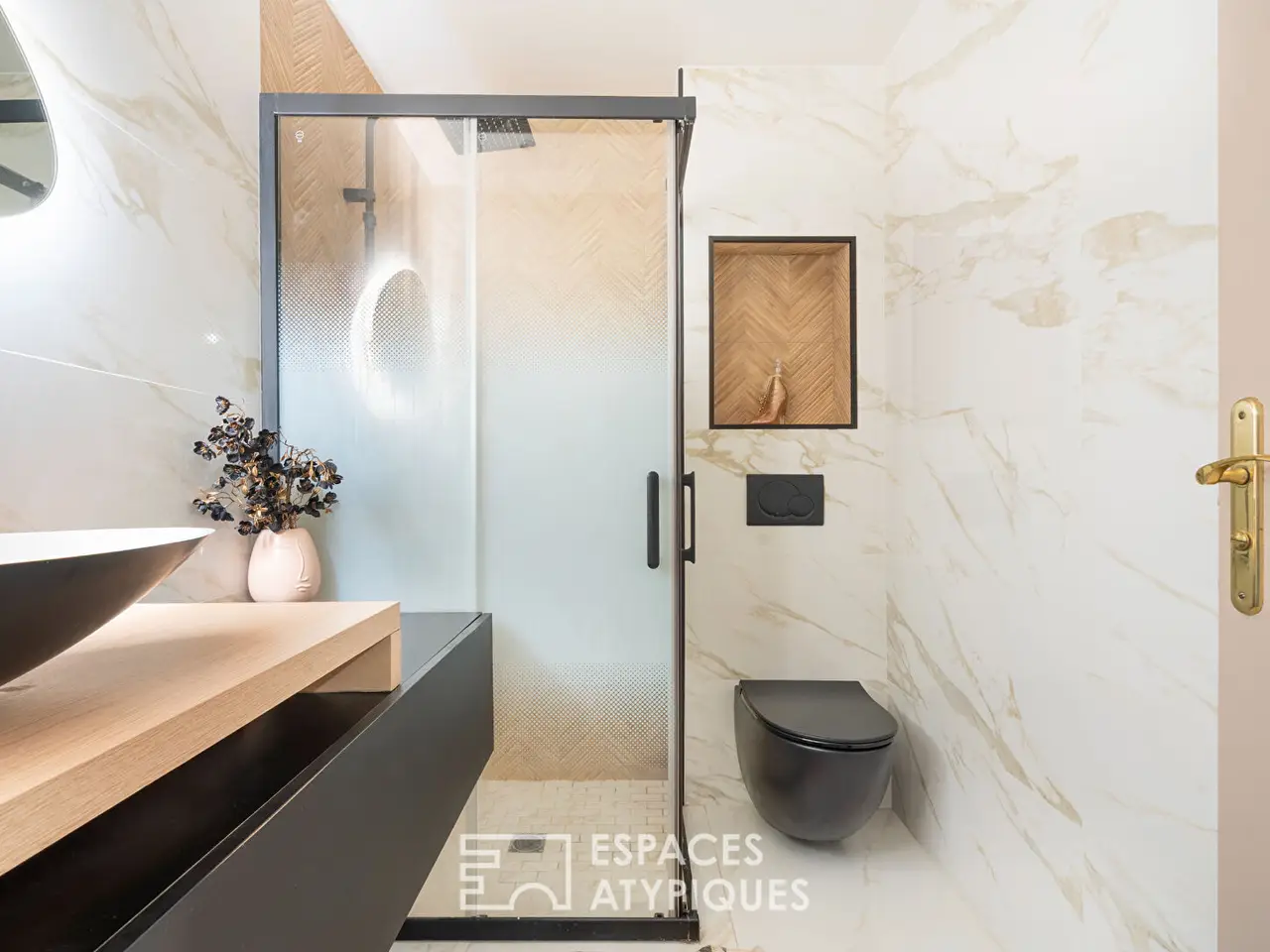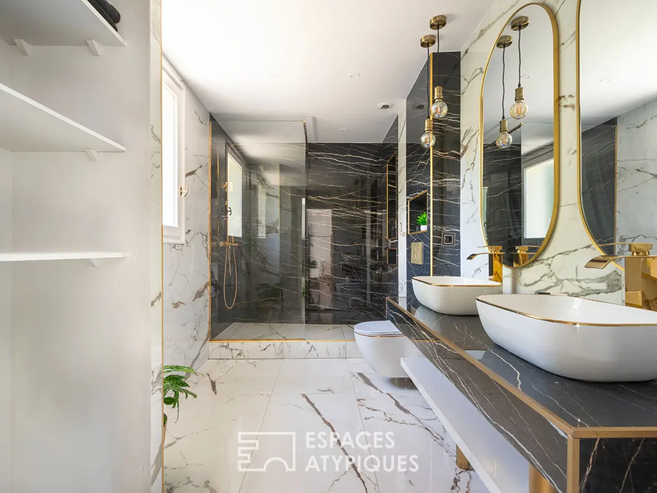 In Thiais, in the sought-after Green Valley development, this 180 m2 family home, completely redesigned by its owners, offers a refined yet welcoming living experience. Nestled on a 587 m2 plot, its understated, elegant lines stand out in a quiet residential area, just a stone's throw from schools and amenities. From the moment you enter, the atmosphere is striking: polished stone floors, powdery colours, a high-end feel and omnipresent light reveal an interior that has been treated with the utmost care. The vast living space, which runs through the property and is bathed in light, plays on transparency and reflections. It features a cosy lounge facing an integrated screen wall, a convivial dining room and a contemporary open-plan kitchen with minimalist lines and fully equipped. The whole space flows harmoniously into the garden, which is not overlooked, offering a natural and intimate extension on sunny days. A pantry, separate WC and garage complete the ground floor facilities. In the centre of the room, a sculptural staircase, seemingly suspended, creates a graphic transition to the upper floor. This level offers two bedrooms with storage space, a shower room with WC, a laundry area, and a sumptuous 40 m2 master suite with a custom-made dressing room and double sink shower room. The top floor houses a fourth bedroom with its own shower room, as well as an attic offering additional storage space. On the practical side, the house is located just a few minutes' walk from: - Nursery, pre-school, primary school, secondary school and sixth form college. - Shops and TVM. - Close to Thiais Village and Belle Épine shopping centre. This house charms with its tranquillity, its complete renovation in a soothing contemporary style, and its functionality designed for the everyday life of a modern family. The house is located in a residential development with quarterly service charges. REF. 12629 Additional information * 6 rooms * 4 bedrooms * 3 shower rooms * 2 floors in the building * Outdoor space : 587 SQM * Parking : 3 parking spaces * Property tax : 2 631 € Energy Performance Certificate Primary energy consumption d : 200 kWh/m2.year High performance housing