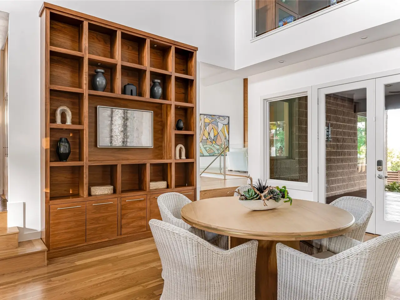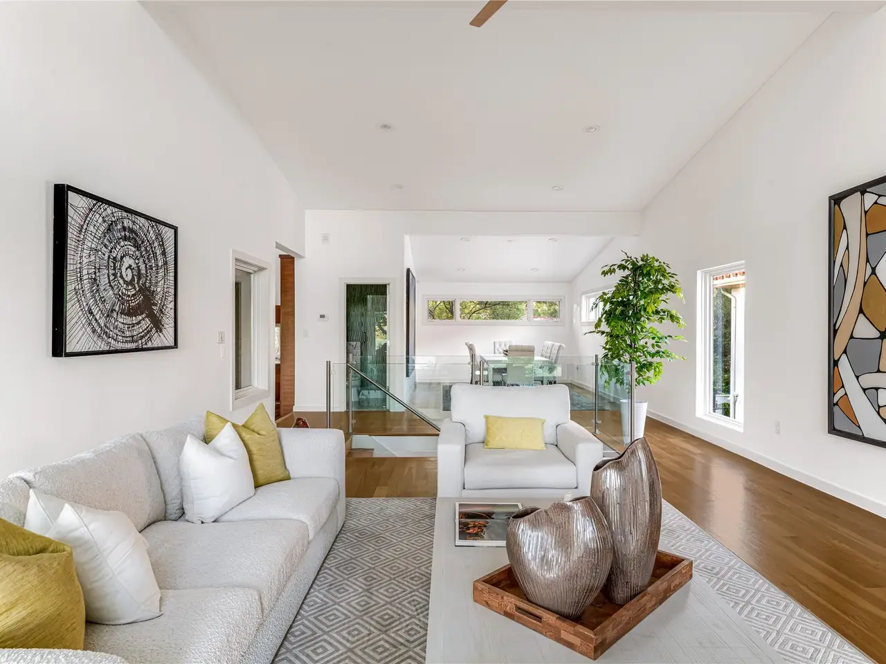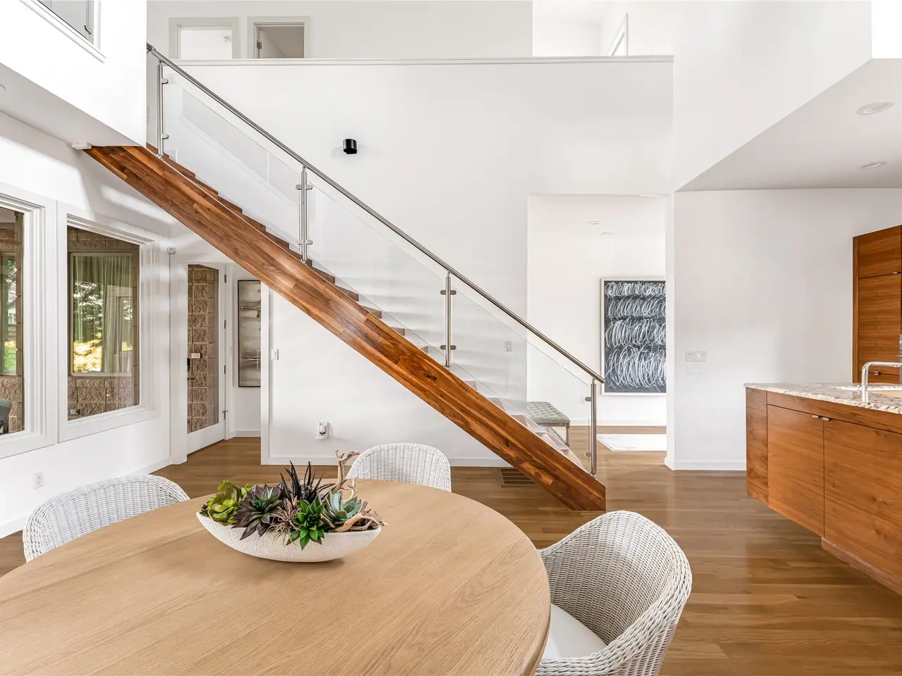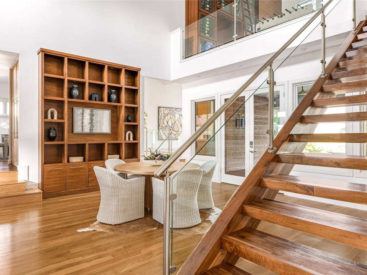 • Floating, glass-railed staircases adding understated drama