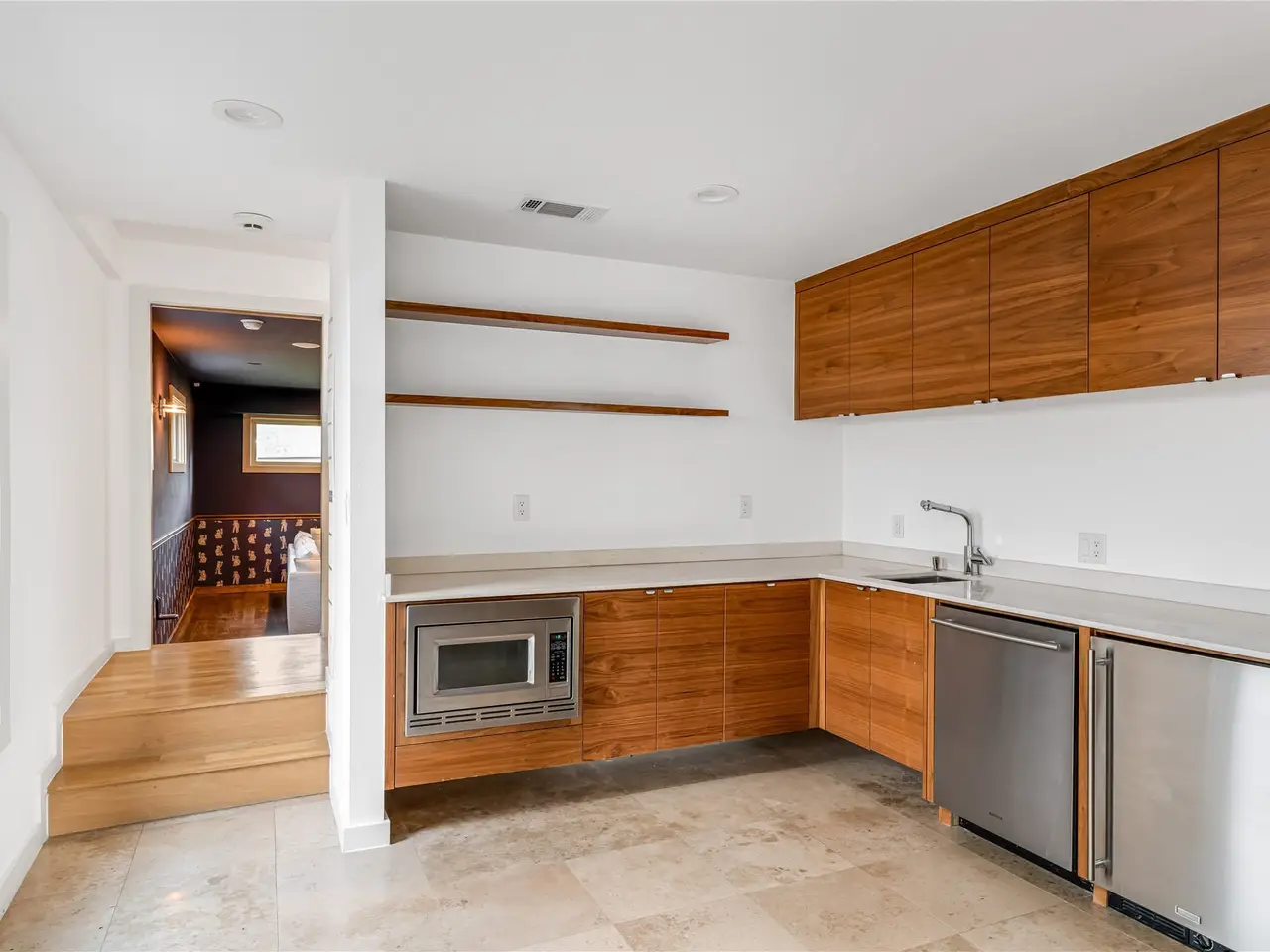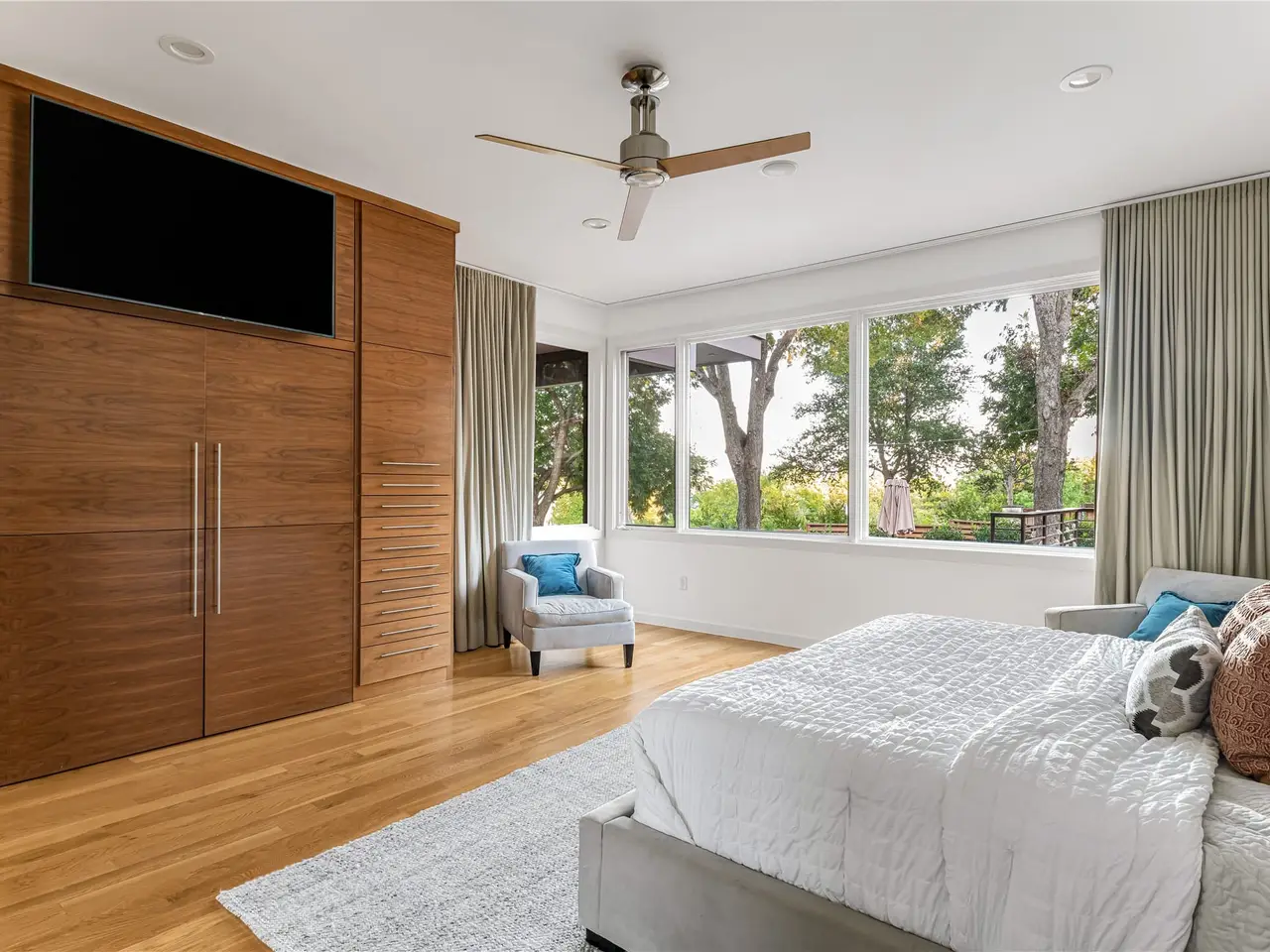 • Custom walnut cabinets with grain matching for harmony and balance