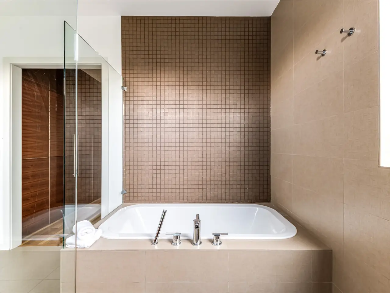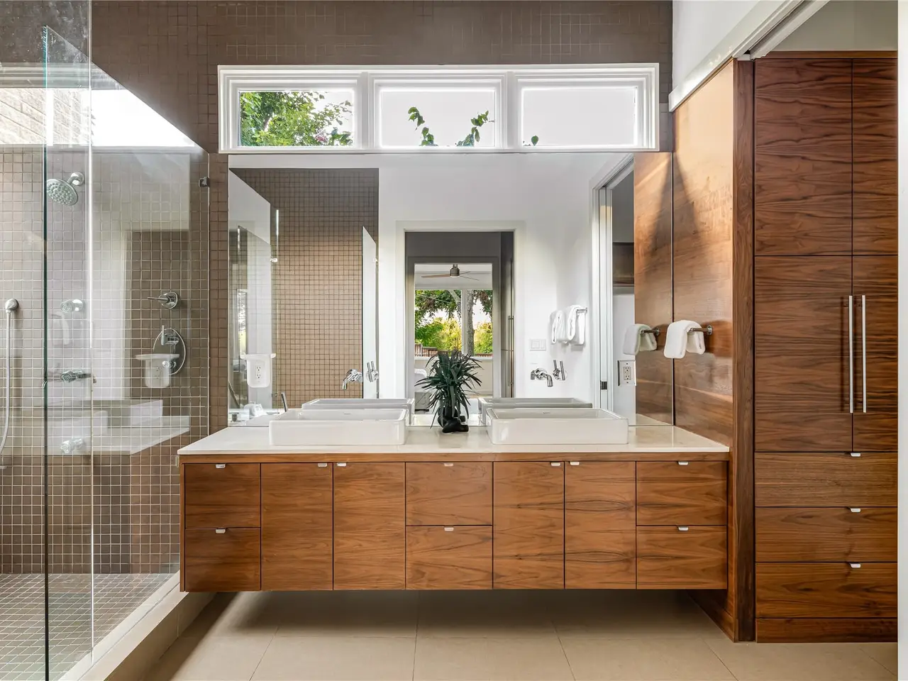 • Serene primary bathroom with grain-matched cabinetry