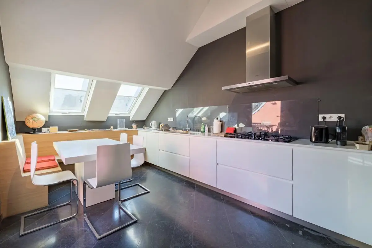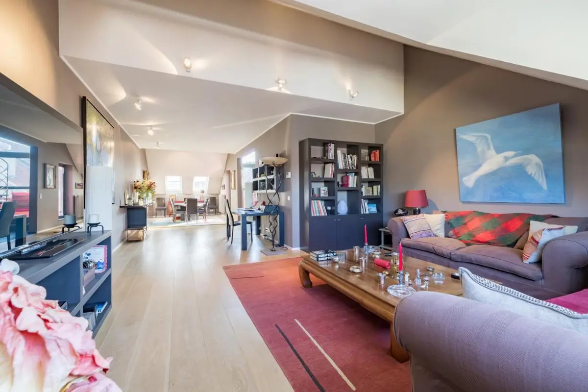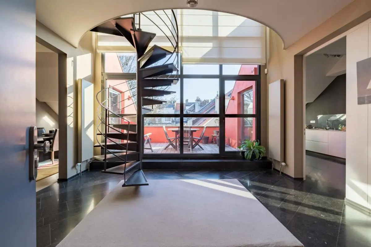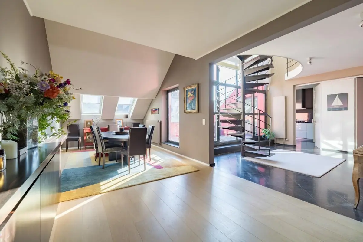 In a quiet street in the Louise district, very close to Place Stéphanie, magnificent duplex penthouse renovated by architect Joël Claisse, approximately 208 square meters plus approximately 14 square meter terrace, on the 3rd and 4th floors of a beautiful manor house. Large reception room, fully equipped kitchen, three bedrooms including a large master suite, two bathrooms. Two parking spaces. Cellar. EPC F (despite very good insulation).