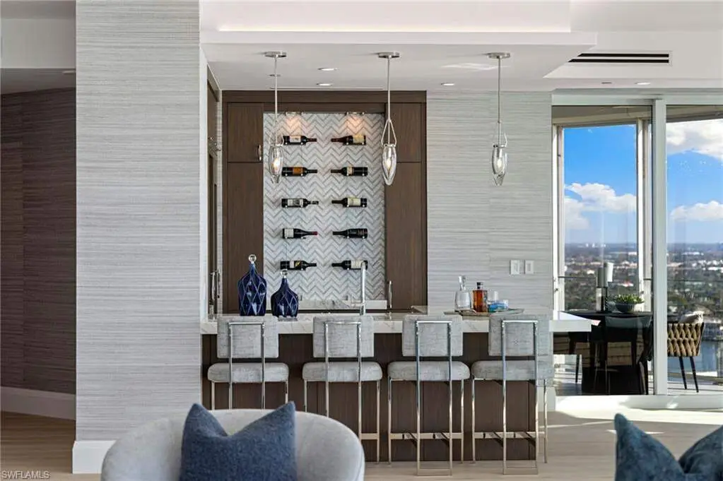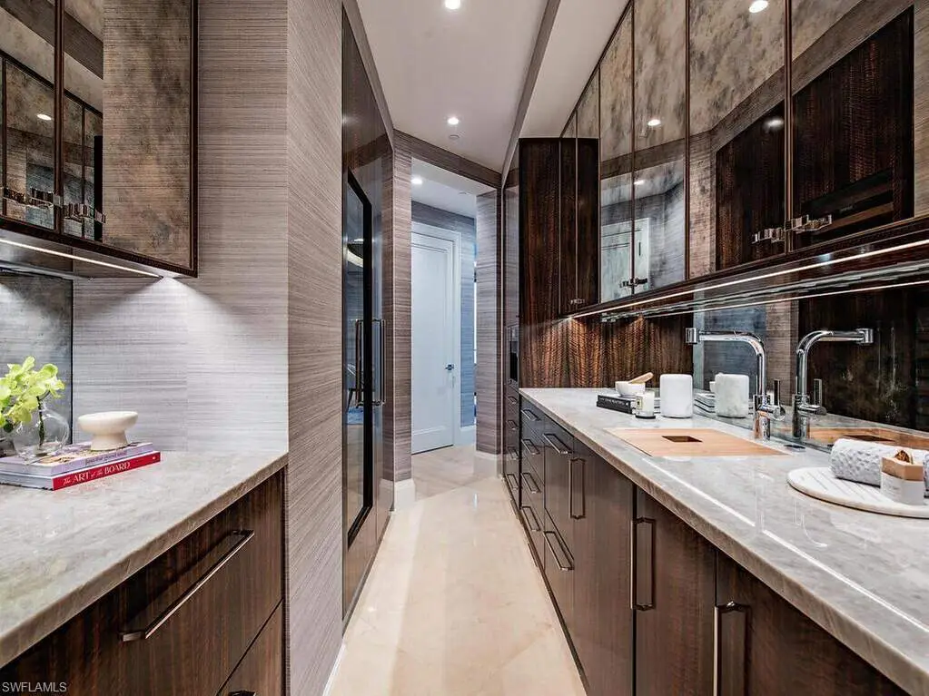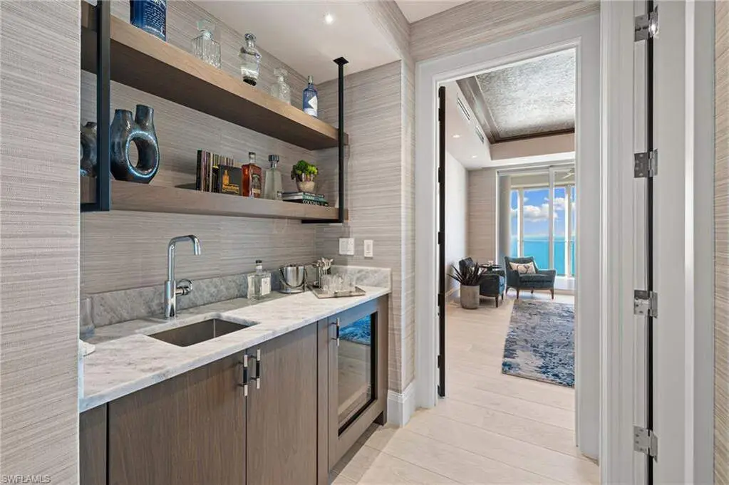 Since inception, residences at The Regent have been synonymous with luxury, yet no other offering has exhibited such quality, efficiency, and superior design as this. The "no expense spared" remastering of this gulf-front penthouse was a collaboration of the locally favored Borelli Construction and Calusa Bay Design, and personifies a sleek yet comfortable elegance that is rarely achieved. Encompassing over 12,100-plus square feet of living space, the residence includes multiple spacious living areas, an entertainment bar, five bedrooms, one of which hosts a kitchenette and is ideal for extended guests / live-in aide, five full and two half bathrooms, a richly outfitted study and private bar, a theater room, a club room equipped with a private fitness studio, nearly 1,700 square feet of outdoor terraces, as well as a rarely-found three-car garage. The truly gourmet kitchen was designed by renowned Mick DeGiulio and hosts fumed-eucalyptus custom cabinetry, brand-new top-tier gas appliances, a Galley sink, and precious stone countertops. Tucked away and offering the utmost in privacy, the master retreat exceeds the standards of luxury with its scenic sugar sand vistas, ample space for relaxation, as well as its truly luxurious His / Her bathrooms and dressing rooms. While it is impossible to name every enhancement in this comprehensive renovation, a few notable features include white oak flooring, a water-vapor fireplace, as well as luxurious wall coverings, and custom millwork throughout. Life at the Regent is a testament to refined living, as residents benefit from being only steps to the calm, turquoise waters of the Gulf of Mexico and Venetian Village, as well as only a mere few minutes from Waterside Shoppes and all that Downtown Naples has to offer.