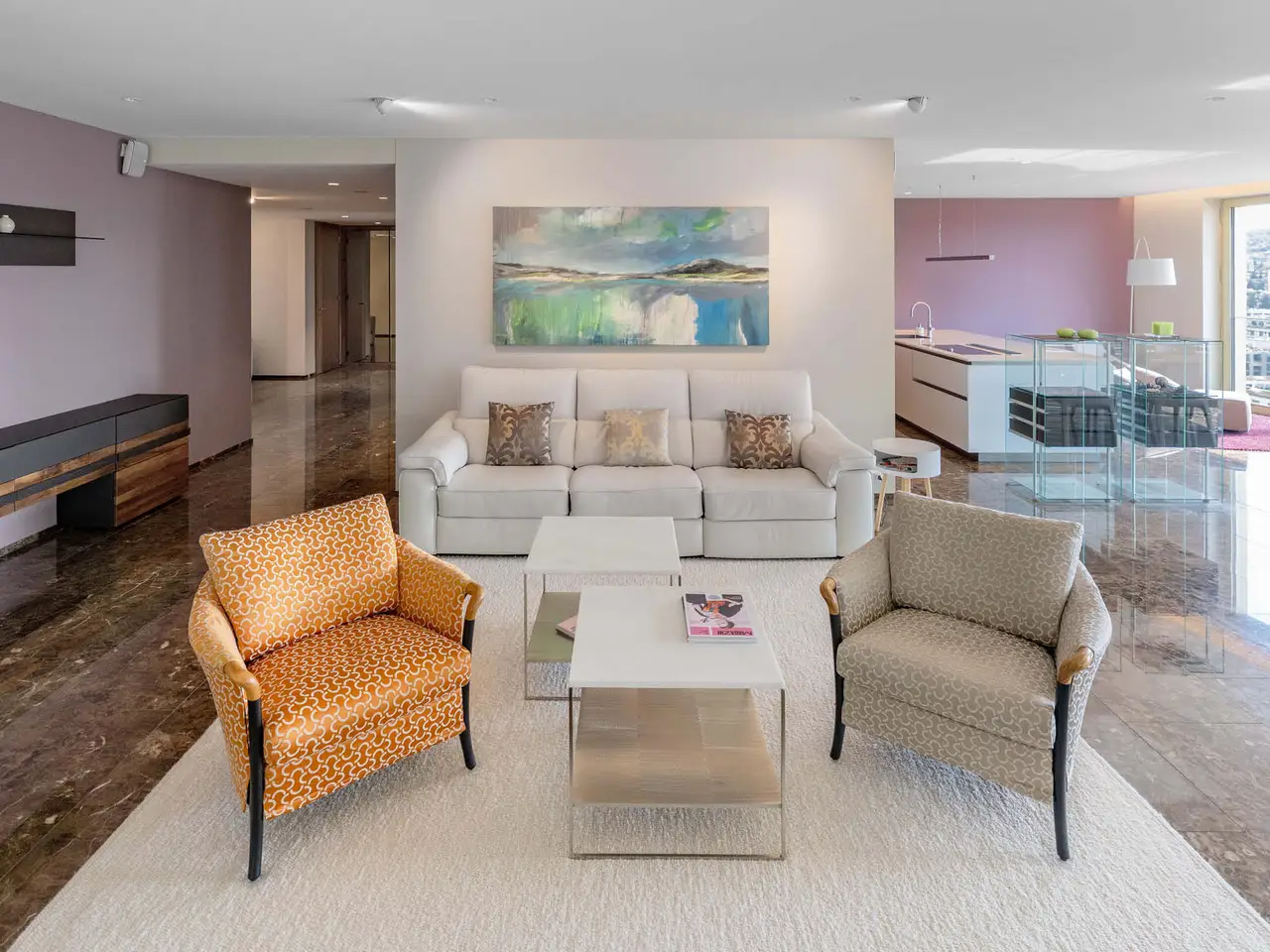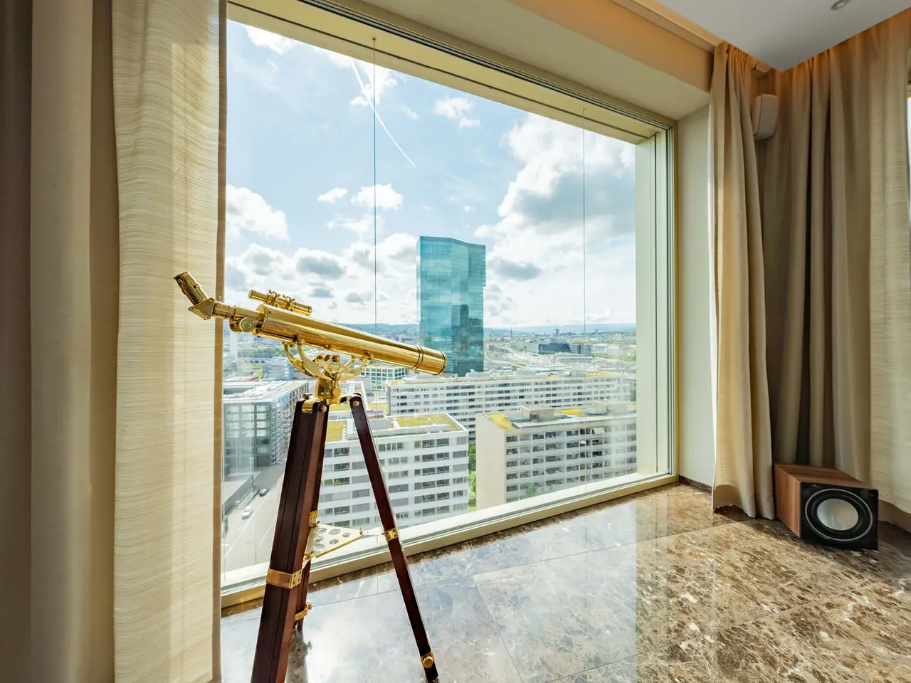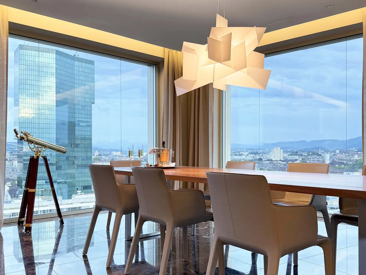 Elevated high above the vibrant cityscape, this extraordinary 5.5-room residence offers refined urban living in Zurich’s iconic Renaissance Tower. Located on the 15th floor, the approximately 300 m² apartment combines panoramic views, modern loft-like architecture, and an unbeatable city location. The expansive living area with floor-to-ceiling windows flows seamlessly into a sleek, designer kitchen—perfect for both entertaining and everyday luxury. Two beautifully appointed bedrooms each feature ensuite bathrooms and soaring ceilings, with one oriented southwest and the other facing east from the entry hall. A sliding door reveals a stylish study or library adjacent to the main living space. A spacious utility room completes the layout, offering comfort and practicality. Zurich’s Hardbrücke train station and tram line 4 are just steps away, providing direct access to the main station and city center. The nearby highway connects you swiftly to the lake, mountains, and Zurich Airport—just 20 minutes away. Designed by the acclaimed Swiss firm Diener & Diener and completed in 2011, the 81-meter Renaissance Tower blends private luxury living with the semi-public amenities of the Renaissance Tower Hotel, making it a bold architectural landmark in Zurich-West.