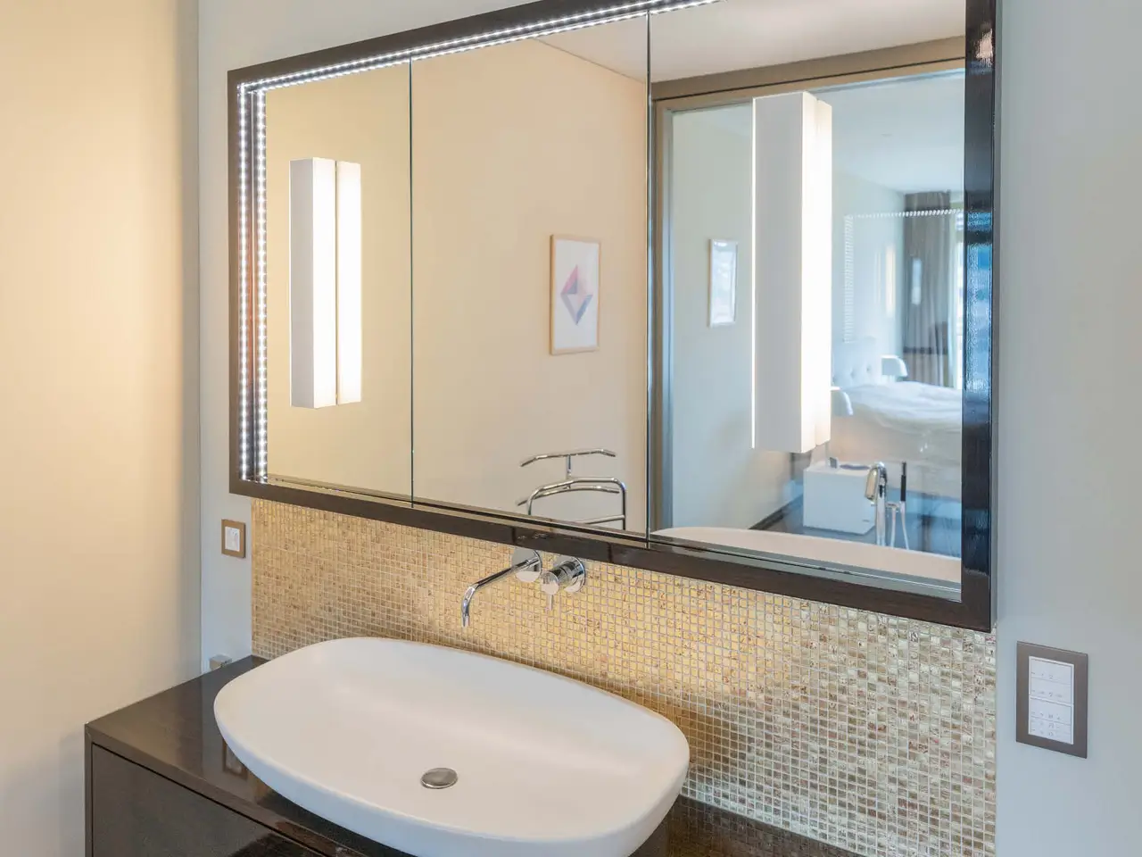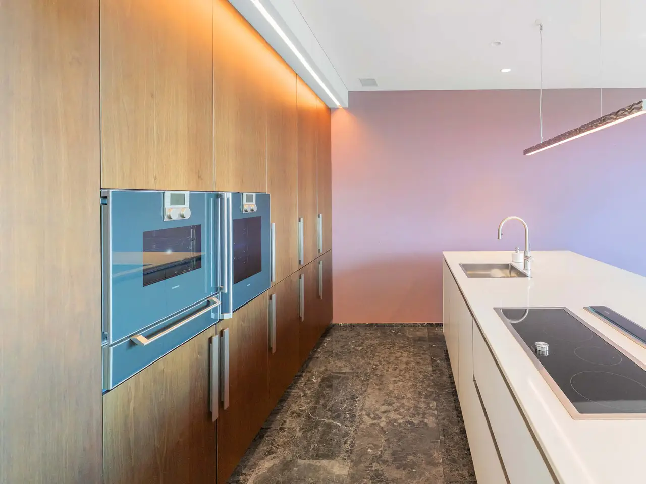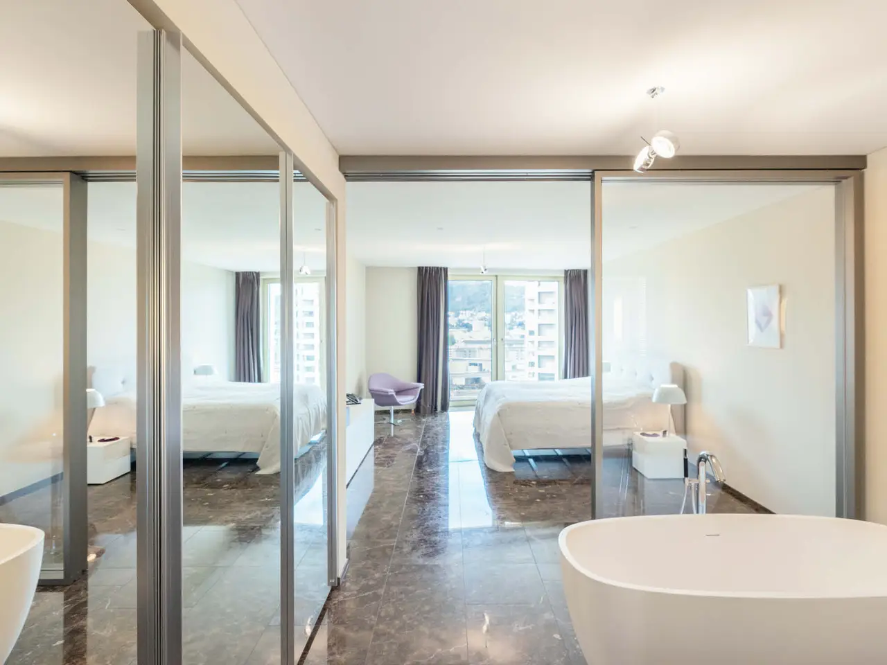 Elevated high above the vibrant cityscape, this extraordinary 5.5-room residence offers refined urban living in Zurich’s iconic Renaissance Tower. Located on the 15th floor, the approximately 300 m² apartment combines panoramic views, modern loft-like architecture, and an unbeatable city location. The expansive living area with floor-to-ceiling windows flows seamlessly into a sleek, designer kitchen—perfect for both entertaining and everyday luxury. Two beautifully appointed bedrooms each feature ensuite bathrooms and soaring ceilings, with one oriented southwest and the other facing east from the entry hall. A sliding door reveals a stylish study or library adjacent to the main living space. A spacious utility room completes the layout, offering comfort and practicality. Zurich’s Hardbrücke train station and tram line 4 are just steps away, providing direct access to the main station and city center. The nearby highway connects you swiftly to the lake, mountains, and Zurich Airport—just 20 minutes away. Designed by the acclaimed Swiss firm Diener & Diener and completed in 2011, the 81-meter Renaissance Tower blends private luxury living with the semi-public amenities of the Renaissance Tower Hotel, making it a bold architectural landmark in Zurich-West.