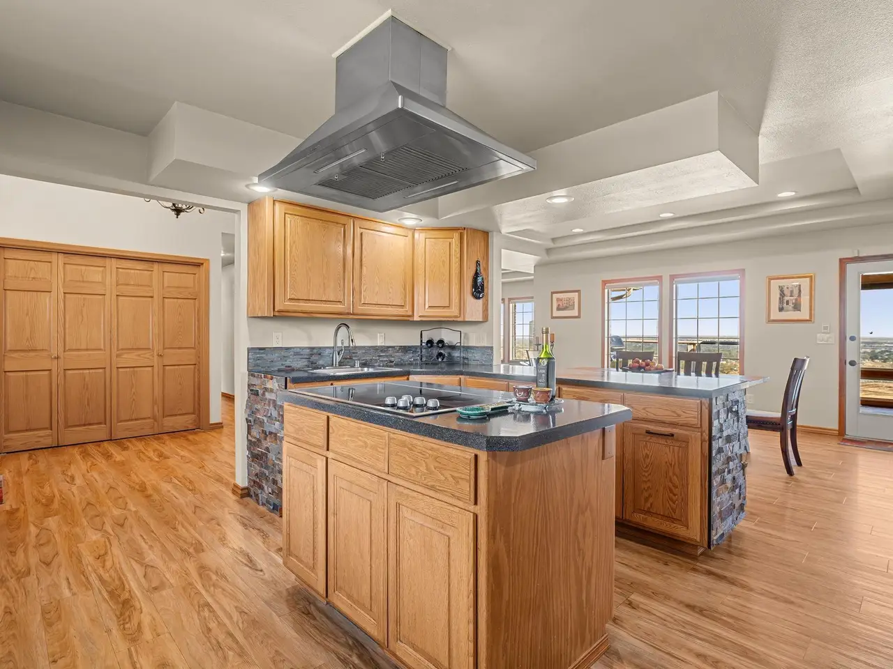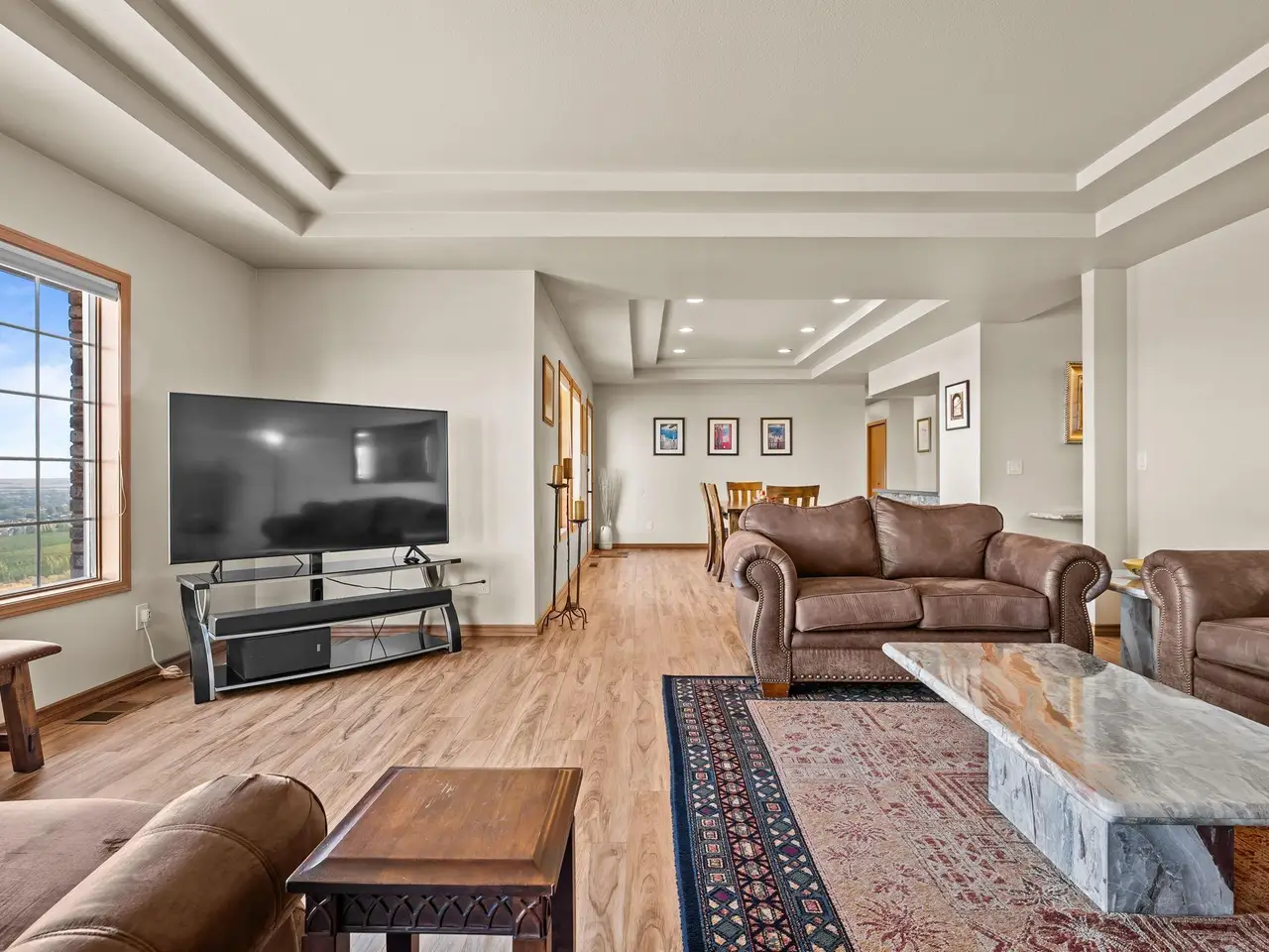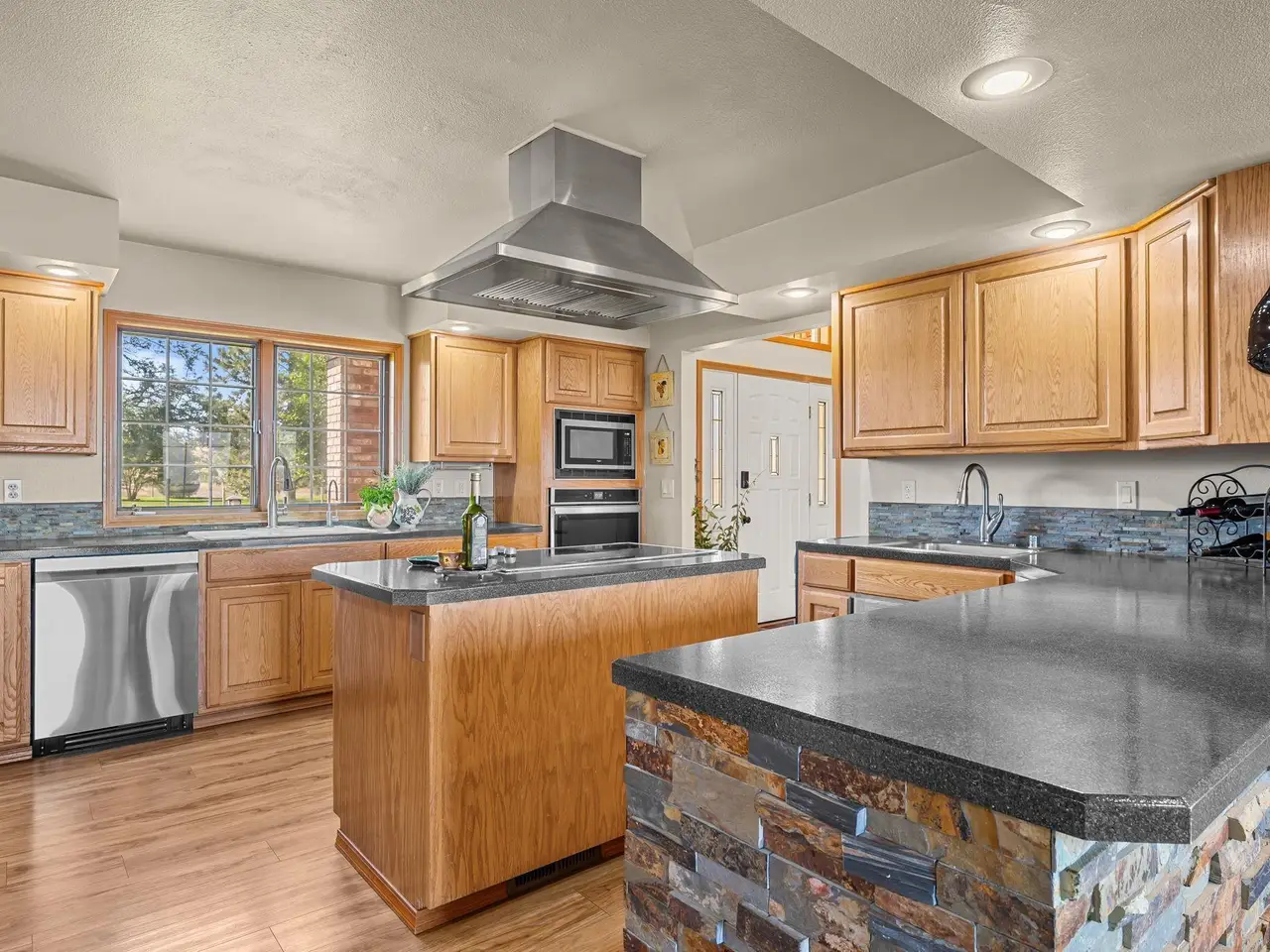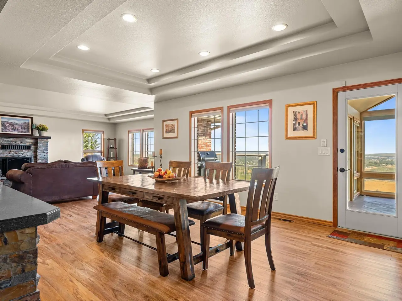 Experience the freedom of nearly 20 acres and some of the most breathtaking views in town. This private retreat blends wide-open spaces with a comfortable 4-bedroom home designed to capture the surrounding beauty. The main level features an open living and dining area with a cozy wood-burning fireplace, where windows frame the rolling landscape. A vaulted sunroom with gas fireplace provides a year-round sanctuary to enjoy the sunrise, sunsets, and changing seasons. The home includes one main-floor bedroom (currently an office) and a daylight basement with four additional bedrooms downstairs that include the primary suite. Outdoors, you'll find room for animals, gardening, and hobbies. A large shop with two full bays, an air compressor, a pellet stove for heating during cold months, and generous storage is perfect for projects and toys. Attached is a fully finished 2-bedroom, 2-bath apartment with laundry - ideal for guests, multi-generational living, or rental income. The property also features a chicken coop for fresh eggs, and a fire pit where family and friends can gather under the stars. Here you'll enjoy the best of both worlds: the tranquility of country acreage and the convenience of being just 10 minutes from shopping, schools, and everyday needs.