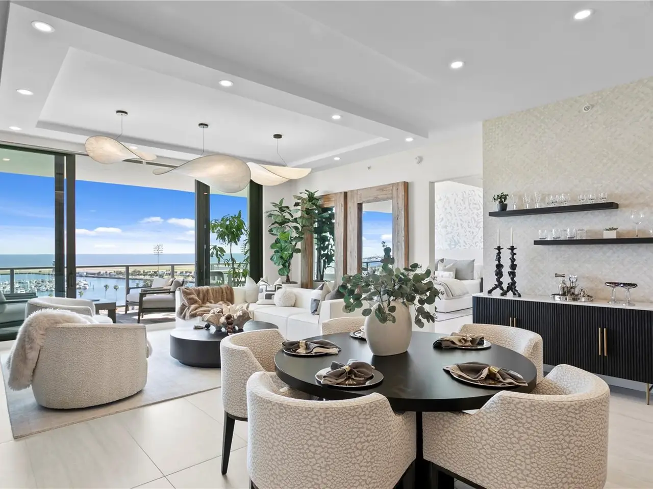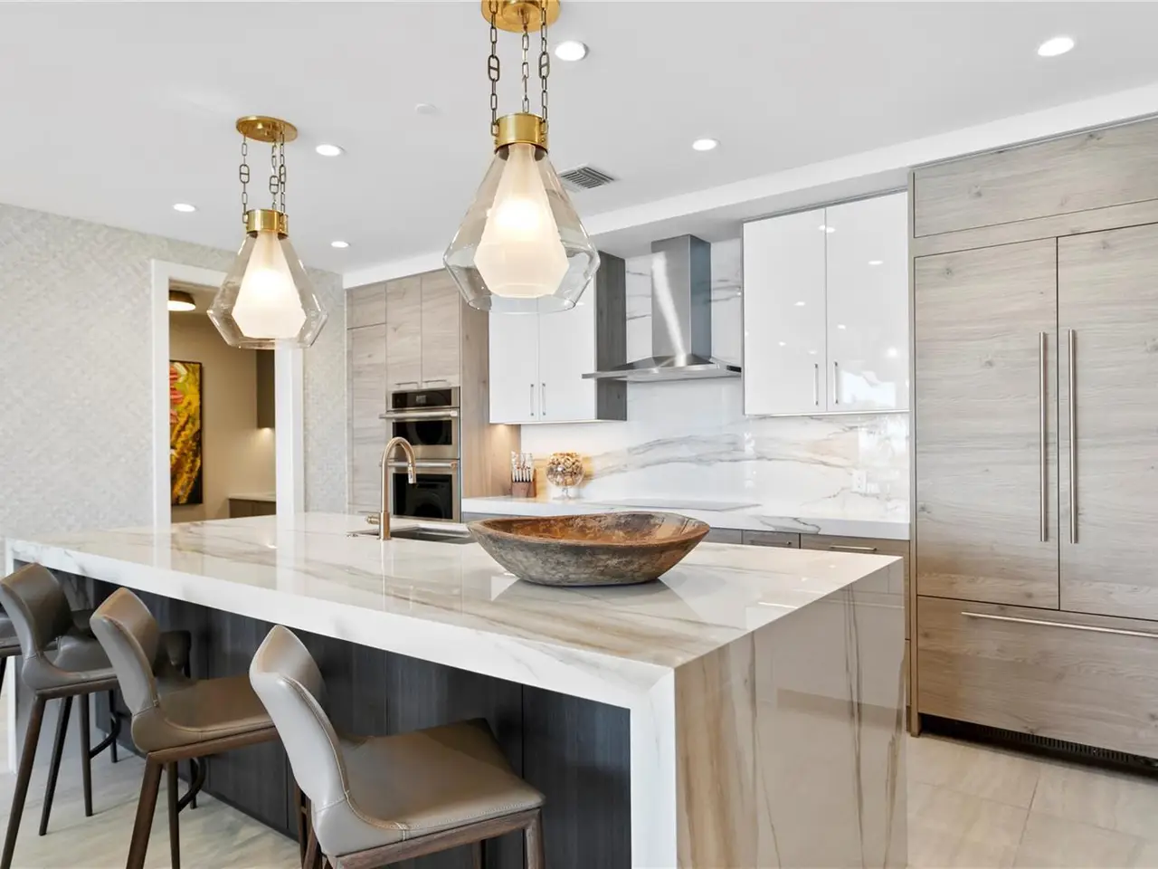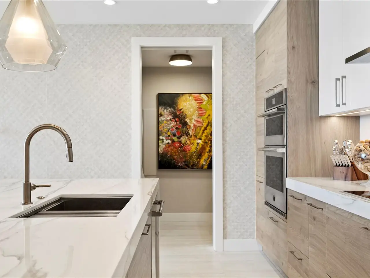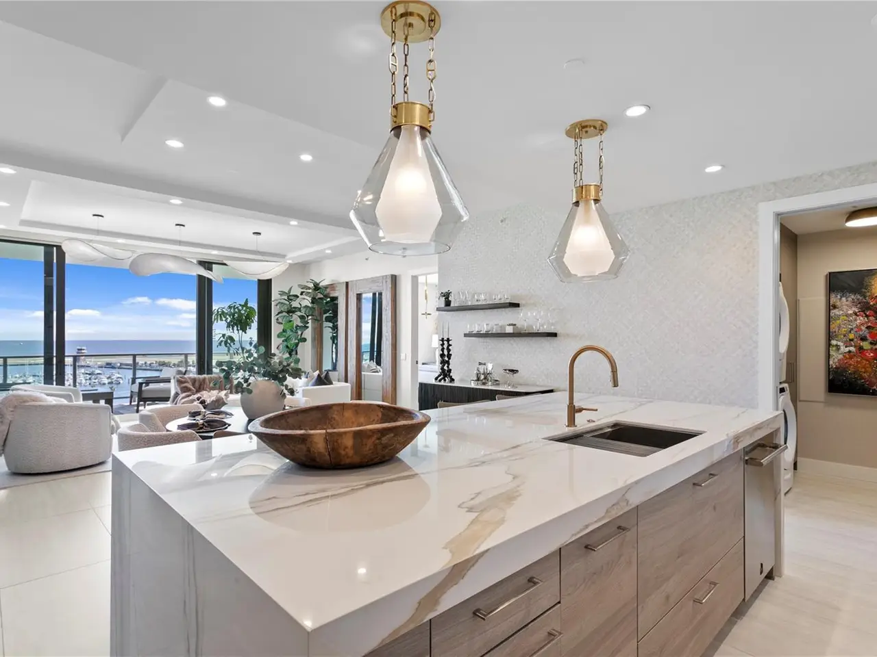 Fully Reimagined and designed in 2024, this new condo is a true masterpiece where every inch has been thoughtfully curated for the most discerning tastes. From the moment you step through the custom archway, the level of craftsmanship is evident, setting the tone for what's to come. The OPEN-CONCEPT LIVING SPACES are an absolute showstopper, featuring exquisite, HAND-SELECTED DESIGNER TOUCHES that elevate the space to another level of elegance. The main attraction is the CUSTOM MEDIA WALL WITH HIDDEN GUEST ROOM DOOR. The tone in the living room is set with THREE SILK-WRAPPED CHANDELIERS that illuminate, while a FRAMED ART WALL with TEXTURED WALLPAPER creates a bold statement. The ELEGANT TRAY CEILING with RECESSED LIGHTING enhances the sense of grandeur throughout the home. At the heart of this residence is a CHEF'S KITCHEN that is as beautiful as it is functional. The approx. 5'x11' EXPANDED ISLAND WITH A DOUBLE WATERFALL EDGE and concealed cabinetry, all WRAPPED IN SLEEK PORCELAIN, is a true work of art. The matching backsplash ties the entire space together in perfect harmony. The BUTLER'S PANTRY is a fusion of practicality and indulgence, complete with a WINE COOLER, QUARTZ COUNTERTOPS, CUSTOM CABINETRY, and laundry space, offering an unparalleled level of convenience. The DEN IS AN OASIS OF FUNCTIONALITY AND ELEGANCE, equipped with FULL-HEIGHT CUSTOM CABINETRY, an oversized chandelier that demands attention, and wallpapered accents for a refined, personalized touch. The OWNER'S SUITE OFFERS THE ULTIMATE RETREAT, combining peace and luxury with a WALLPAPERED ACCENT WALL, a DESIGNER CHANDELIER, and CUSTOM CLOSETS that are as stunning as they are spacious. The SPA-LIKE EN-SUITE BATH takes relaxation to the next level, boasting a CUSTOM LINEN CLOSET illuminated to highlight its beauty, along with three luxurious pendant lights. Every aspect of this home has been meticulously upgraded, from TILE FLOORING and LUTRON ELECTRIC BLINDS to thoughtfully curated designer finishes on walls, trim, and ceilings. As a resident of Saltaire, you'll enjoy world-class amenities including a resort-style pool, a state-of-the-art fitness center, expansive club rooms surrounded by glass that bring the outdoors in, and a pet-friendly dog park with a washing station. The 7th-floor terrace offers breathtaking panoramic views of the bay and downtown skyline, while the vibrant city life is just steps away from your front door. This is truly an extraordinary opportunity to live in a LUXURY HOME WHERE UNPARALLELED DESIGN MEETS EXTRAORDINARY CONVENIENCE. With the added peace of mind of the builder's warranty, this is a rare find in the heart of downtown.