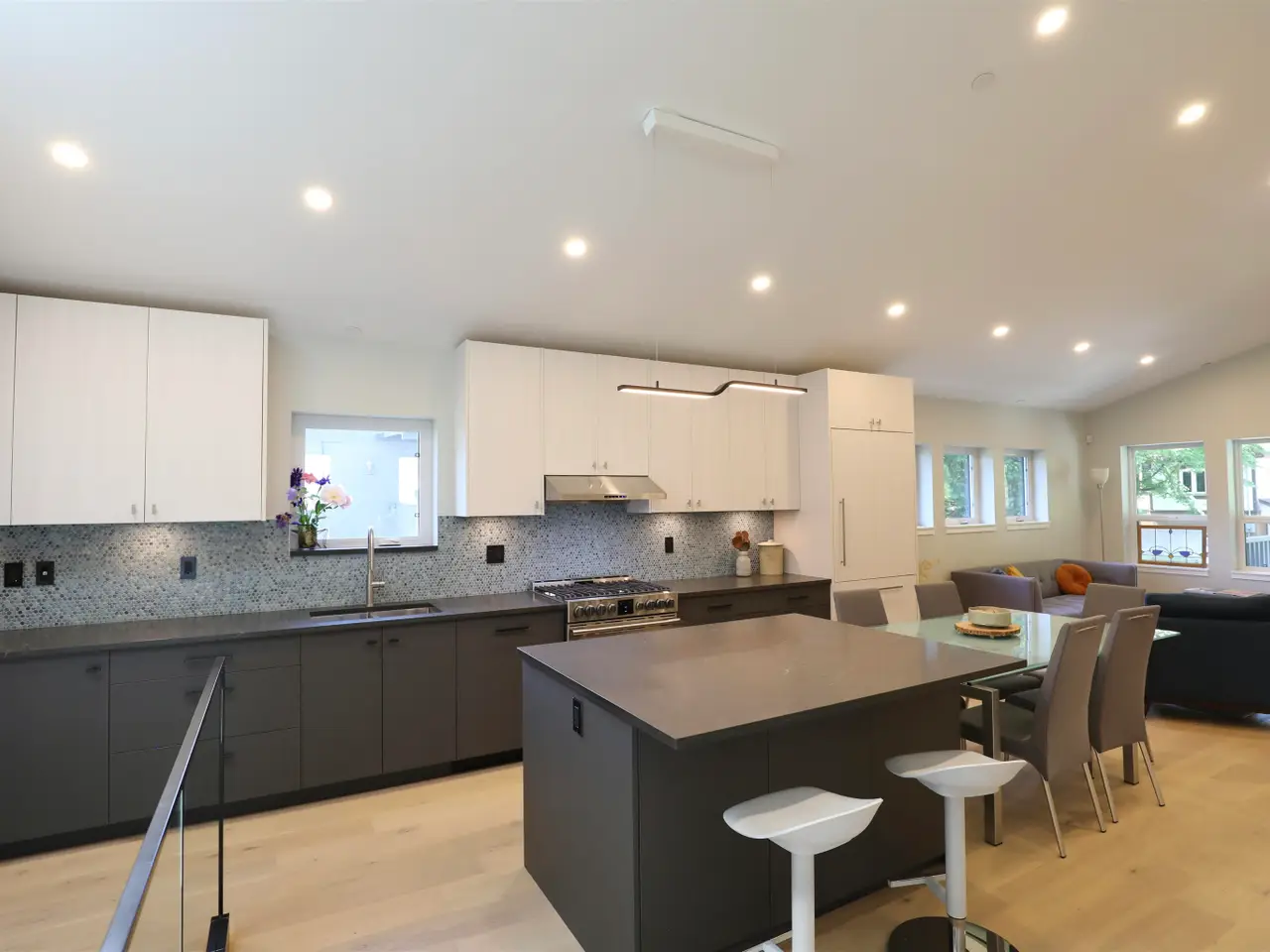 Stunning new, family-friendly ½ duplex in desirable Cedar Cottage. This 2,048 SF home features 5 spacious bedrooms plus 4 full baths, including ground-level legal suite with separate entrance - ideal as a mtg helper, space for extended family or caretaker. The main level is filled with natural light, through an abundance of windows & skylights, accentuating the soaring 12’ vaulted ceilings & an open-concept layout with a chef-inspired kitchen, gas range, counter-depth fridge, custom cabinetry & granite counters. Enjoy energy-efficient, 5-zone radiant in-floor heating, A/C and a sunny west-facing patio & fenced yard - perfect for outdoor entertaining. Includes an attached garage & ample storage. Steps to transit, parks, Trout Lake CC & schools:
