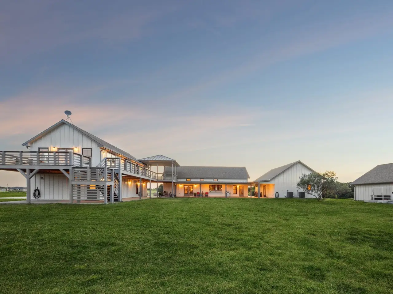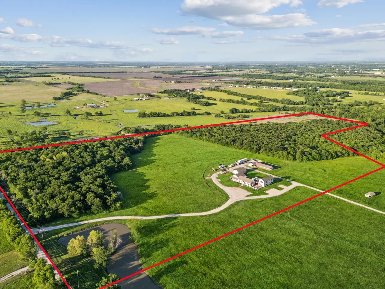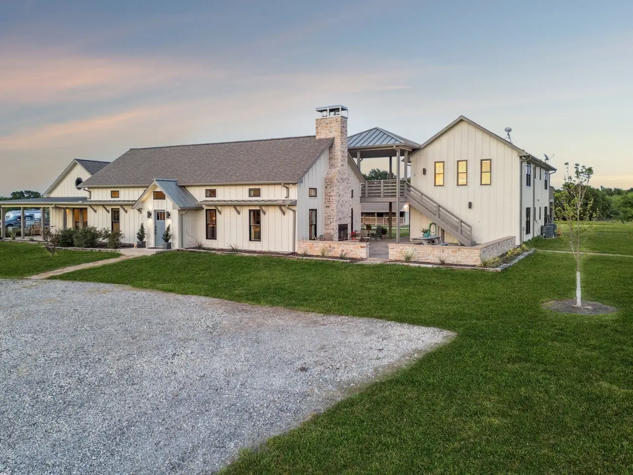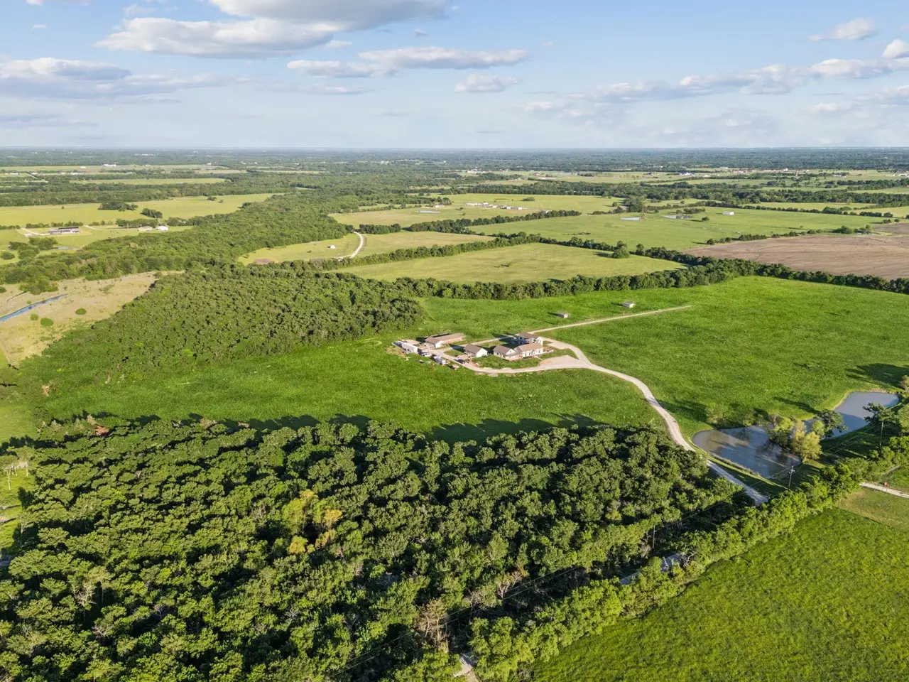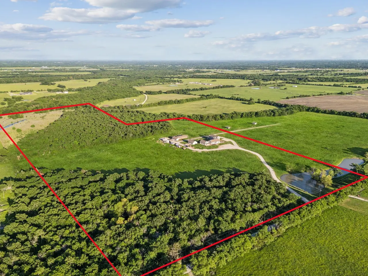 Welcome to Circle B Retreat, a rare 46-acre ag-exempt ranch just 50 miles from Dallas, perfectly planned to escape the city. Creatively designed with a nod to the Hill Country, this carefully planned ensemble of buildings is connected by an extensive wrap-around porch and courtyard encouraging easy indoor - outdoor flow. Inside, slate floors extend through the main living area with vaulted ceilings and a stone fireplace. The kitchen is built to host large gatherings with an expansive island and extra-large pantry for storage. A separate office with mini-split offers flexibility, while multiple dwellings make it a perfect multi-generational living setup. A working art studio offers lots of space for creative activities or could easily be converted to sleeping spaces. Enjoy expansive sky views, sunsets, stars, and reflections in the pond from the outdoor fireplace and open patio area. The private drive wraps around the home and barn providing unlimited parking. The sturdy, pole-built, 5-stall barn with tack and storage rooms, shelters horses and other animals, and - or a place to store ATVs or dirt bikes. Wooded spaces invite exploration, and the homes set-back location ensures privacy and safety for kids and animals. Evenings bring chirping frogs and the coyote chorus under the Texas stars. Welcome home!