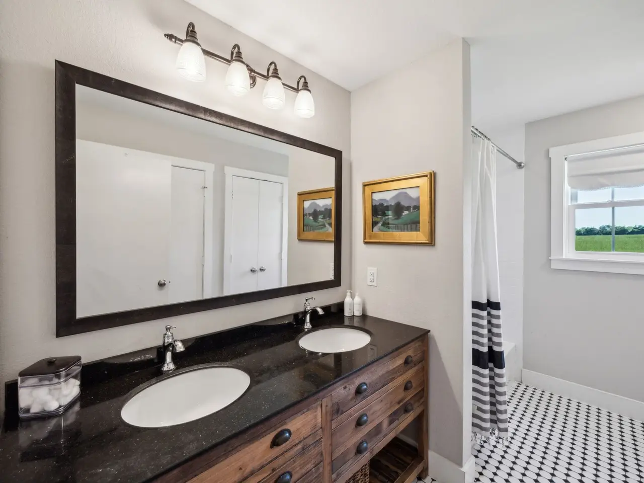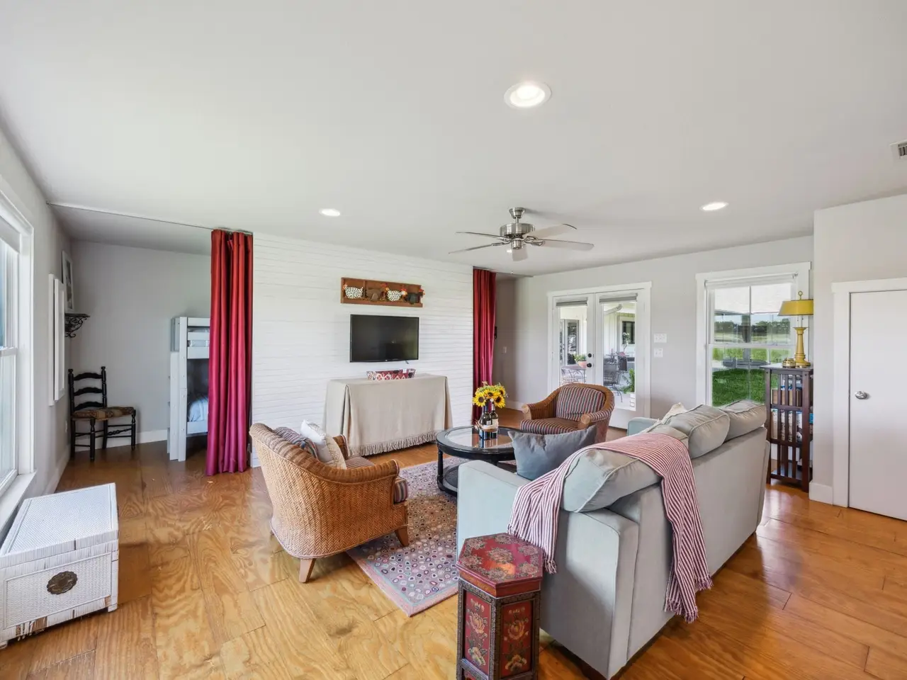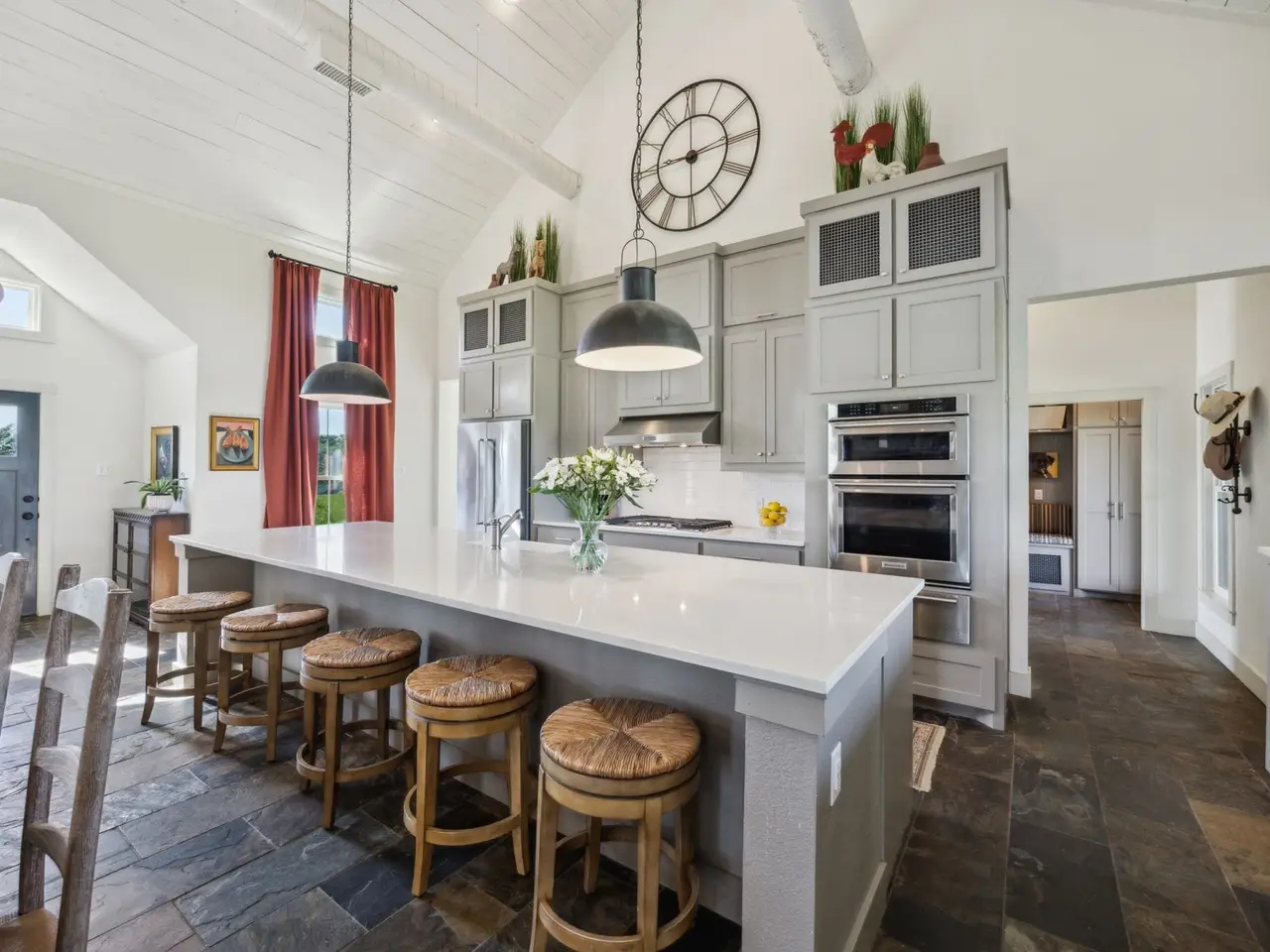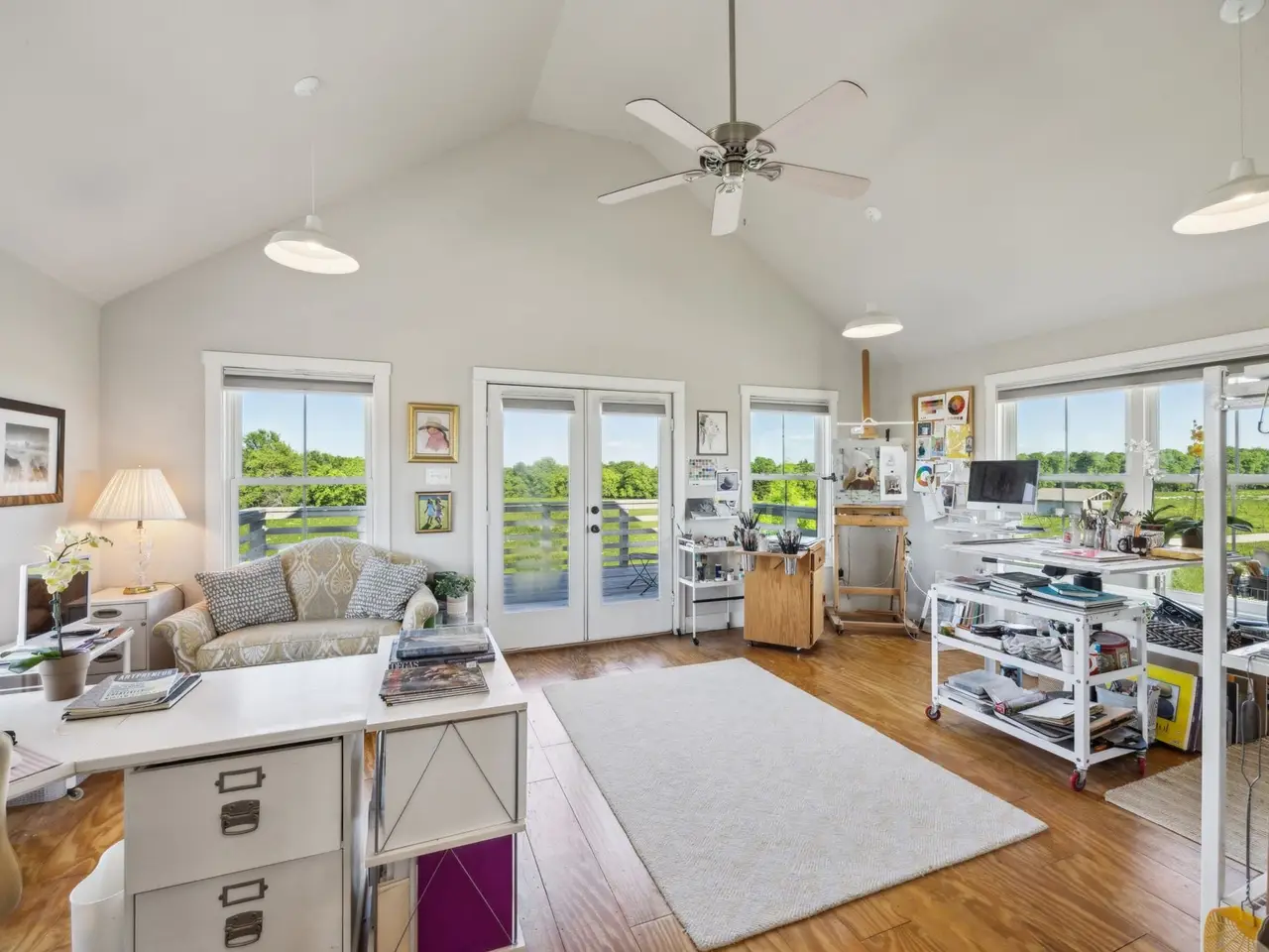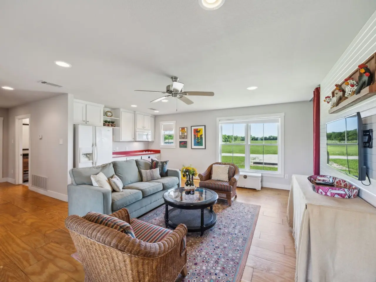 Welcome to Circle B Retreat, a rare 46-acre ag-exempt ranch just 50 miles from Dallas, perfectly planned to escape the city. Creatively designed with a nod to the Hill Country, this carefully planned ensemble of buildings is connected by an extensive wrap-around porch and courtyard encouraging easy indoor - outdoor flow. Inside, slate floors extend through the main living area with vaulted ceilings and a stone fireplace. The kitchen is built to host large gatherings with an expansive island and extra-large pantry for storage. A separate office with mini-split offers flexibility, while multiple dwellings make it a perfect multi-generational living setup. A working art studio offers lots of space for creative activities or could easily be converted to sleeping spaces. Enjoy expansive sky views, sunsets, stars, and reflections in the pond from the outdoor fireplace and open patio area. The private drive wraps around the home and barn providing unlimited parking. The sturdy, pole-built, 5-stall barn with tack and storage rooms, shelters horses and other animals, and - or a place to store ATVs or dirt bikes. Wooded spaces invite exploration, and the homes set-back location ensures privacy and safety for kids and animals. Evenings bring chirping frogs and the coyote chorus under the Texas stars. Welcome home!