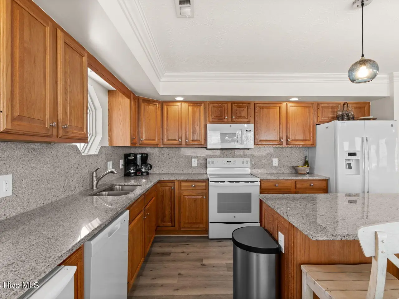• Natural stone countertops with full-height backsplash