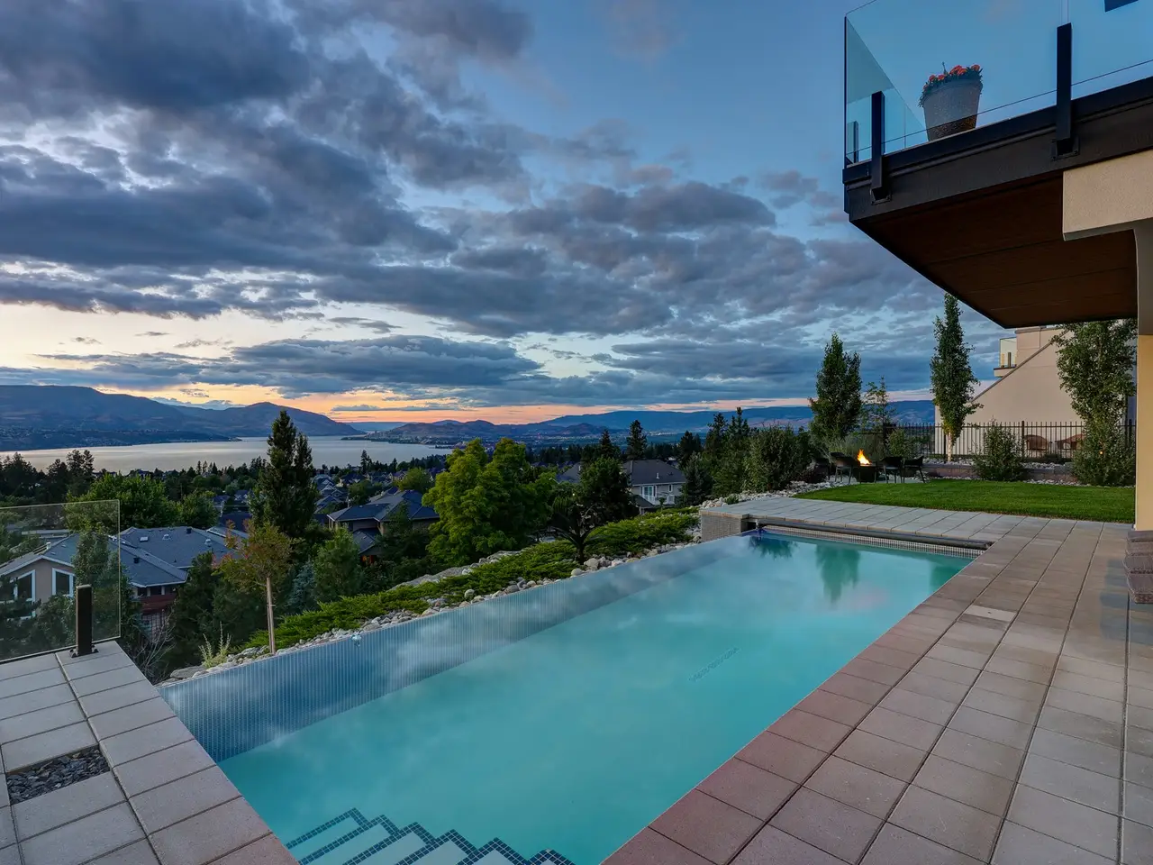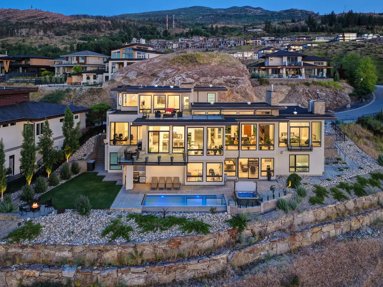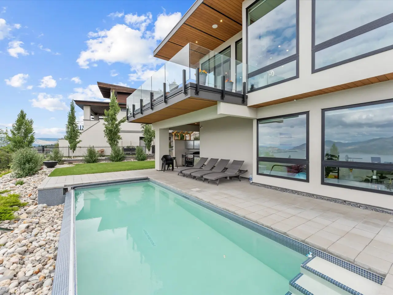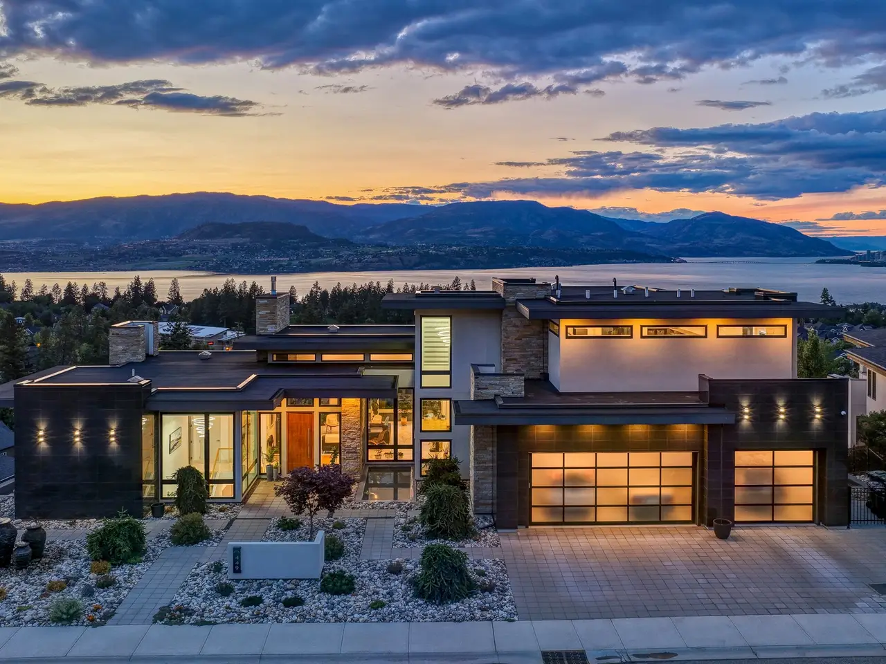 Listed by Unison Jane Hoffman Realty | Framed by breathtaking lake, city, and valley views, this modern masterpiece – designed by Carl Scholl – pairs architectural sophistication with exceptional craftsmanship. From the self-locking solid wood door imported from Croatia to the floating staircases and Anderson window package, every detail has been curated for form and function. Spanning 6,600+ sq. ft., this 6-bedroom, 7-bath residence offers radiant heated floors, Italian tile, solid core doors with transom windows, and seamless indoor-outdoor flow. The chef’s kitchen features quartz counters, a Dekton waterfall island, Fulgor gas cooktop, JennAir ovens, and a full butler’s pantry with second kitchen. Expansive living and dining areas are framed by floor-to-ceiling windows, while the primary retreat boasts a spa-inspired ensuite, boutique-style walk-in closet, and rooftop deck access. Outdoors, the backyard is a private oasis designed for both relaxation and entertaining—featuring a saltwater infinity pool with power cover, sunken hot tub, fire table, and lush landscaping. The covered patio with wood inlay ceilings, built-in speakers, and a full outdoor kitchen offers the perfect setting for alfresco dining. A fully self-contained suite with private entrance, heated floors, and sweeping views adds flexibility for multigenerational living, or guests. This is elevated Okanagan living thoughtfully designed, beautifully finished, and truly unforgettable.