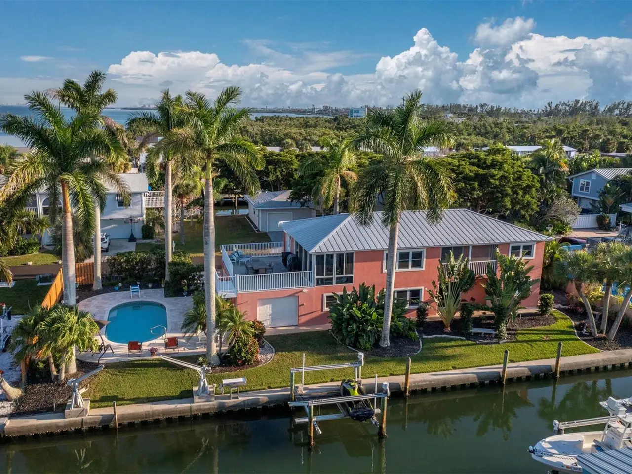 This fabulous 3 bedroom, 2 bath Longboat Key pool home has it all! It is situated on an oversized 11,250sf lot on the canal with 125 feet of seawall, so you can truly enjoy hopping on your boat or kayak or paddle board right outside your back door! It was built strong with steel and precast slab and all of the windows and doors are storm rated or have shutters. Two large garages allow for plenty of storage space, and one of them flows through to the backyard which allows for all your water toys to be easily at the ready. The 2nd floor living area of the home is elevated over the garage and storage, but the extremely large ground floor space has been set up as a great game and gathering spot opening to the gorgeous backyard. The sparkling salt water pool sits to the side with steps up to the outdoor deck over the garage space and is the perfect spot to enjoy the picturesque views. Once inside the home is meticulously kept with a clean white kitchen, open to the living area. Multiple windows and doors and balconies allow for a perfect balance of indoor/outdoor living. All of this plus deeded beach access down the street mean you have covered all the bases to be living the true island lifestyle that Longboat Key is known for.