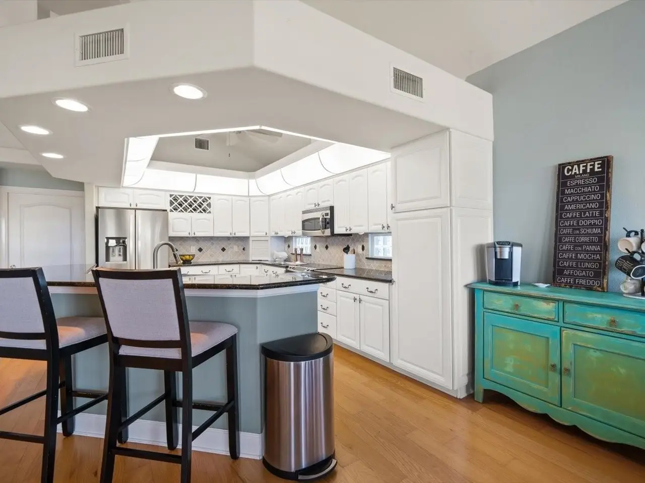 • Open-concept kitchen with custom cabinetry and stainless steel appliances