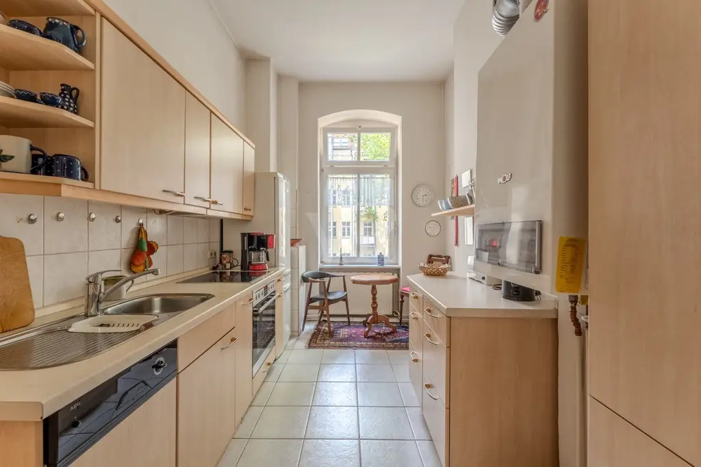 For sale is an exceptional and generously proportioned old apartment in the sought-after Winsviertel district in the heart of Berlin-Prenzlauer Berg (milieu protection area). The building was constructed around 1900 and impresses with its historic building fabric and well-maintained overall condition. The apartment is located in the front building and offers generous and stylish living comfort on approx. 116 m² of living space and a ceiling height of up to 3.40 m. The layout of the apartment is clearly structured and offers a comfortable living ambience: In the front area, there are two large rooms - connected by a double door - and a small balcony. The third room is located opposite. At the back of the apartment, you will find the kitchen with built-in units and a small seating area as well as the bathroom with a bathtub, shower and plenty of natural light. The bathroom and kitchen are fitted with double-glazed wooden windows. Typical old building elements such as stucco decorations, original double doors and the wooden box-type windows in the front living area, which were restored in 2015, give the apartment a special character. The oak parquet flooring and floorboards underline the elegant living atmosphere. Heating is provided by a gas-fired central heating system, which also supplies hot water. There is also a cellar compartment and bicycle storage facilities in the inner courtyard. The house rent is set at EUR 232.32 per month (excluding gas costs, but including EUR 70.33 maintenance reserve). The apartment was last modernized in 2007. The central and quiet location of the apartment in the Winsviertel offers excellent connections to the public transport network. All important facilities for daily needs can be reached in the immediate vicinity. This apartment appeals to singles, couples and small families alike - an ideal home for city lovers looking for something special. Locations Description The apartment is located in the popular Winsviertel district in the heart of Berlin-Prenzlauer Berg (milieu protection area) - one of the capital's liveliest and most charming neighborhoods. The neighborhood is characterized by lovingly renovated old buildings, leafy avenues and a diverse range of restaurants. Just a few steps away is the legendary Volkspark Friedrichhain, Kollwitzplatz with its weekly market and Leise Park - a green oasis with quiet paths and shady spots that invites you to take a walk and relax. The Winsviertel impresses with its high density of cozy cafés, individual boutiques and small delicatessens. The central location also makes it easy to reach Berlin's City East with Alexanderplatz, Museum Island and Hackescher Markt - both by bike and by public transport. The connections are excellent: the underground and S-Bahn stations Alexanderplatz, Greifswalder Straße and Prenzlauer Allee are very close by - several streetcar lines are within walking distance. This location combines urban life with a relaxed neighborhood atmosphere in an ideal way.