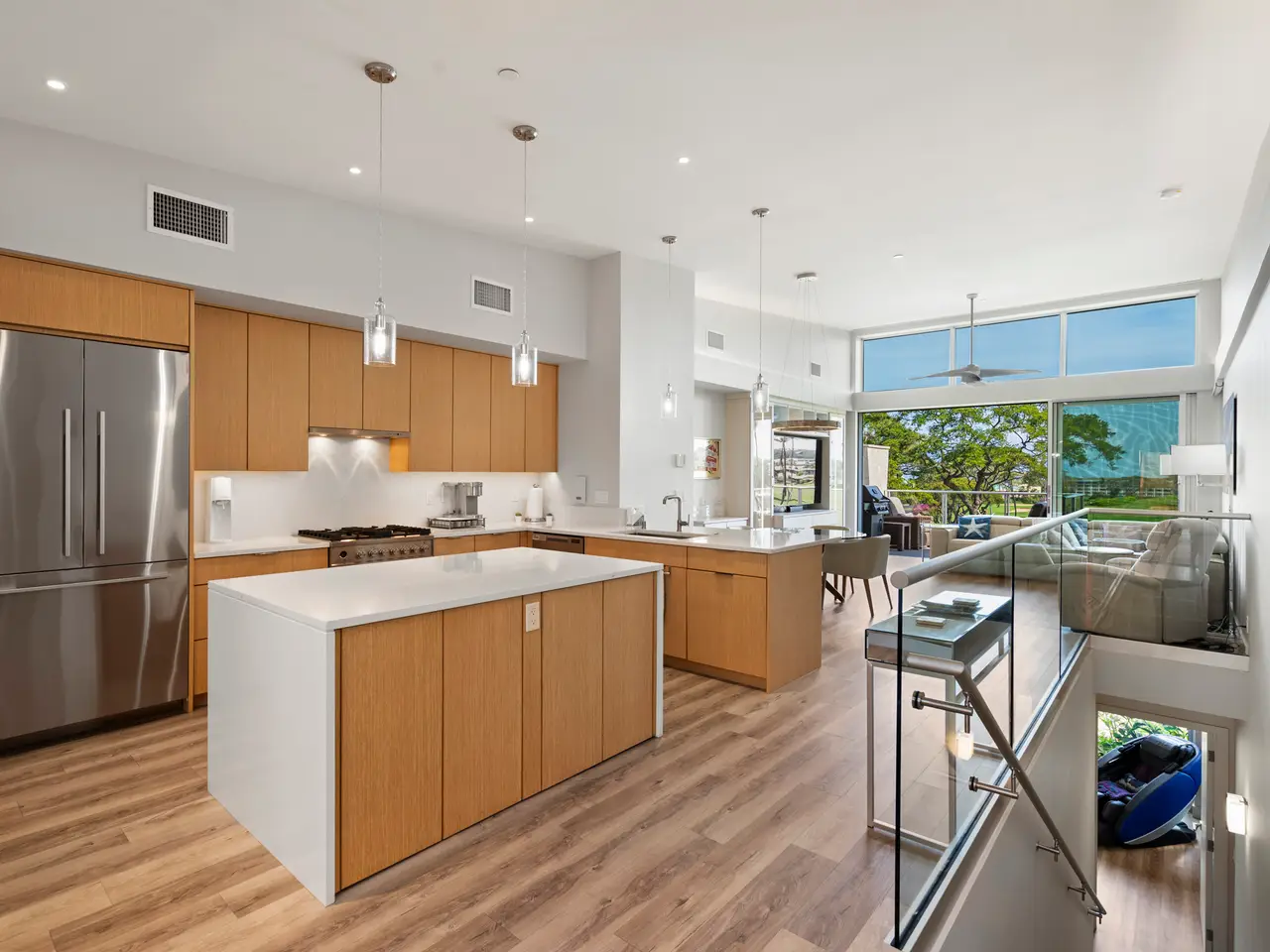 Welcome to Makalii, one of Wailea’s newest luxury residences known for its mid-century modern design. This spectacular condominium (7C) is located on the upper row and is situated in the only building that that faces north, overlooking the beautiful Wailea Blue Golf Course. The orientation of this building provides wonderful privacy and an abundance of natural light from the floor to ceiling windows. There are 3 spacious bedrooms and 3 bathrooms including a separate guest suite “casita” located over the one-car garage. This ensuite is south facing with a beautiful glimpse of the ocean and offers a wonderful private space for guests and family. As you enter the home through your private courtyard there are no steps. The open-concept layout flows effortlessly from the entryway to the living room, gourmet kitchen, and out to the cozy lanai. Features include Fisher Paykel appliances, including refrigerator, freestanding gas range, and a dishwasher. Quartz countertops, designer cabinetry, Luxury Vinyl Plank flooring throughout, California Closets organizers in all three bedrooms, media center in living room and coffee bar in primary bedroom. Insoroll Elements motorized interior blinds, and Pratic motorized retractable awning in the courtyard. Epoxy floor in the garage with EV charger. The common amenities offer a wonderful resort feel including a saline pool with infinity edge, fitness center, steam room, hot tub, and private facilities for owners. The complex is walking distance to Polo Beach, the Wailea Beach path, The Shops at Wailea, Wailea’s wonderful resorts, dining and shopping.