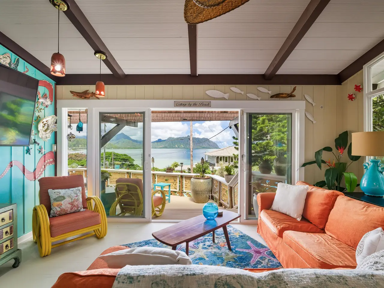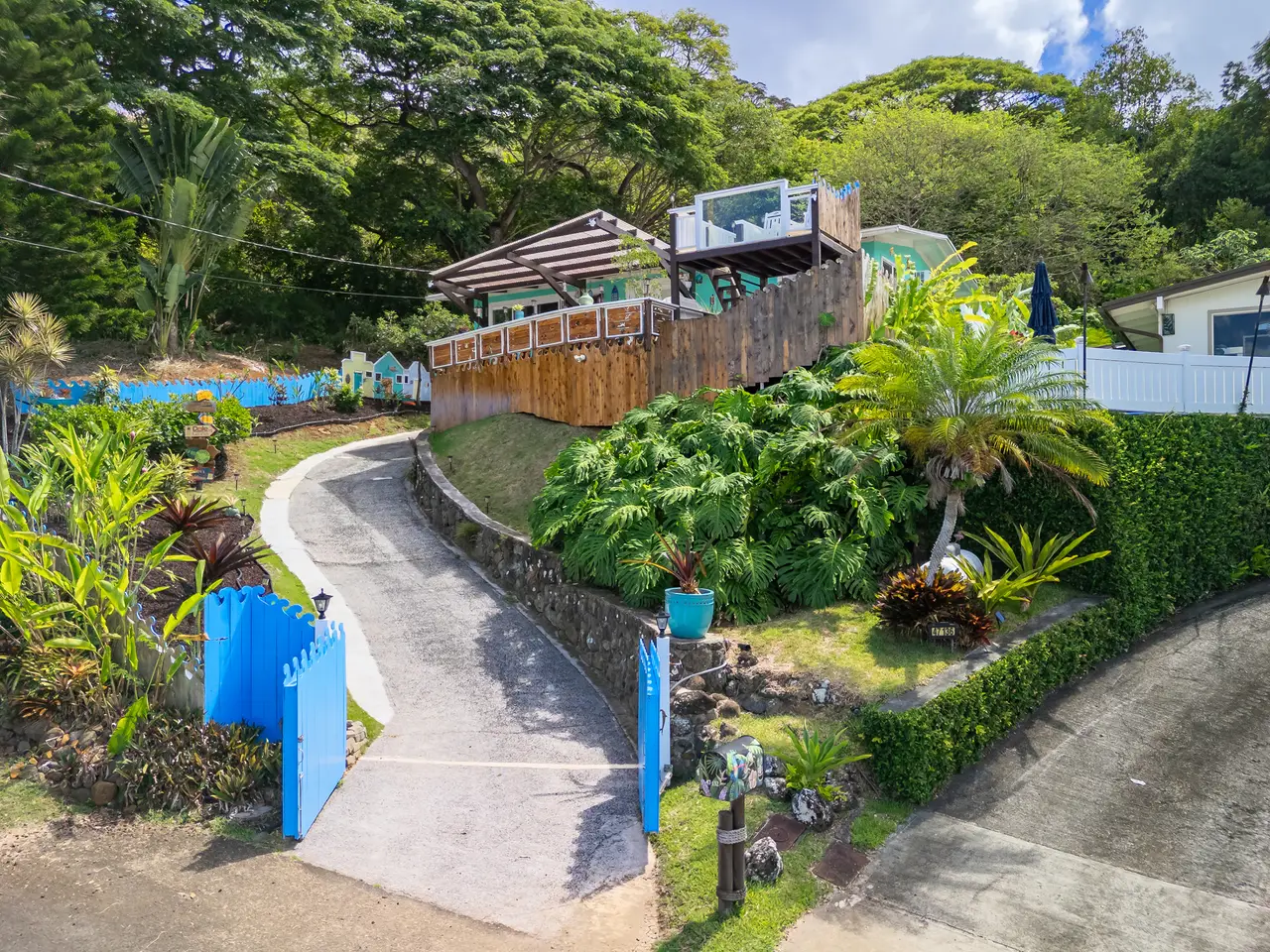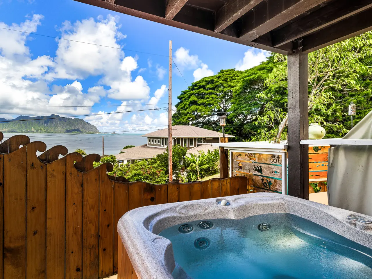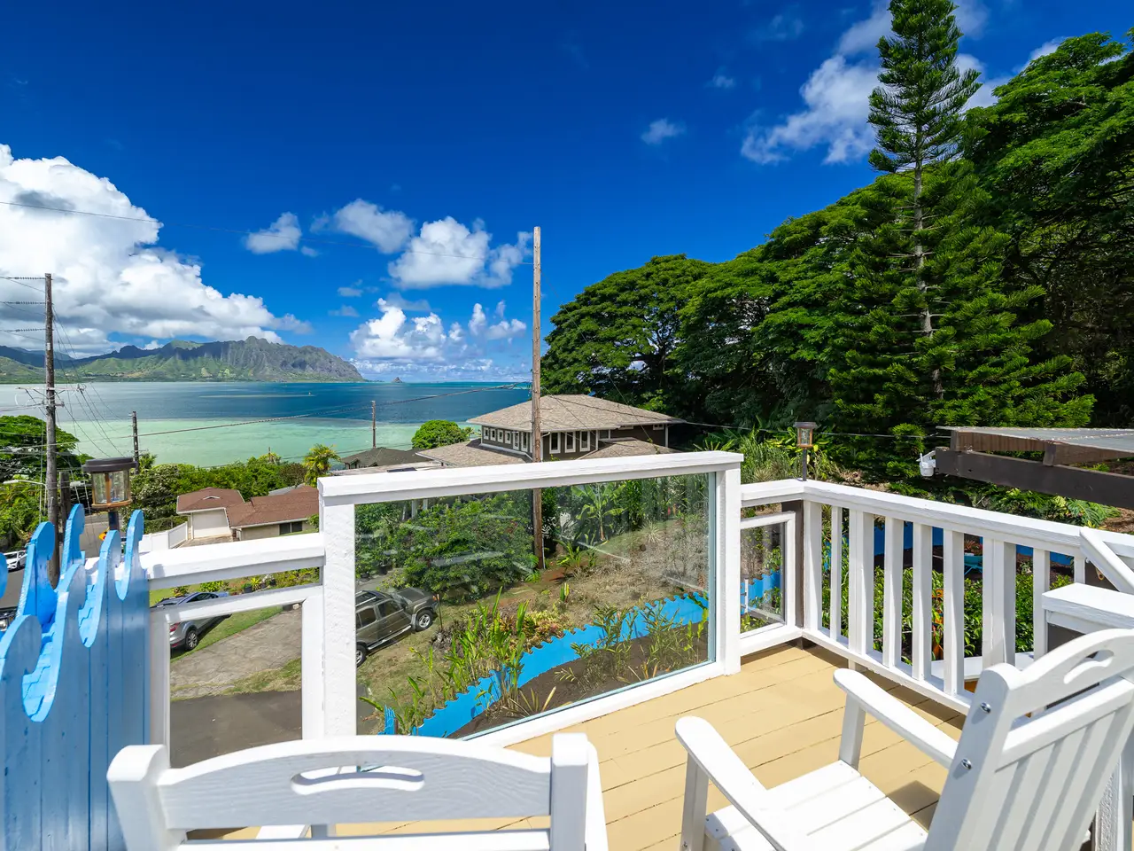 Artistic and unique island retreat in the sought-after Lulani Ocean neighborhood! Enjoy sweeping ocean/mountain views all the way to Chinaman's Hat from the expansive deck, upper-level crow's nest, or spa overlooking the ocean. There is a plethora of unique fixtures & custom finishes such as the brass w/epoxy kitchen countertops, Ohia posts in kitchen & lanai railings, nautical-inspired designs, antique entryway bricks, wood inlays w/ocean themes, decorative ocean-inspired vessel sinks, etched tropical glass, fun lighting fixtures, and more! Other features include a new roof, newer plumbing & electrical, tankless water heater, kitchen pot filler, two convention ovens, wine/beverage refrigerator, two AC wall units. Bonus items include a dwarf avocado & mango tree plus lush island landscaping. The home backs up to preservation land for privacy & the automatic gate at the driveway, in addition to 8 ARC TV cameras, provide additional security and privacy. This property is colorful, whimsical, & simply full of fun! Don't miss the level of love and attention the owners have put into this property. Just 1/2 miles to He'eia Kea Boat Harbor and minutes to Kaneohe town, schools & freeways.