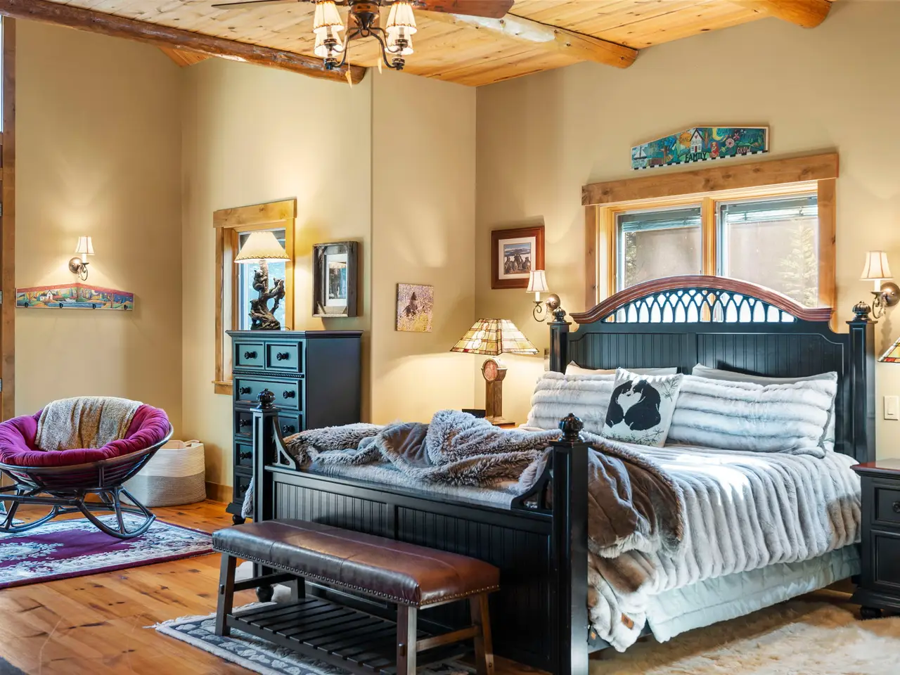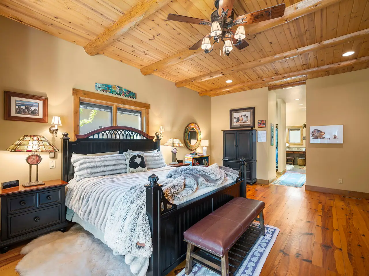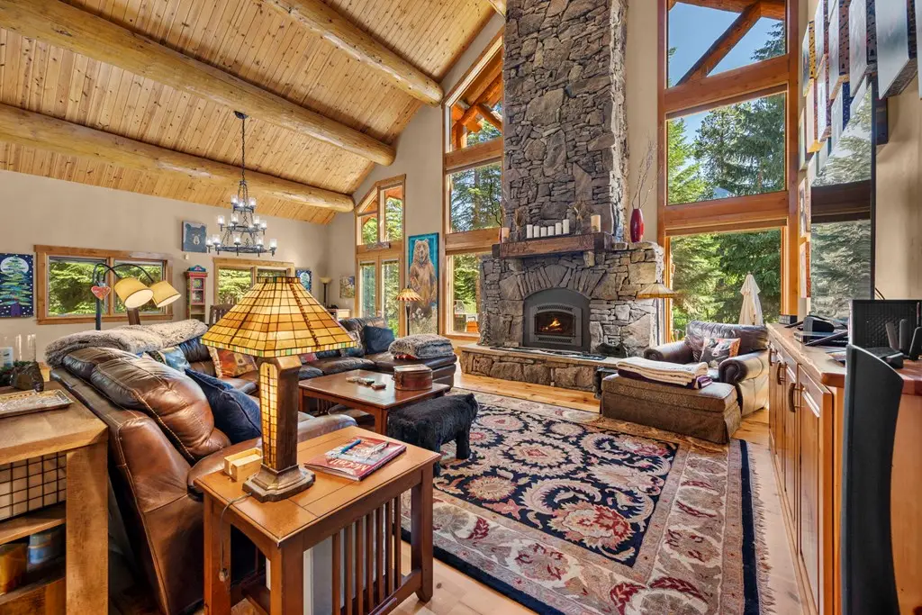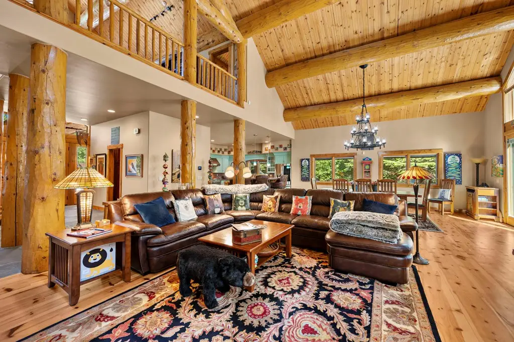 Experience the perfect blend of timeless architecture and modern luxury in this stunning custom log home situated on a serene golf course. Boasting a massive primary bedroom, a Jr. Suite, two spacious bedrooms and three and a half bathrooms, this exquisite residence offers comfort and elegance at every turn. Relax by one of three beautiful fireplaces, unwind in the luxurious steam shower, or enjoy the convenience of his-and-her closets in the primary suite. Beautiful wood floors flow seamlessly throughout, complementing the vaulted ceilings with impressive gorgeous log beams that add warmth and character. The versatile 200 square feet of unfinished space presents a blank canvas for your personalized touch—ideal for a home office, studio, or additional storage. A beautifully landscaped yard surrounds the home on nearly an acre of land, providing privacy and space to enjoy the outdoors. Additional features include a spacious three car garage, a brand-new roof, water heater, and furnace, ensuring peace of mind for years to come. The property is located on a private quiet street and offers access to the community Club House, Gym, and Seasonal Pool.