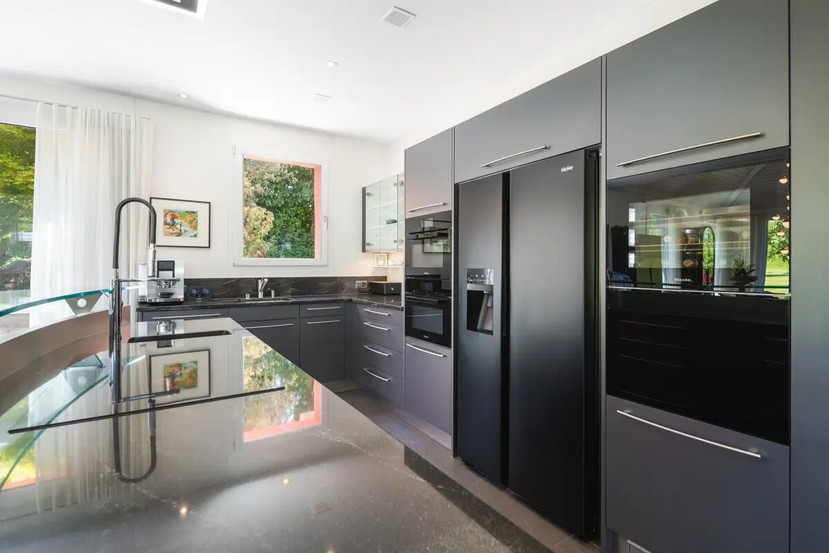 This detached house on the edge of Hochfelden’s agricultural zone combines space, home comforts and proximity to greenbelt in an appealing concept. With approx. 270 square metres of living area, 7.5 rooms and a well-configured layout, it offers plenty of room for families or couples with high expectations. The living and dining area with fireplace forms the inviting hub of the home. The open kitchen features granite surfaces as well as quality appliances and integrates seamlessly into the overall living concept. The master suite occupies the entire top floor and consists of a large bedroom, walk-in wardrobe and bathroom with whirlpool tub and shower. Three additional rooms and a capacious bathroom on the first floor provide ample space for family or guests. The garden is a true Eden with harmonious landscaping, outdoor jacuzzi, and a covered seating area. Part of the adjacent agricultural zone belongs to the property, affording an uplifting sense of openness. A highlight for enthusiasts is the garage, with space for around ten vehicles. The basement also houses a number of, well-sized ancillary rooms, including a heated hobby room. The property: - 7.5-room detached house in Hochfelden - Approx. 278 m² of living space - Approx. 280 m² of agricultural land as additional garden - Landscaped garden oasis with outdoor whirlpool and seating area - Garage for approx. 10 vehicles - Capacious utility rooms incl. heated hobby room