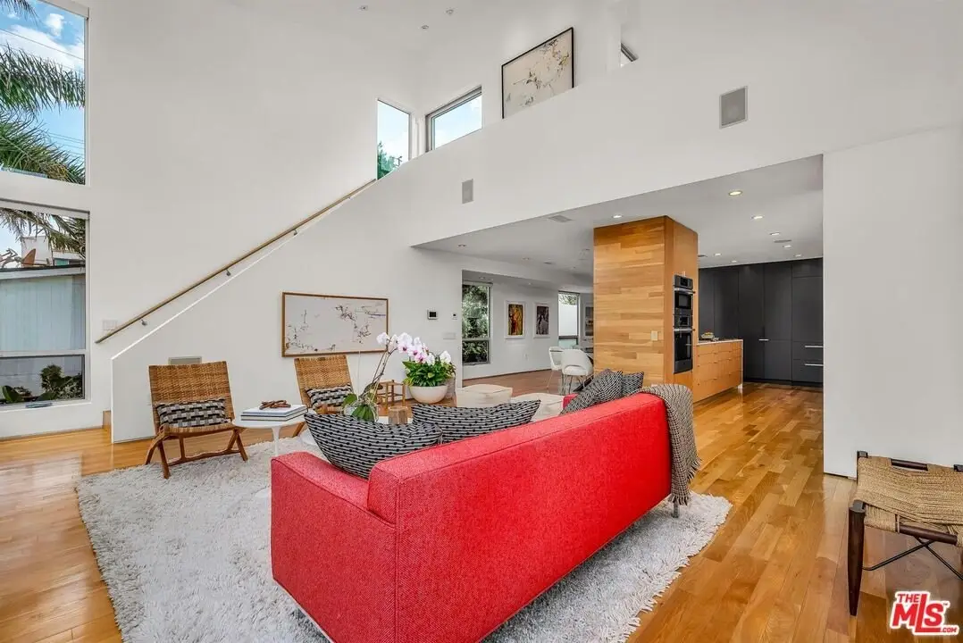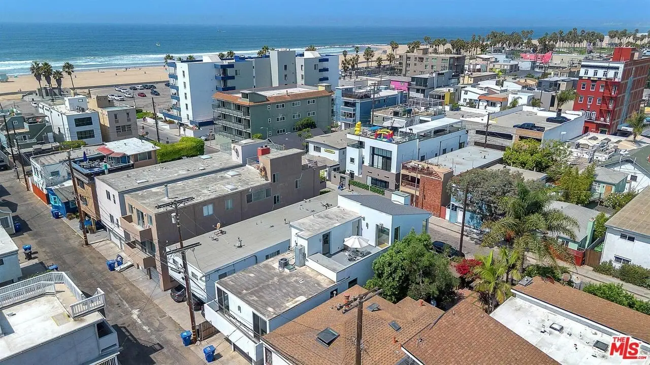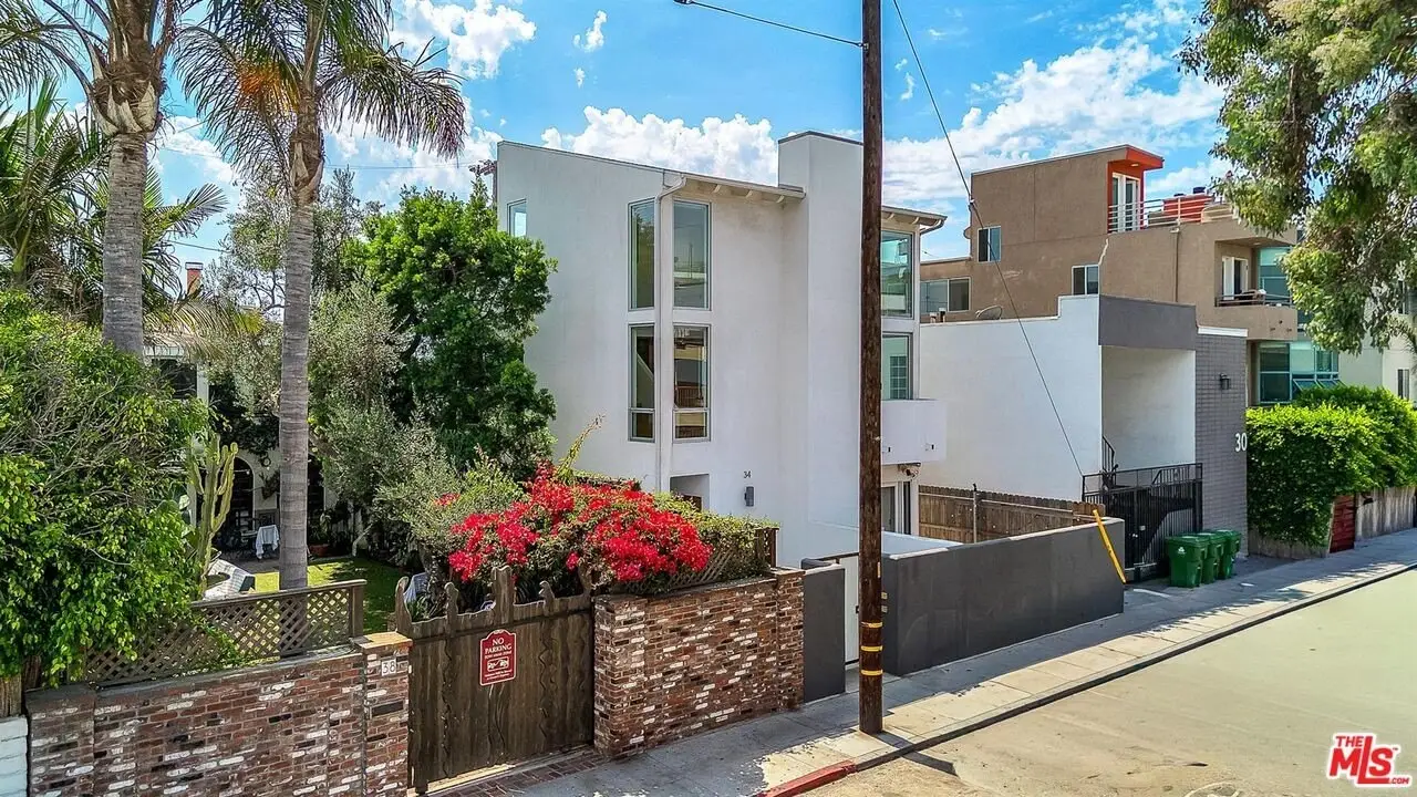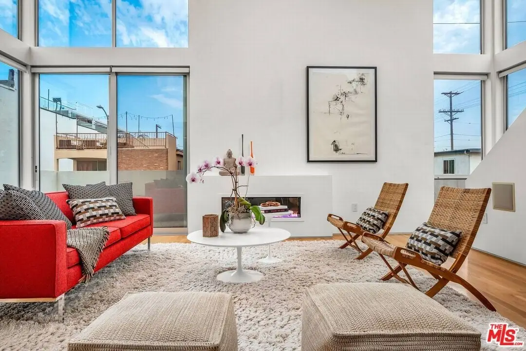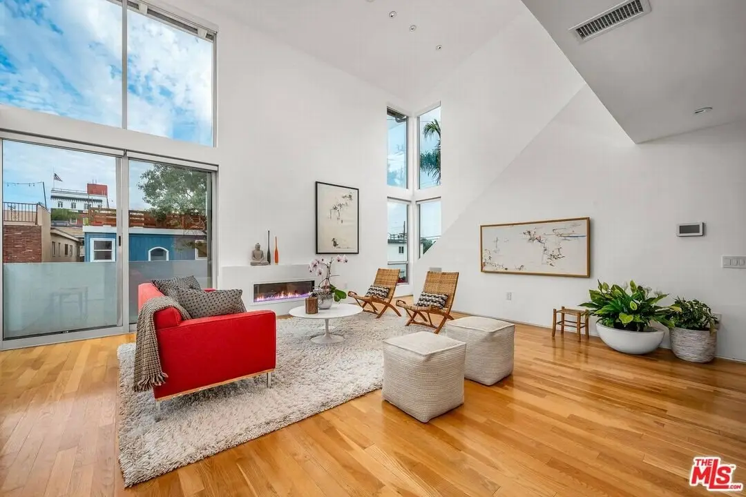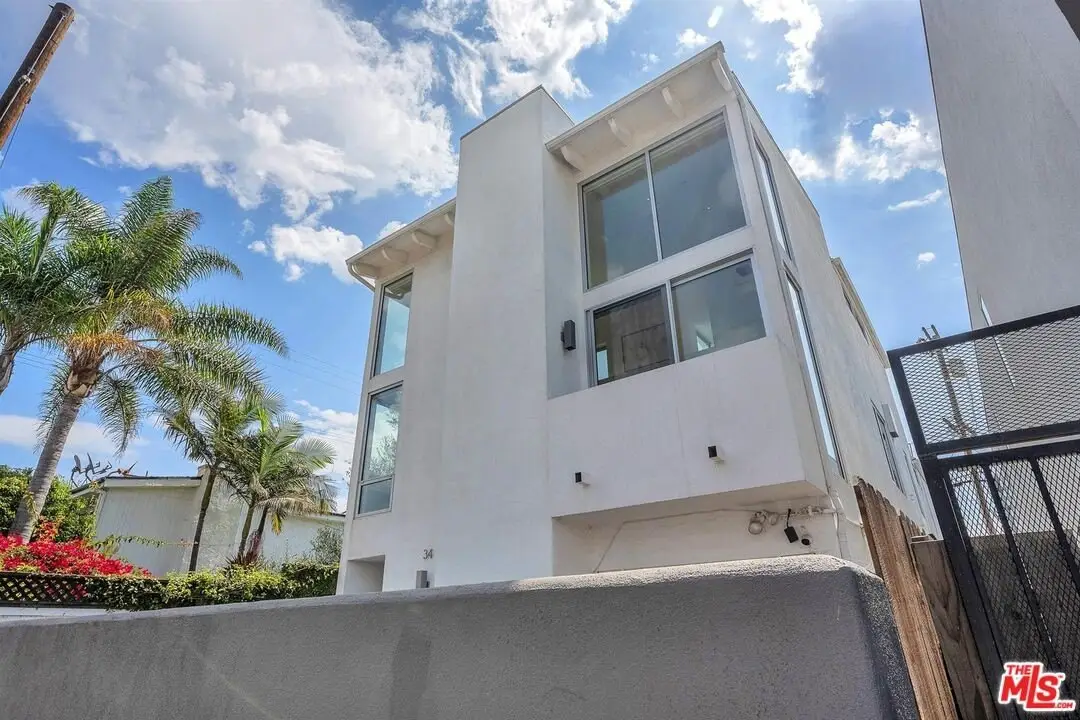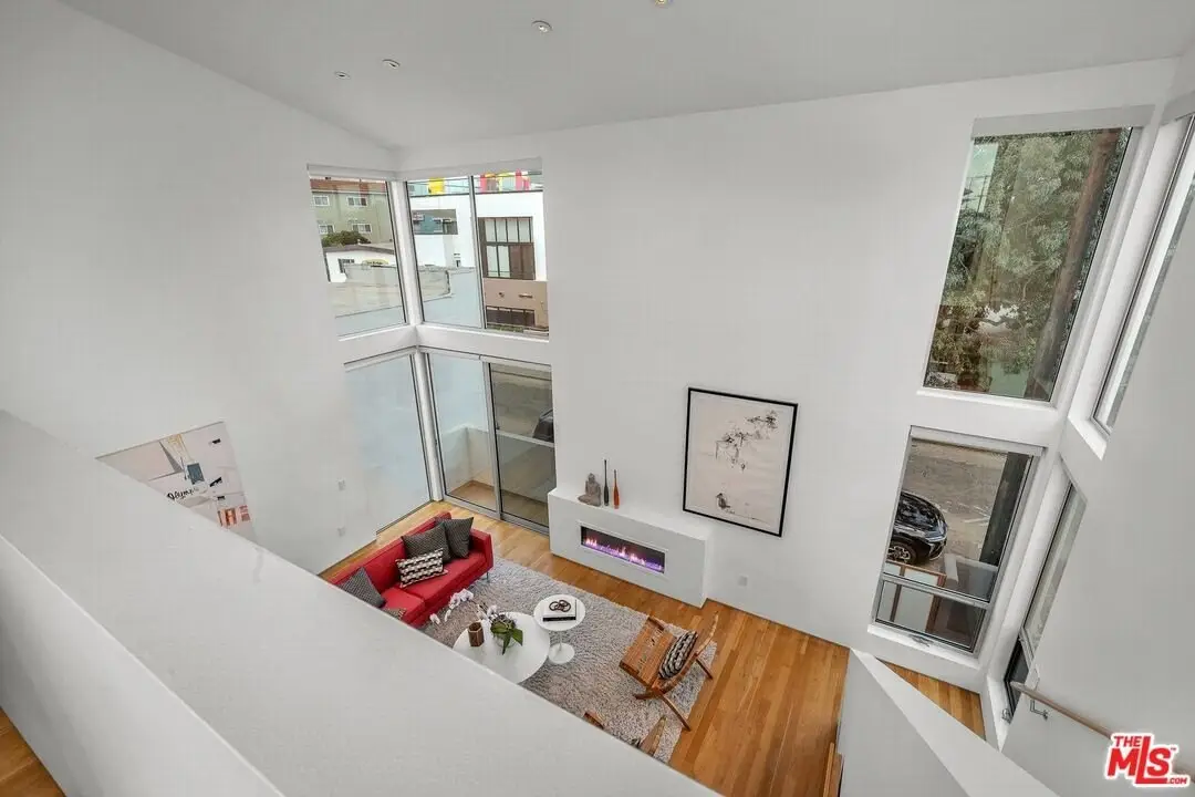 Architectural coastal home just moments to the sand, beautifully reimagined timeless design. This light-filled home balances soaring double-story ceilings with sleek, modern design for a tranquil, minimalist retreat. An open-concept floor plan and seamless indoor-outdoor flow make it perfect for entertaining or live-work loft living. It's an upper unit with no shared walls. Designer touches include a linear electric fireplace, surround sound speakers, Lutron programmable lighting, double-height windows, and top-of-the-line Arcadia sliding doors opening to a private terrace with city lights views. The custom kitchen is a chef's dream with Bosch appliances, integrated Sub-Zero refrigerator, quartz countertops, and abundant storage. The primary suite offers black-out shades, a custom walk-in closet, and a spa-like bath with dual sinks, a zero-threshold shower, and heated towel rack. Upstairs, the lofted second bedroom with built-ins is ideal for a home office or guest suite with its own full bath. Over $100,000 was spent just in custom cabinets throughout. Additional upgrades include electric Aero shades, LifeSource water filtration, tankless water heater, oak wood floors, ADT security with 3 outdoor cameras, EV charging outlet, newer HVAC, new main sewer line, and rare parking for 3 cars a true luxury by the beach. Low HOA dues. Perfectly positioned near Abbot Kinney, Main Street, and Venice Blvd, this stunning home offers the best of coastal living with world-class dining, boutiques, and the ocean just outside your door.