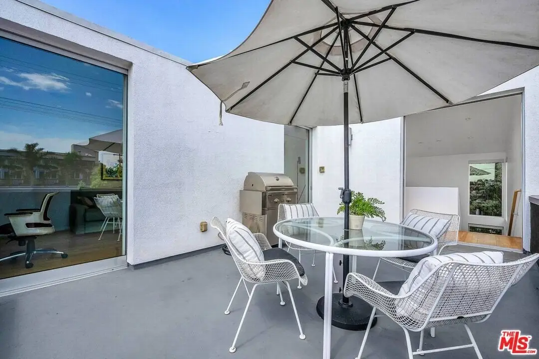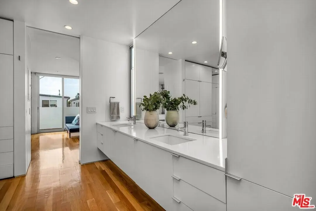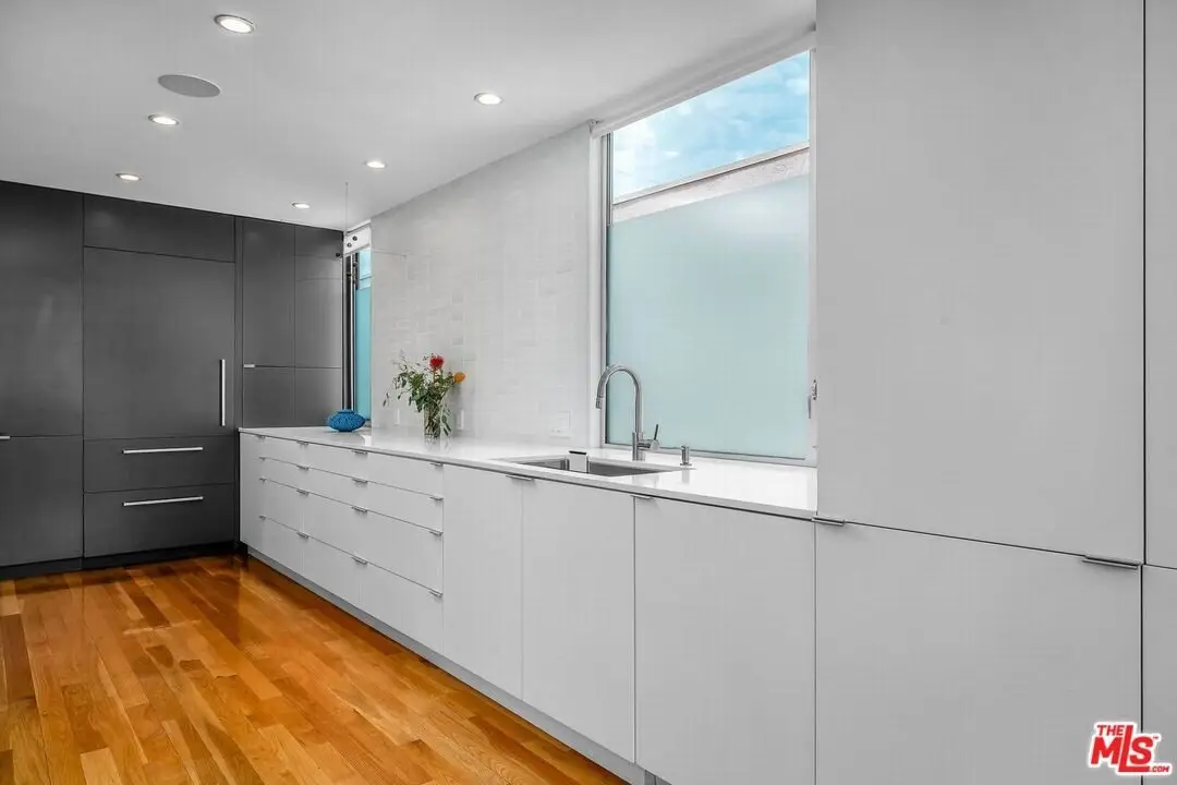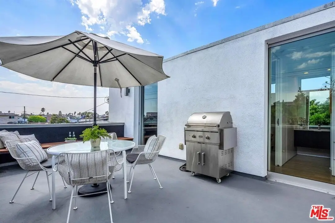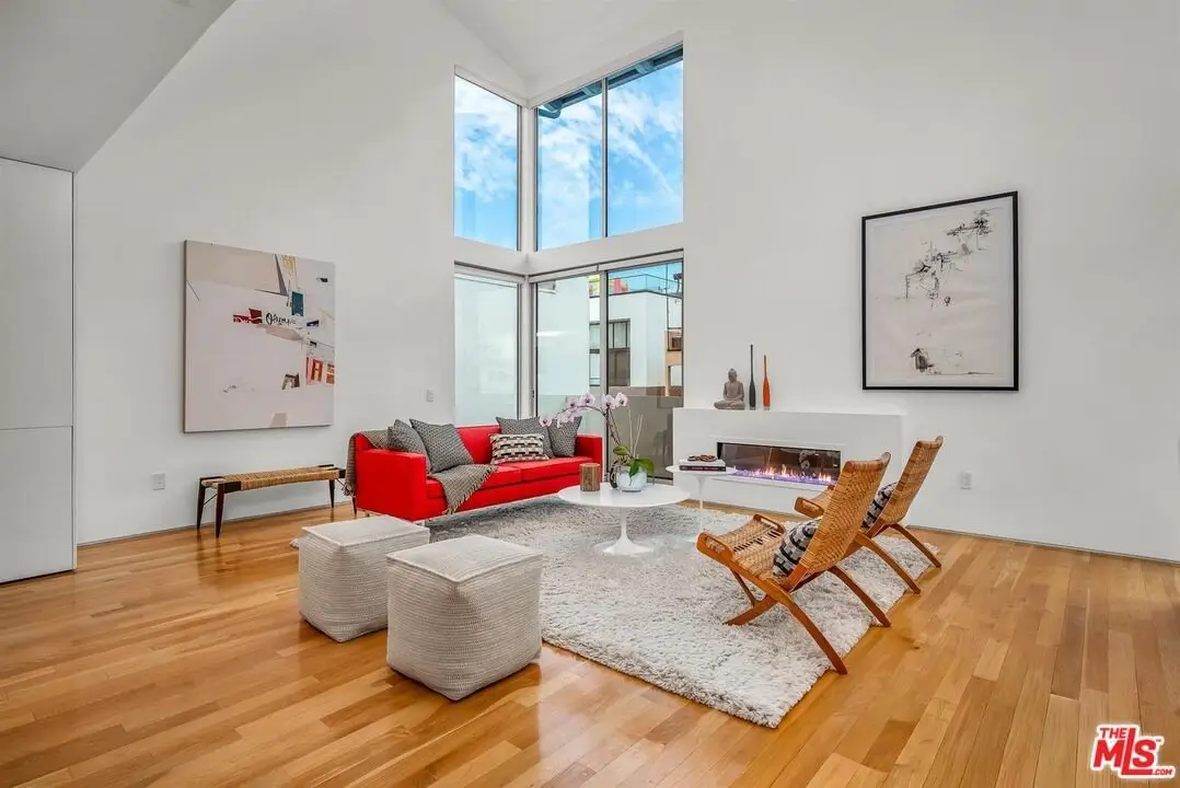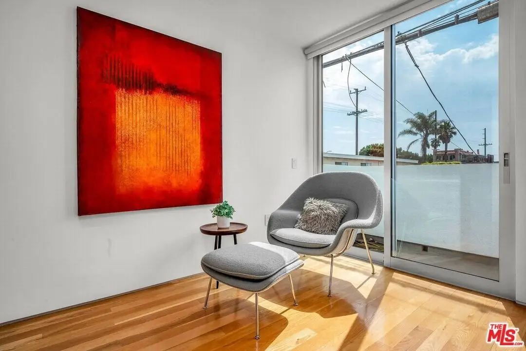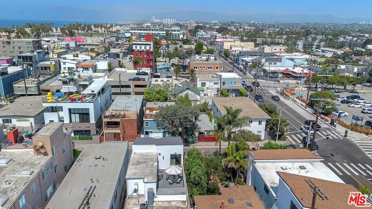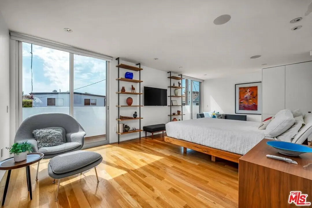 Architectural coastal home just moments to the sand, beautifully reimagined timeless design. This light-filled home balances soaring double-story ceilings with sleek, modern design for a tranquil, minimalist retreat. An open-concept floor plan and seamless indoor-outdoor flow make it perfect for entertaining or live-work loft living. It's an upper unit with no shared walls. Designer touches include a linear electric fireplace, surround sound speakers, Lutron programmable lighting, double-height windows, and top-of-the-line Arcadia sliding doors opening to a private terrace with city lights views. The custom kitchen is a chef's dream with Bosch appliances, integrated Sub-Zero refrigerator, quartz countertops, and abundant storage. The primary suite offers black-out shades, a custom walk-in closet, and a spa-like bath with dual sinks, a zero-threshold shower, and heated towel rack. Upstairs, the lofted second bedroom with built-ins is ideal for a home office or guest suite with its own full bath. Over $100,000 was spent just in custom cabinets throughout. Additional upgrades include electric Aero shades, LifeSource water filtration, tankless water heater, oak wood floors, ADT security with 3 outdoor cameras, EV charging outlet, newer HVAC, new main sewer line, and rare parking for 3 cars a true luxury by the beach. Low HOA dues. Perfectly positioned near Abbot Kinney, Main Street, and Venice Blvd, this stunning home offers the best of coastal living with world-class dining, boutiques, and the ocean just outside your door.