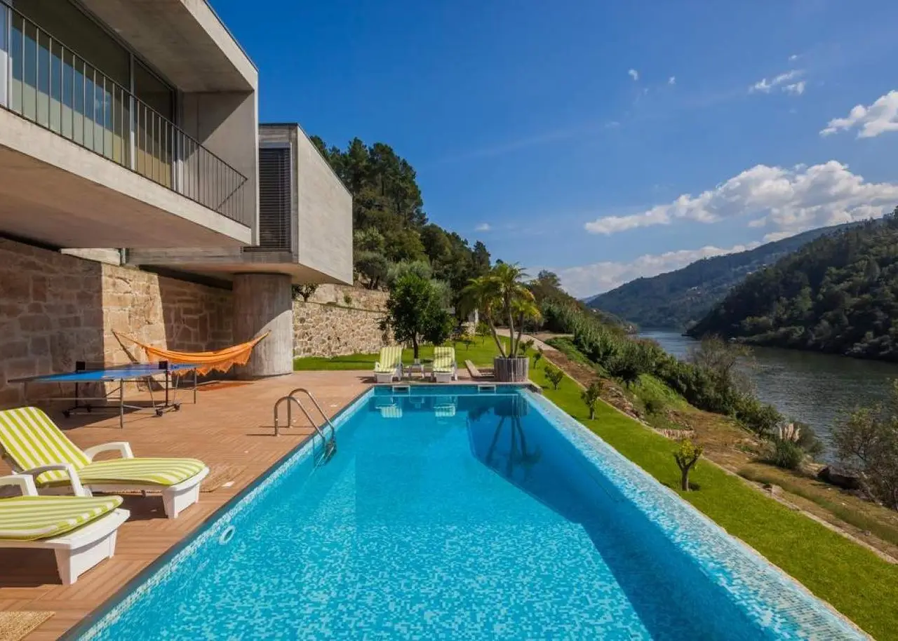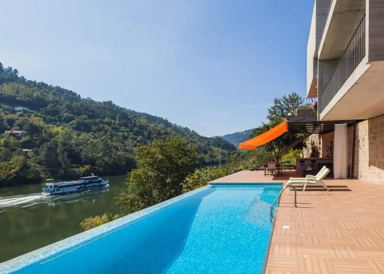 Magnificent property located in the heart of the wine region of the Douro valley with direct access to the Douro River, a world Heritage of Humanity since 2001. The house consists of four bedrooms en suite, living room, dining room and an outdoor space with swimming pool and dining area with barbecue (BBQ). All the rooms have extensive views to the river. The large living room extends to a balcony overlooking the Douro River. In addition, the property offers a guest house with living room, toilet and kitchenette. It is a house of modern architecture, thought out in detail, from the views, to the location and solar orientation, including the principles of Feng Shui. It features an infinite pool with a stunning view of the river and a spa with jacuzzi, sauna and Turkish bath. With private access to the pier and parking inside the property. This property for sale benefits from excellent access, 1h15 from the city of Porto. CHARACTERISTICS: Plot Area: 15 190 m2 | 163 504 sq ft Energy efficiency: G FEATURES: 3,820 sq ft (355 sq m) of living space; A total of seven bedrooms and eight baths; Direct river access and spectacular views; Sun exposure: North, South, East and West; Water holes; Private dock.