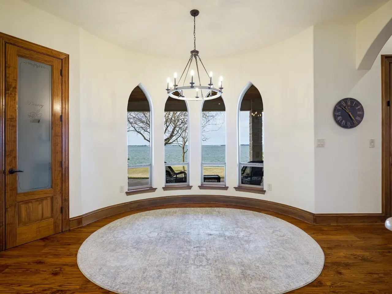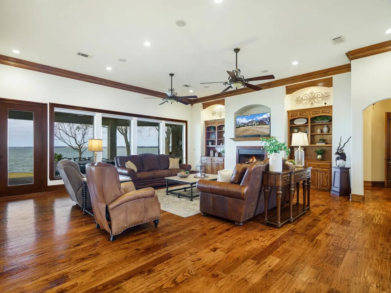 • Primary bedroom with fireplace, custom closet, and stunning lake views