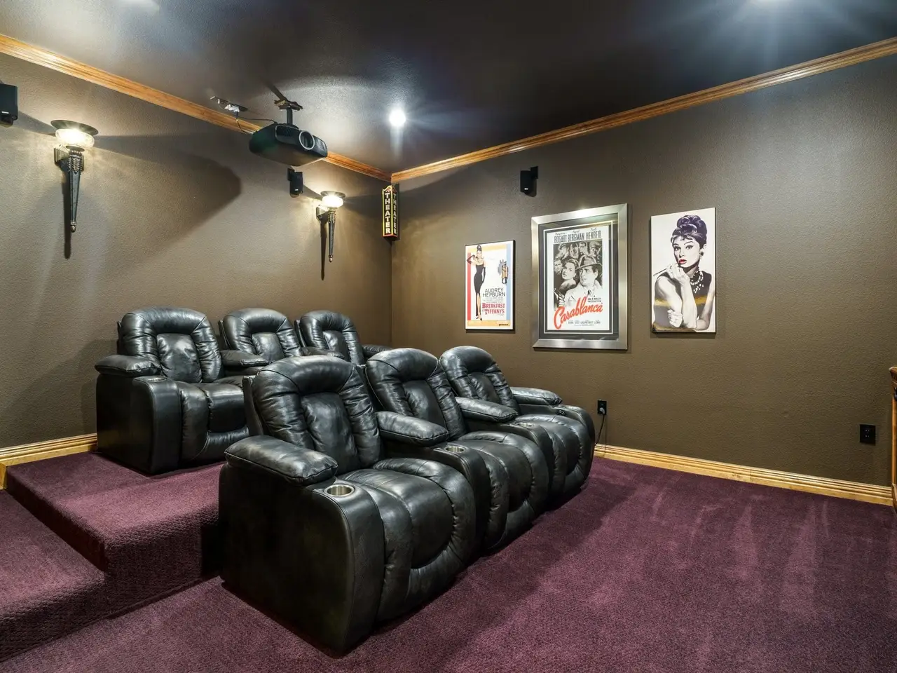 • Media room with projector, surround sound, and wine refrigerator