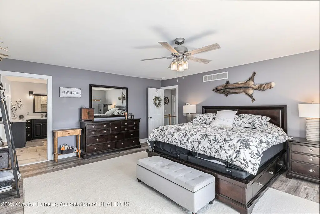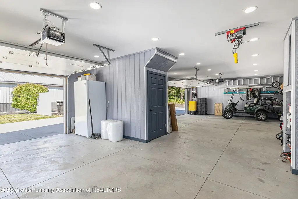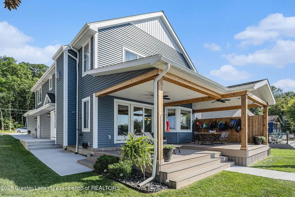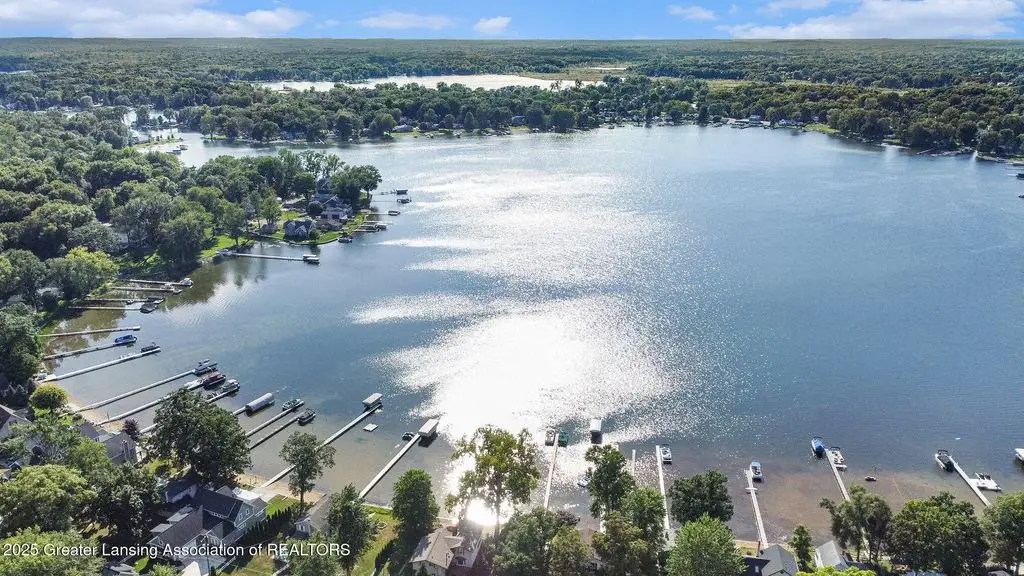 If you've been searching for a one-of-a-kind home on the Huron chain of lakes, this is it! The entire 3,216 square foot two-story home has been professionally and tastefully updated on the exterior and interior. Features five bedrooms, 3.5 bathrooms, main floor primary suite is massive with soaring ceilings, a cozy built in fireplace surrounded by shelves, a huge custom built WI closet, large bathroom w/dual sinks, tiled walk-in shower and granite countertops, complete with door to your own private covered concrete patio with recessed lighting and ceiling fan. 2nd floor features remodeled primary suite with fireplace, updated bath with dual sinks, tiled walk-in shower, closet and additional laundry area. Three additional spacious bedrooms and a full bath are located on the second level. Gorgeous kitchen with SS appliances and quartz countertops that wraps around to the spacious open dining/living room area facing the lake and new Trex deck with recessed lighting and ceiling fans. Three-car detached finished, heated garage with stairs to a loft for extra storage. All new concrete drive, (lots of parking) patio space and sidewalk to dock/lake. Within the last few years this home has had all new flooring throughout, a new roof (house and garage), new siding, new two-zoned unit furnace and air conditioning, new water heater, too many upgrades to mention. Basically a brand new home with 49 feet of lake frontage, an outdoor shower convenient for rinsing yourself or your pets after a lake day/swim. Also includes generator that is wired to run the entire house.